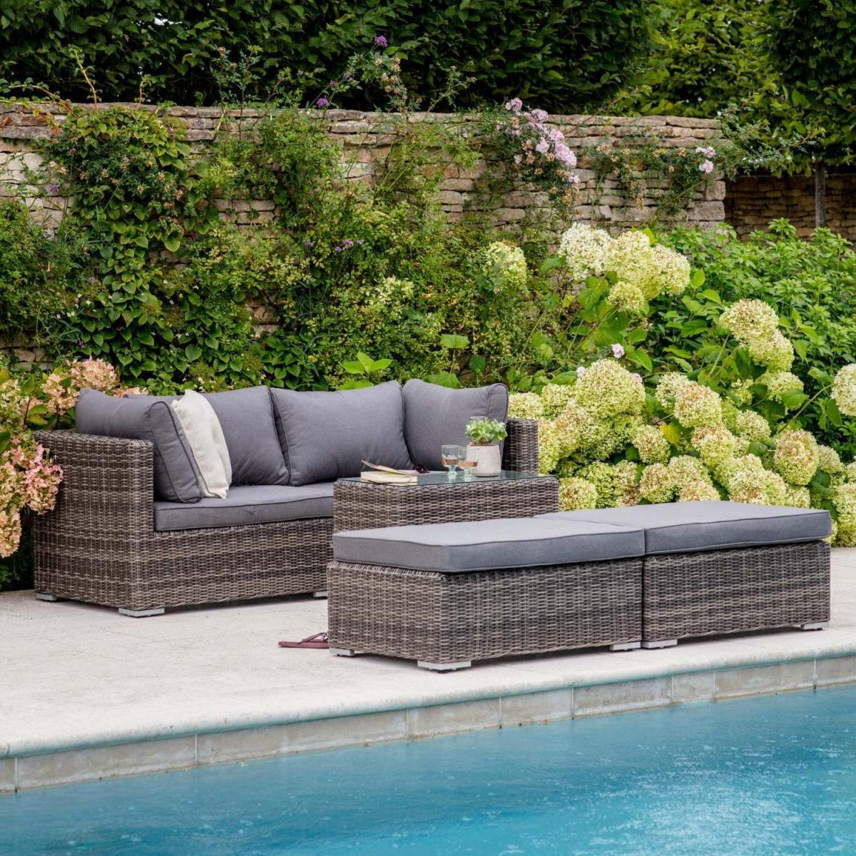 This versatile outdoor set comprises two armchairs, two ottomans and a coffee table, all crafted from weatherproofed grey-toned Rattan. Arrange the Selbourne set to be perfect for your garden, patio, or poolside space in one of many comfortable configurations; from a large sofa to matching loungers this set can be re-arranged with ease.