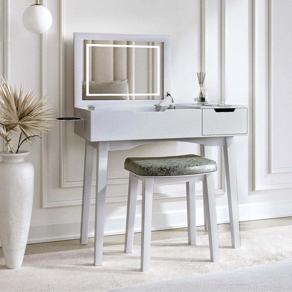 The Selena dressing table has a contemporary twist that provides great space saving solutions, simply flip the lid to activate the LED illuminated mirror and reveal eight compartments and a drawer for organising makeup and beauty essentials. Not got many plugs that are easy to reach near your dressing table, or want to avoid messy extension leads? This vanity station comes equipped with a built-in universal plug and a USB port, meaning you can charge your phone and plug in your hairdryer through your dressing table. To make hair styling and getting glam even easier there is a holder for your hair styling tools located on the side. The look even comes complete with a matching padded luxury stool.