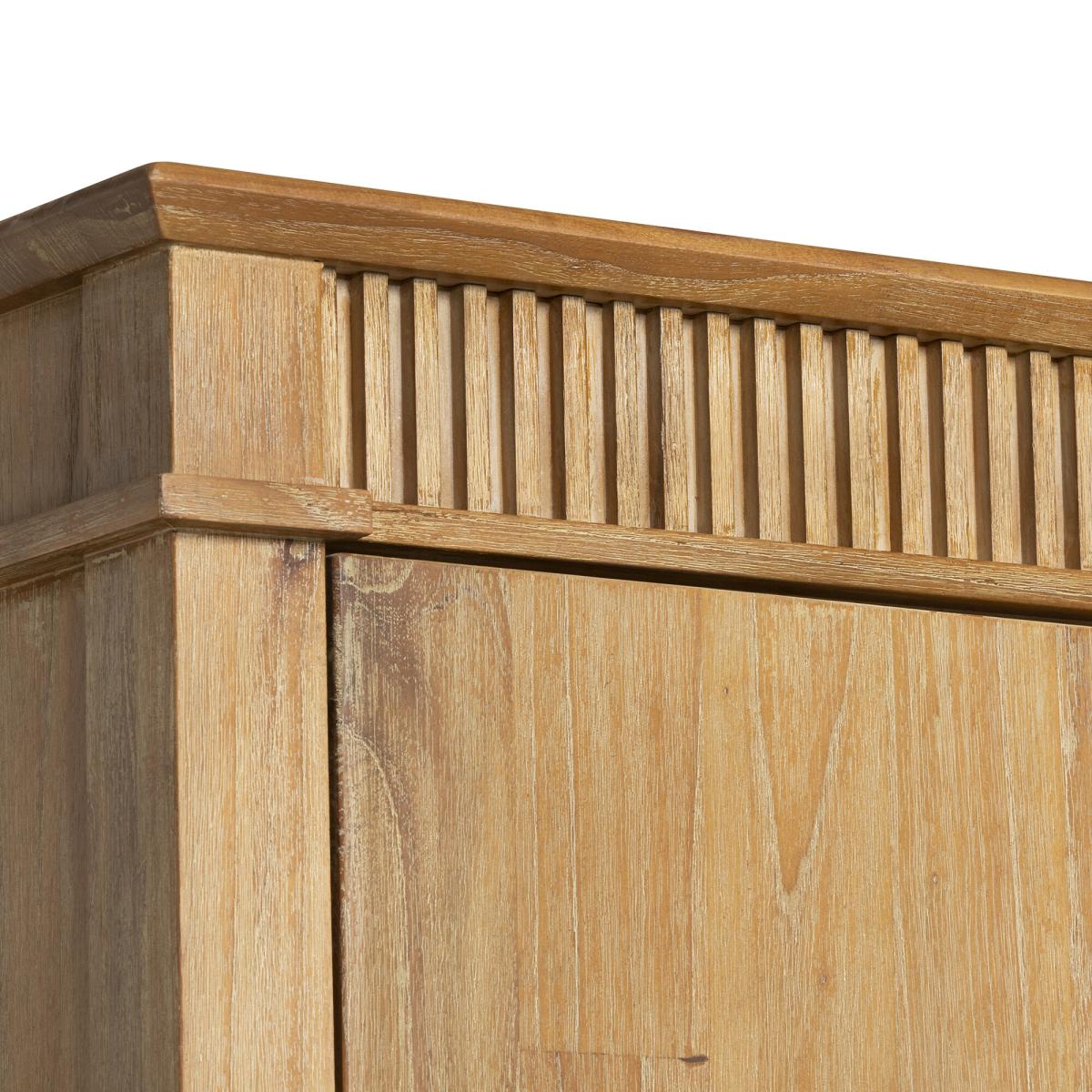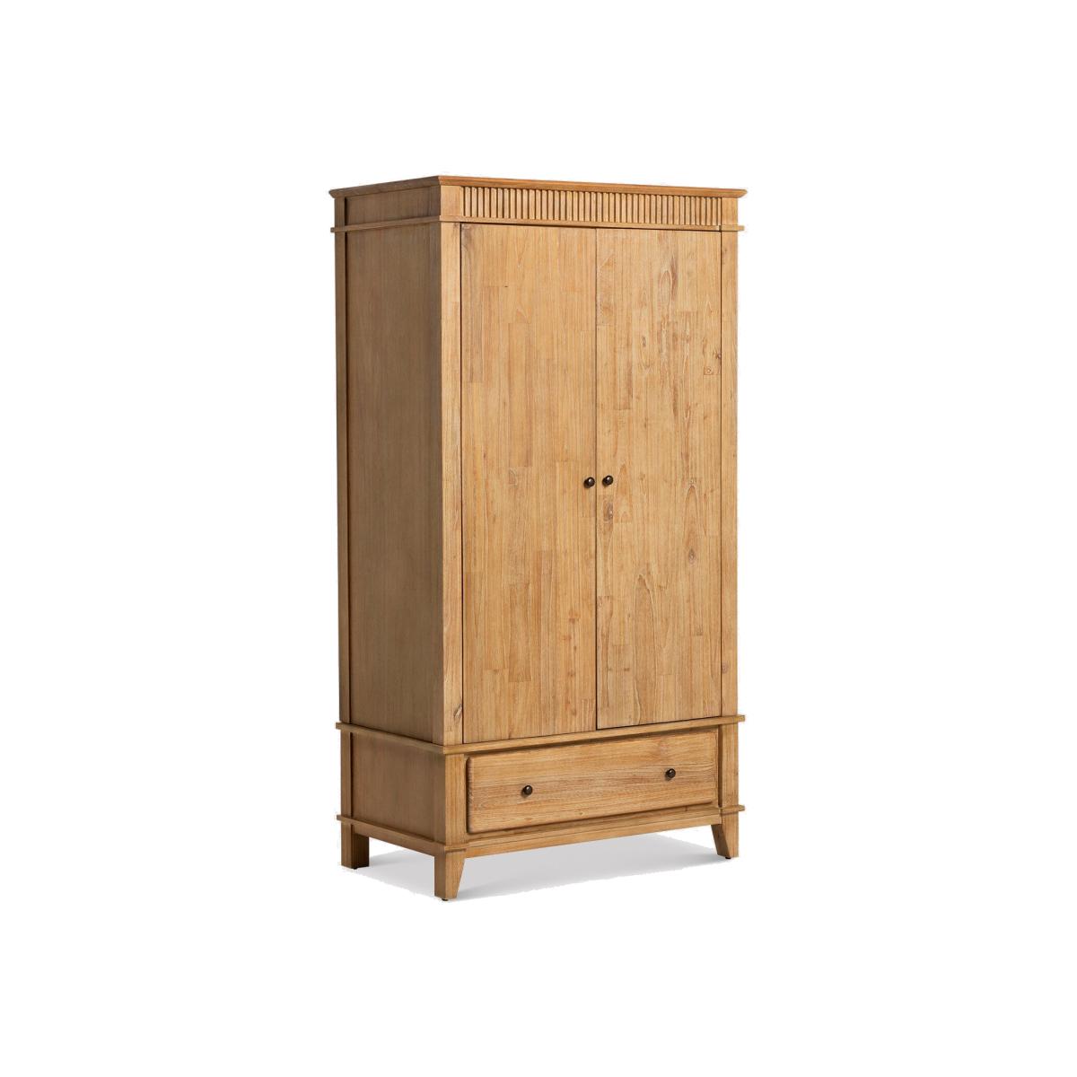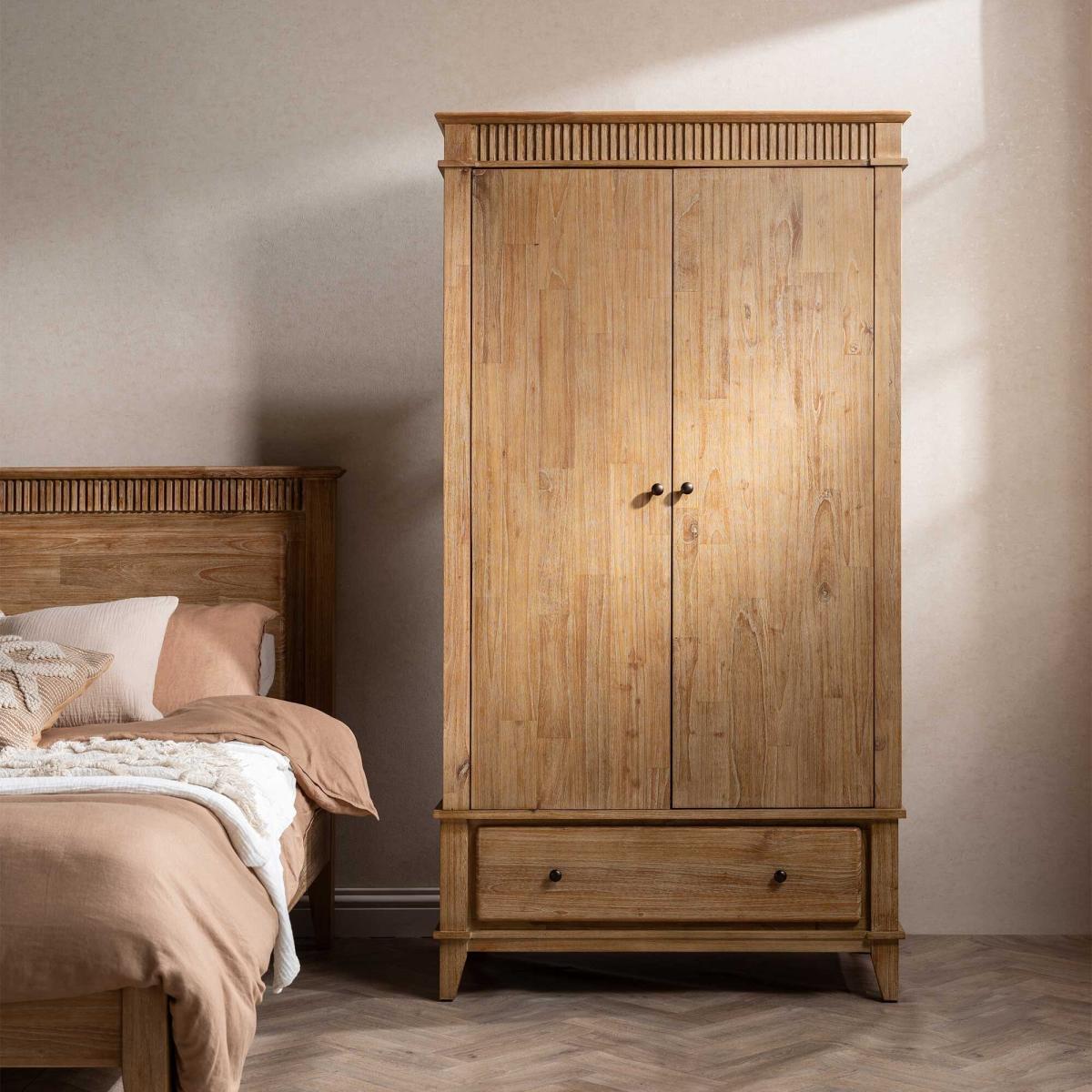 I really rate this Mindi-wood wardrobe for its clean lines and subtle fluted detailing - it brings warmth without overwhelming a space. Its neutral tone and simple brass knobs mean it sits just as well in a Scandinavian-inspired bedroom as it does in a modern country or coastal retreat. For styling, keep the top clear or add just a low plant and a couple of ceramics to emphasise its understated look. Inside, organise with matching slim wooden hangers and woven storage baskets in the lower drawer for scarves or off-season layers. Position beside a minimal bedside table or against a pale-washed wall to let the wood grain sing.