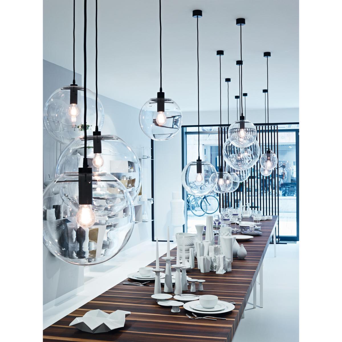Pendant lamp. Clear hand-blown glass sphere. Centrally suspended by a five-armed light head. Insect protection cover and light head in metal, black lacquered, brass-plated or copper-plated. Black fabric covered wire.