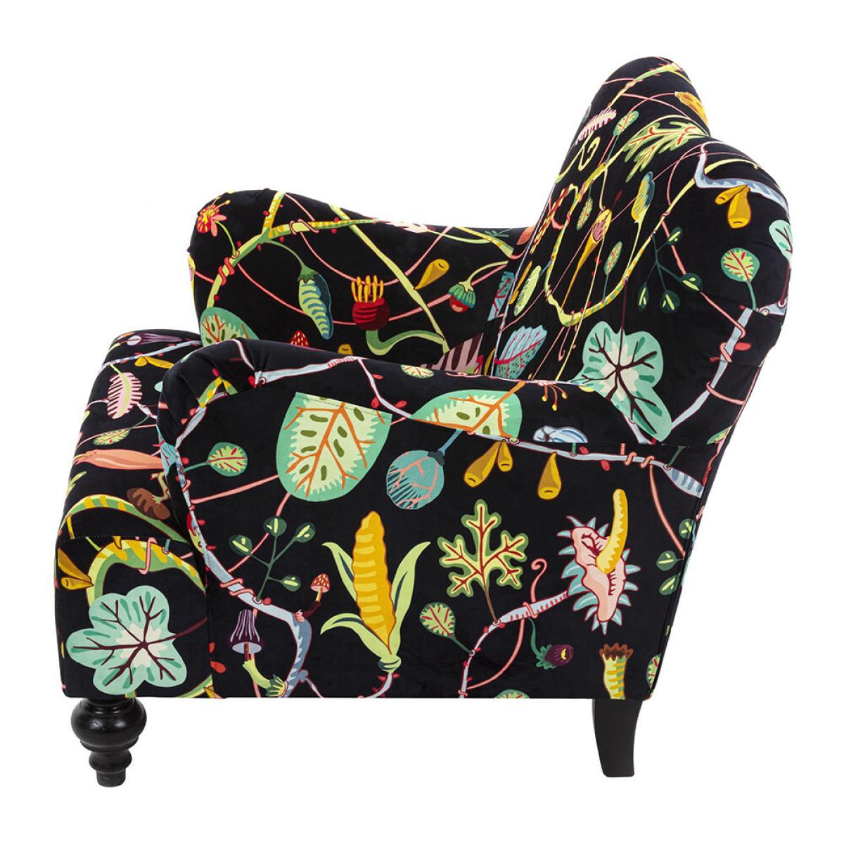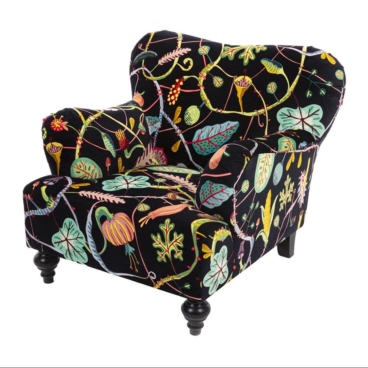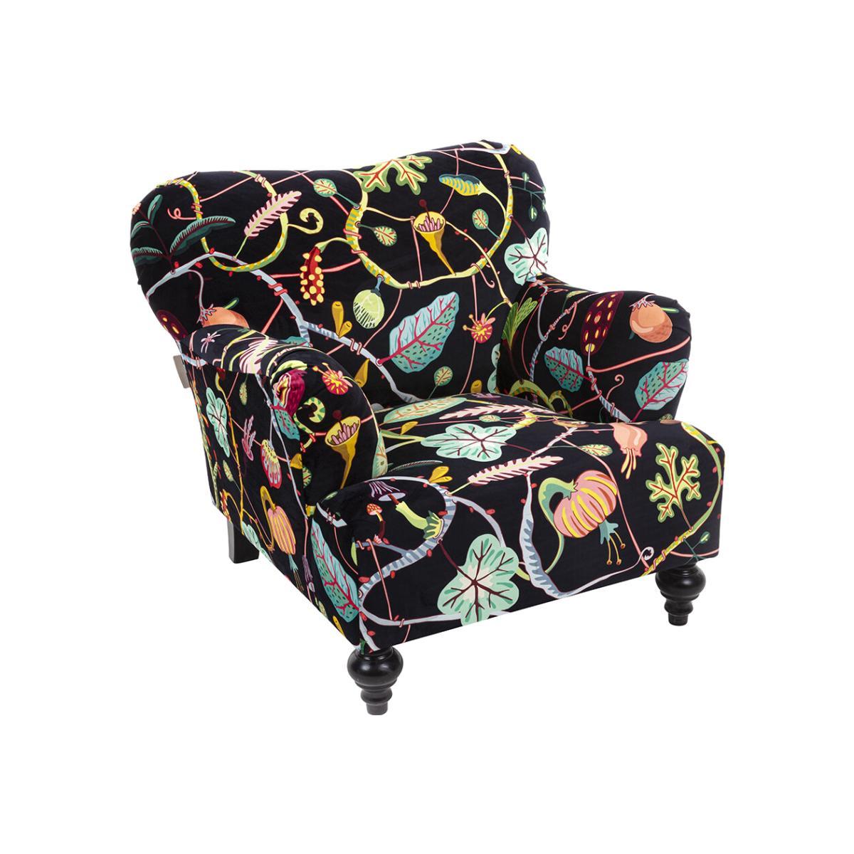 I love this chair for adding a bold, playful touch to both eclectic and modern interiors. The botanical print, set against the sleek black, makes it a versatile statement piece that can elevate a neutral living room or serve as a fun accent in a more colourful space. It works well in eclectic, boho, or even contemporary schemes where you want to introduce something unexpected. To style it effectively, consider pairing with solid-coloured cushions or surrounding it with other nature-inspired accessories to highlight its botanical theme, but keep other patterns minimal to let the armchair stand out. Its classic shape and intricate print make it a practical and stylish addition for creating a cosy reading nook or emphasising a corner of the room.