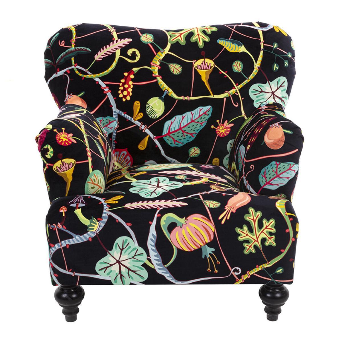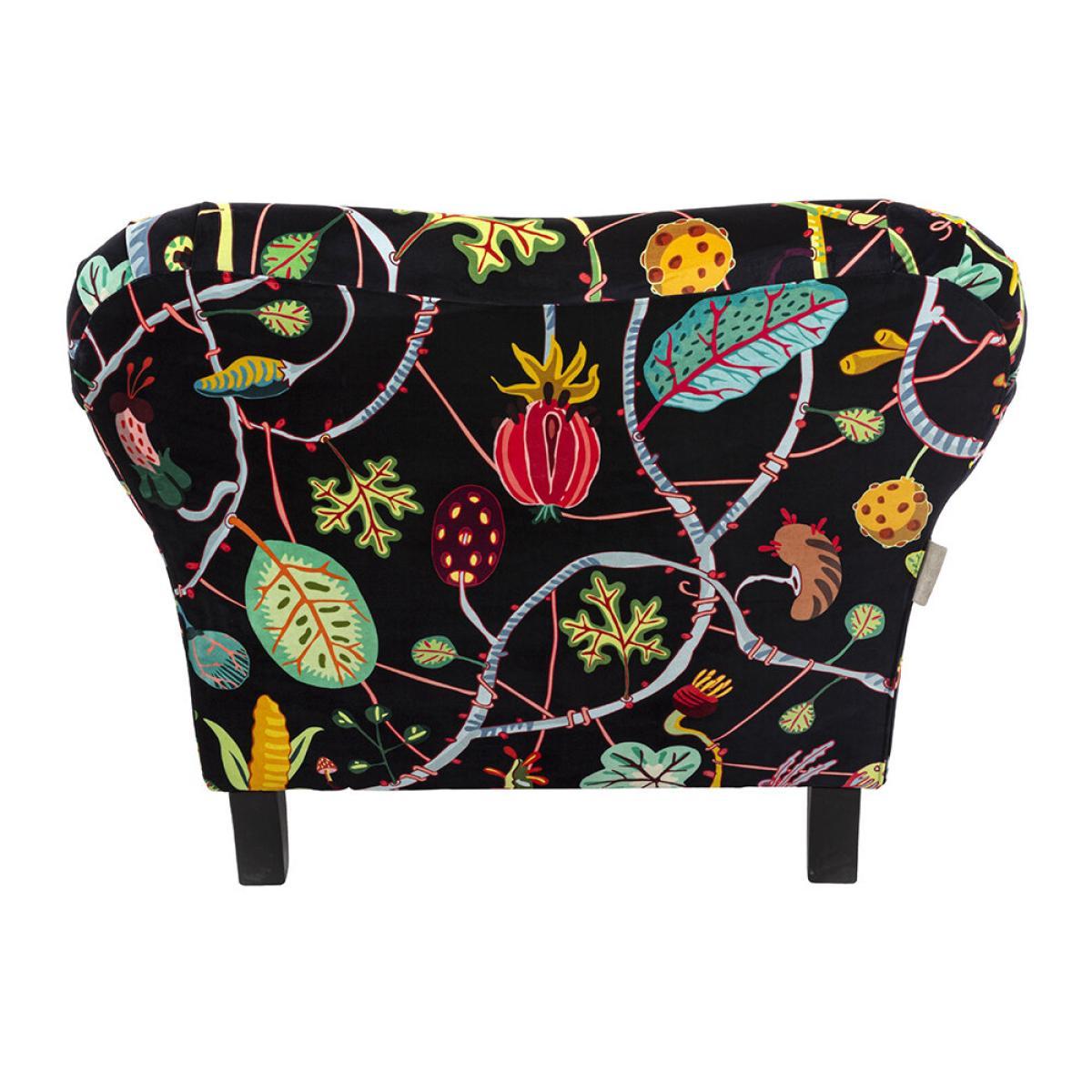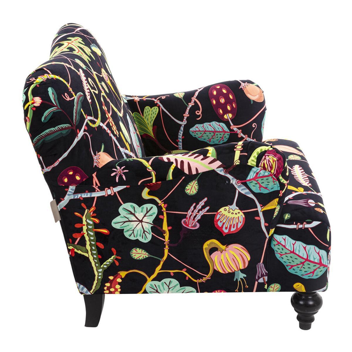 I love this chair for adding a bold, playful touch to both eclectic and modern interiors. The botanical print, set against the sleek black, makes it a versatile statement piece that can elevate a neutral living room or serve as a fun accent in a more colourful space. It works well in eclectic, boho, or even contemporary schemes where you want to introduce something unexpected. To style it effectively, consider pairing with solid-coloured cushions or surrounding it with other nature-inspired accessories to highlight its botanical theme, but keep other patterns minimal to let the armchair stand out. Its classic shape and intricate print make it a practical and stylish addition for creating a cosy reading nook or emphasising a corner of the room.