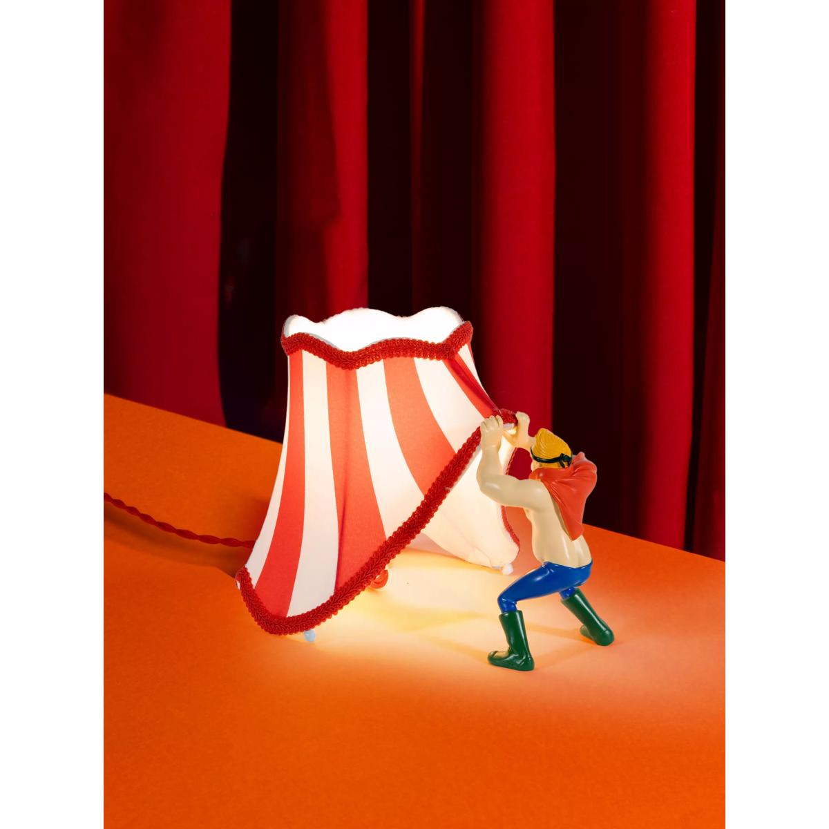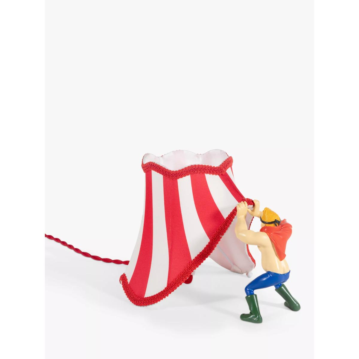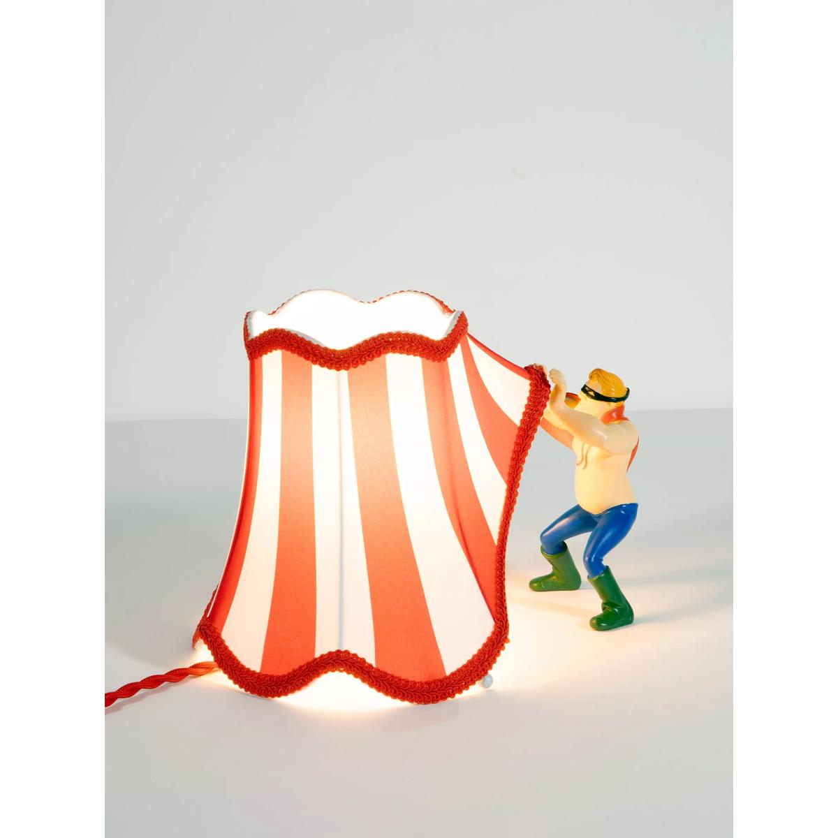 Step right up and bring the enchanting world of the circus into your space with Seletti's Abat Jour Super Jimmy Table Lamp. Featuring characterful Super Jimmy from the circus realm, showing off his strength as he leads the way into a striped circus marquee, the red and white lampshade. Includes a braided red cable.