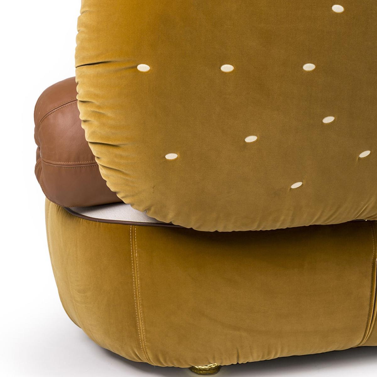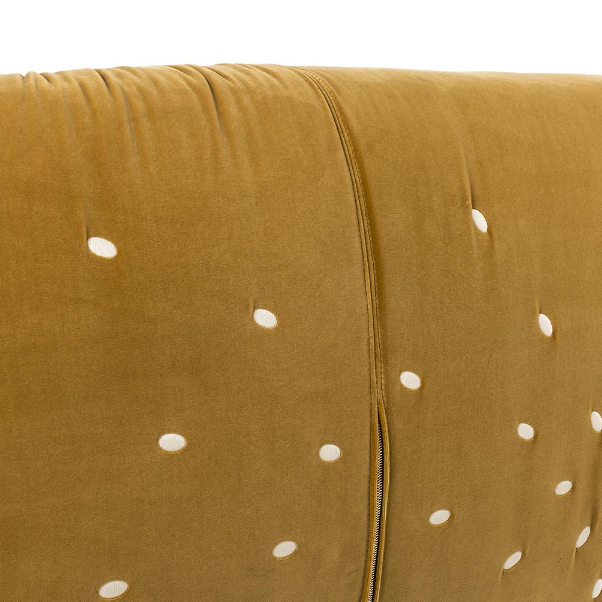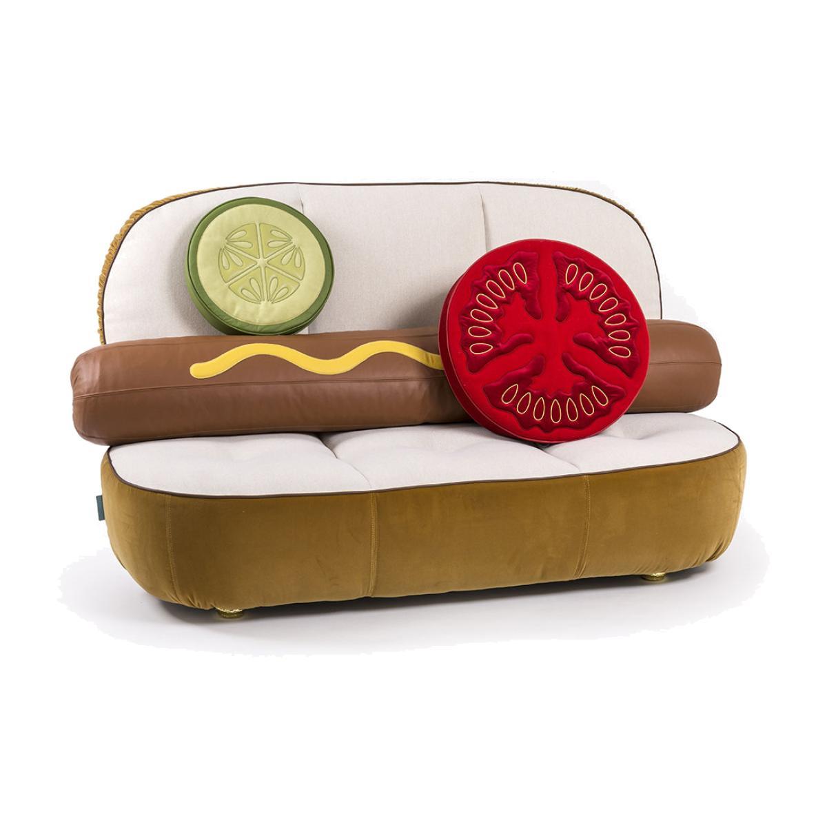 Colourful, crazy and full of wit and whimsy. The hotdog sofa from Seletti reimagines an American pop culture icon into a fabulous piece of fast food furniture. Upholstered in cotton, viscose, acrylic and linen, it comes with tomato and cucumber cushions included, with gold-plated resin feet completing the look.