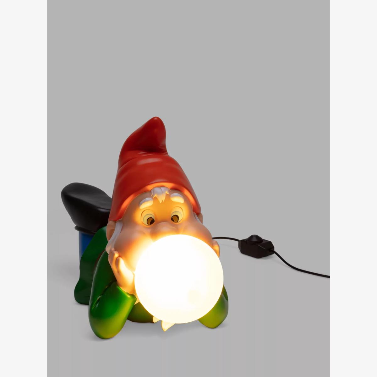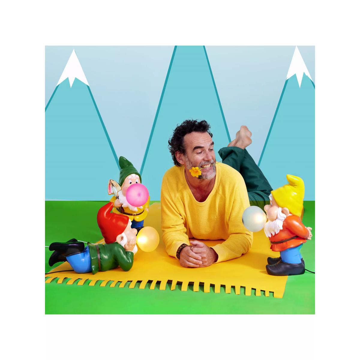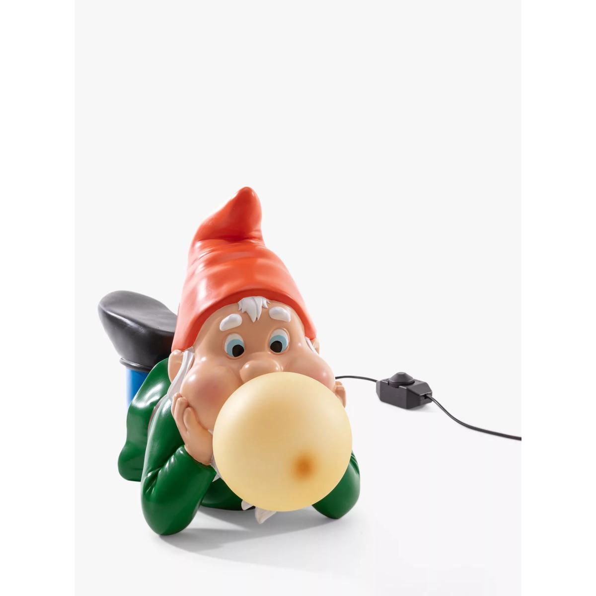 Part of a range of lighting featuring oversized gnomes, blowing giant bubble gum bubbles by Uto Balmoral for Seletti. Made from resin and painted in bright colours, with long beards and black clogs, they would be a delightful addition to any home.