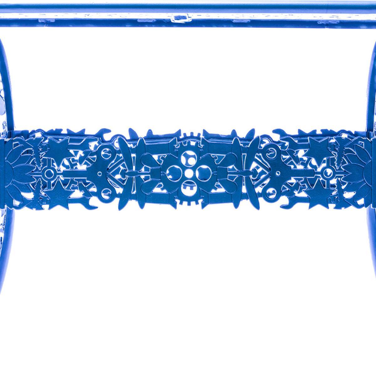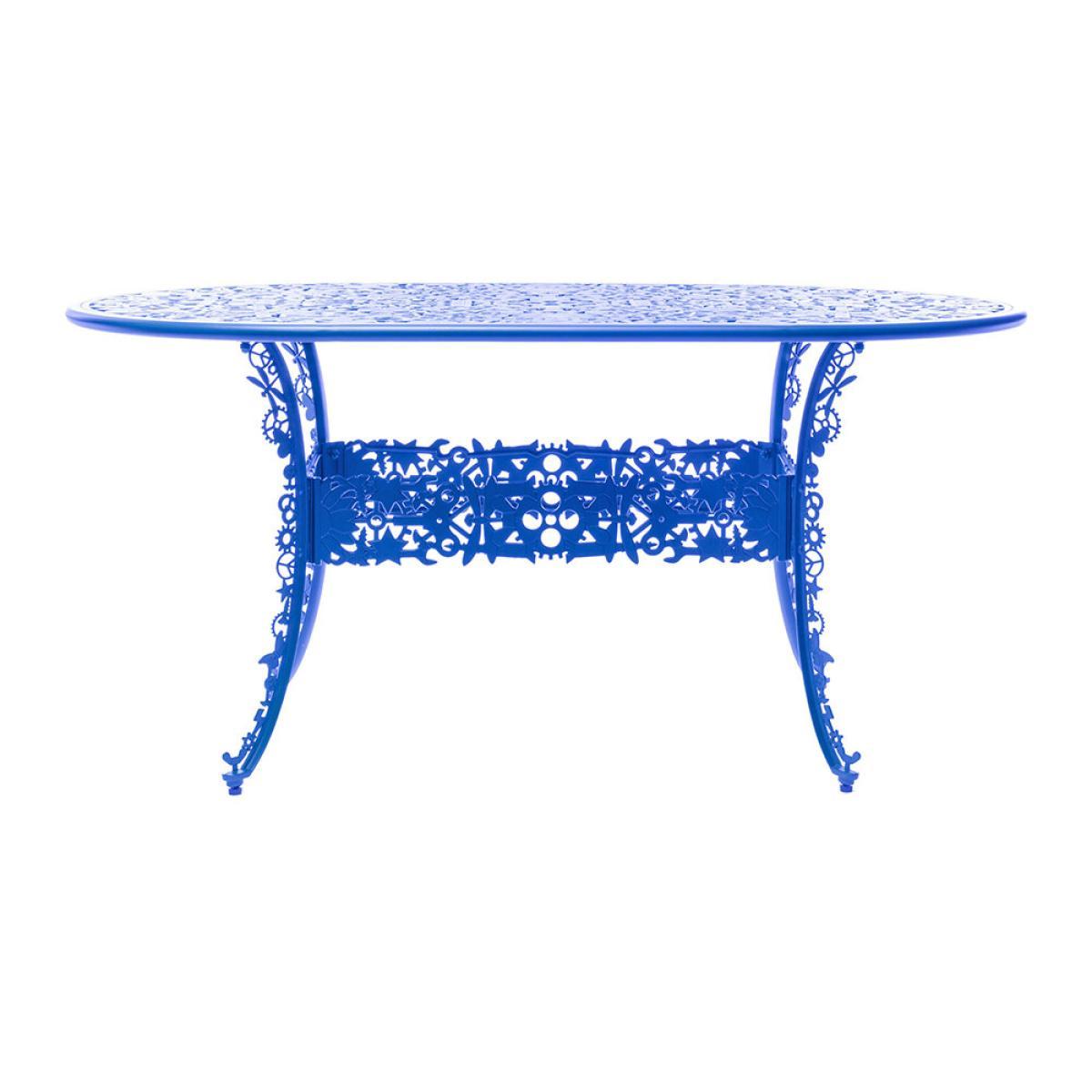 Transform your outdoor dining area with this oval table from Seletti. Crafted from aluminium with a matt powder coating finish, it features a beautifully intricate laser-cut design, reminiscent of classic Victorian style. Available in three colours, it is a wonderful piece for intimate alfresco gathering. Key features: * Material: powder coated aluminium * Dimensions: Ø152x90cm, H74cm * Bright blue colour * Laser-cut design * Assembly required * Suitable for indoor and outdoor use