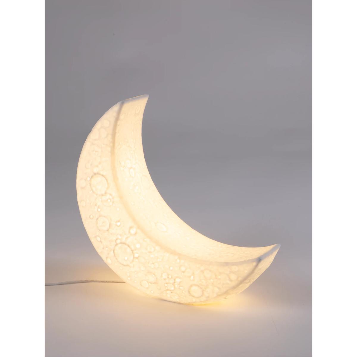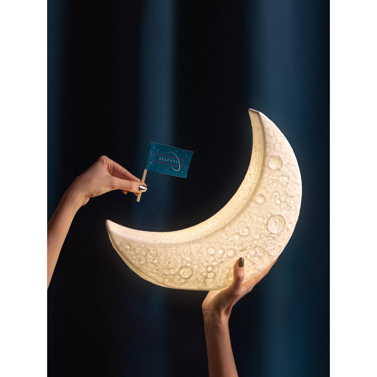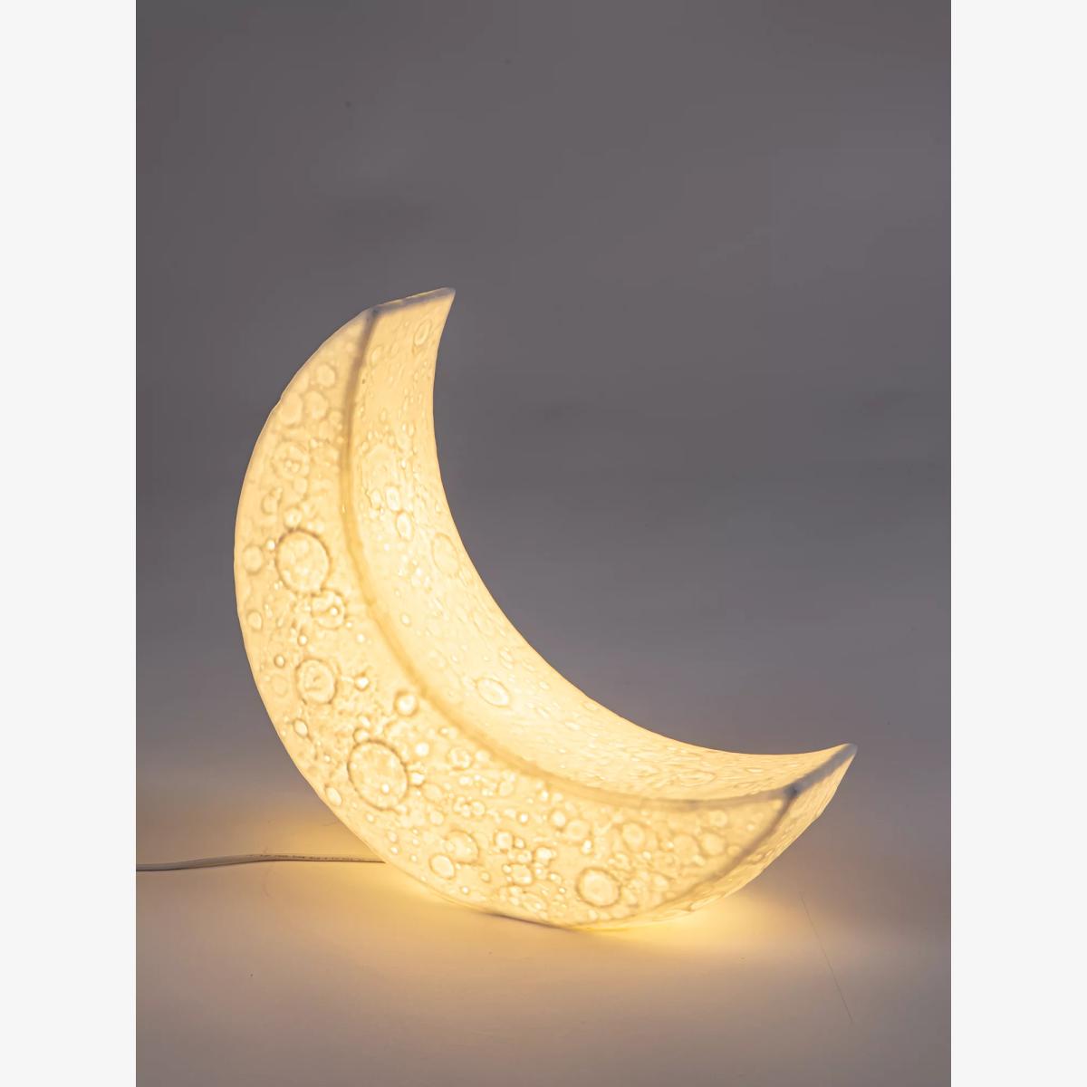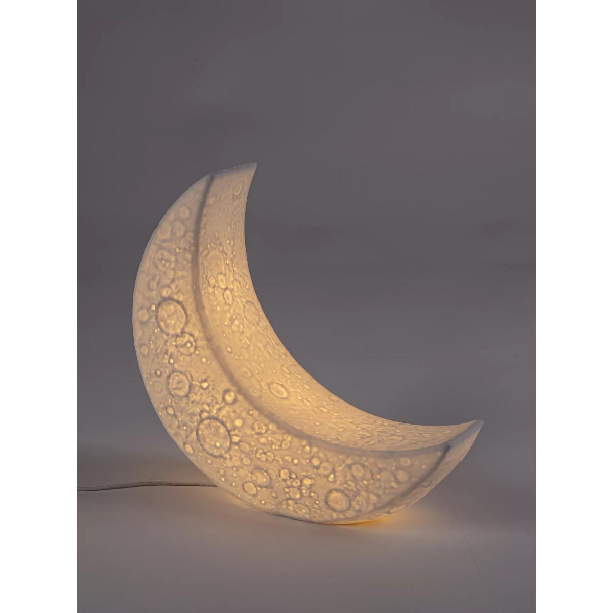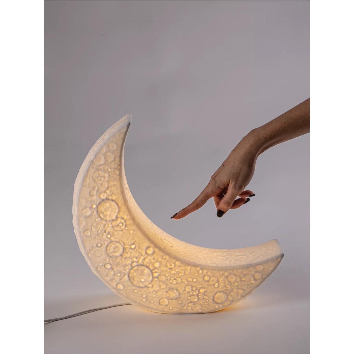 The My Tiny Moon table lamp designed by Marcantonio is made from textured white porcelain and diffuses warm lighting, like the stars at night, it illuminates your evenings with its soft, sensual light.
