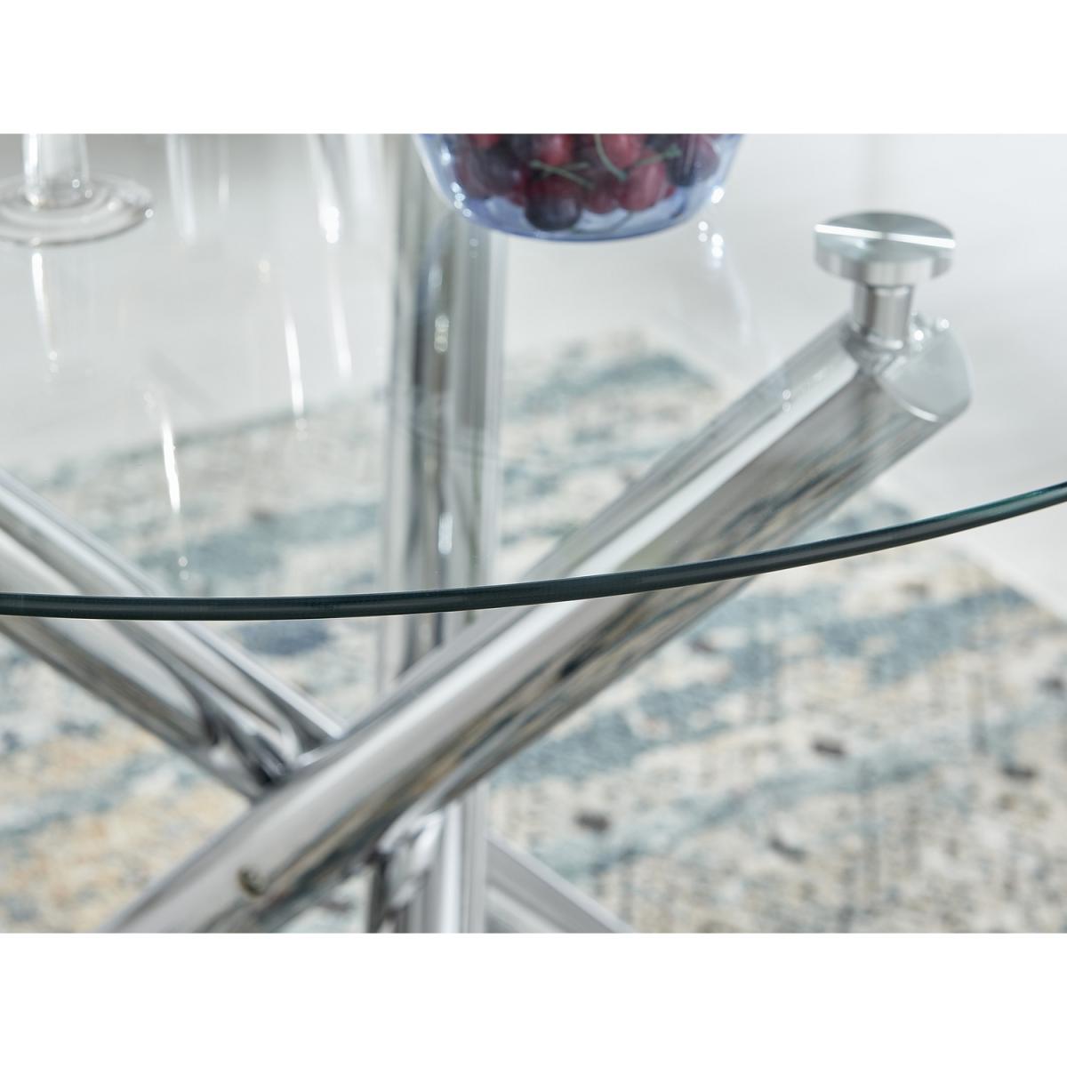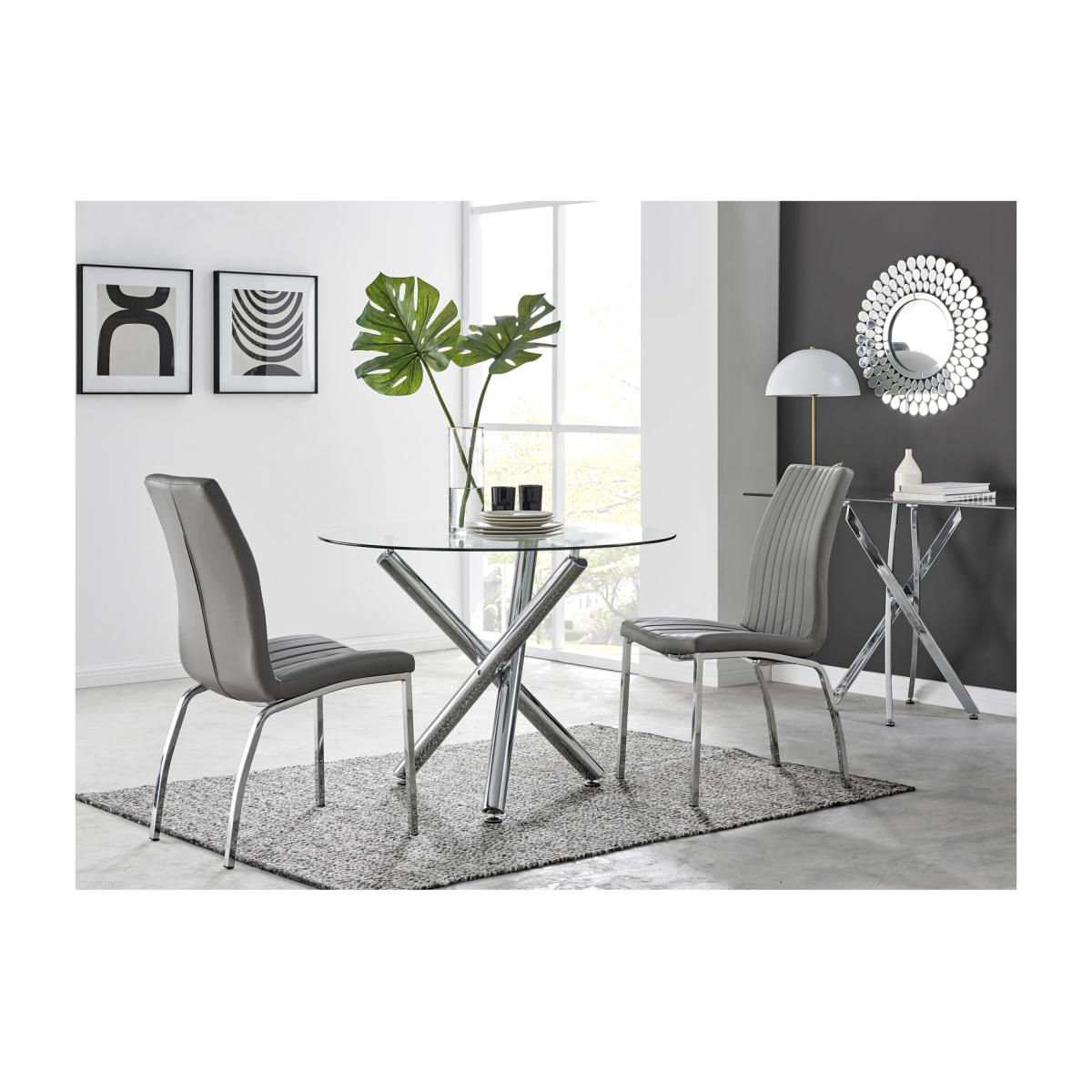 The strikingly elegant Selina dining table is a stylish and modern combination of chrome and glass, making this set a real eye-catcher. The cylindrical chrome metal legs provide strong and sturdy support for the table, whilst the unique intertwined nest design exudes modern style. This 2 seater table and chairs are ideal as a space-saving dining table for apartments and smaller homes. The round glass dining table has plenty of space for the two of you to enjoy dinner together and the two dining chairs will take up minimal space in your home. Boasting a 100x100cm surface there is room to dine with up to 4 guests. Coupled with our Isco chrome and faux leather dining chairs clean lines combined with comfort and texture make them a perfect match to complete this dining set. The soft-touch faux leather seat pads are interspaced with vertical stitching and are designed for comfort with the bonus of looking great. Value for money with style combine to make an unbeatable package!