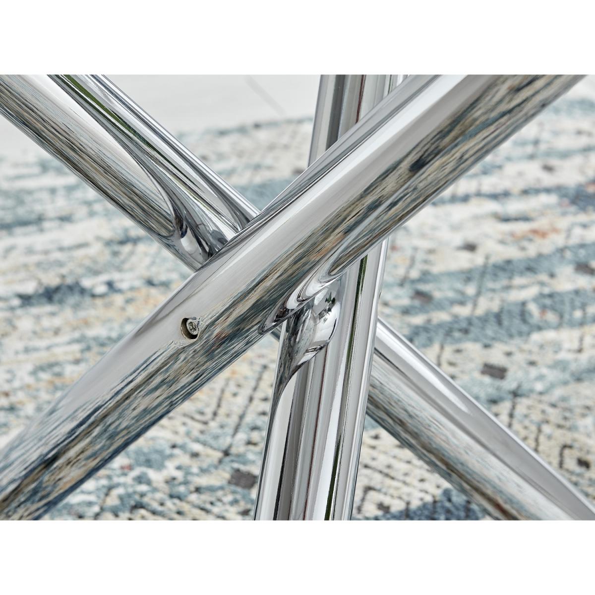 The strikingly elegant Selina dining table is a stylish and modern combination of chrome and glass, making this set a real eye-catcher. The cylindrical chrome metal legs provide strong and sturdy support for the table, whilst the unique intertwined nest design exudes modern style. This table really is capable of being a centrepiece in any home! Boasting a 100x100cm surface there is room to dine with up to 4 guests. Modernise your dining area with our luxurious velvet upholstered Pesaro Dining Chairs.