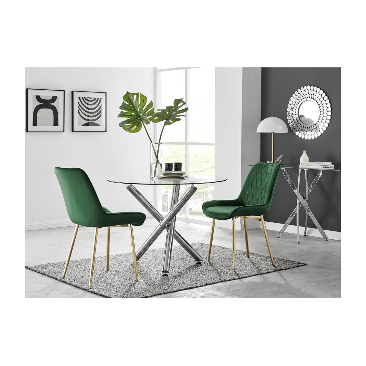 The strikingly elegant Selina dining table is a stylish and modern combination of chrome and glass, making this set a real eye-catcher. The cylindrical chrome metal legs provide strong and sturdy support for the table, whilst the unique intertwined nest design exudes modern style. This table really is capable of being a centrepiece in any home! Boasting a 100x100cm surface there is room to dine with up to 4 guests. Modernise your dining area with our luxurious velvet upholstered Pesaro Dining Chairs. With a nod to the Mid-century modern design era, the Pesaro features gorgeous textured diamond stitching with an ergonomically designed curved seat pad blending seamlessly with the supporting medium-high backrest.