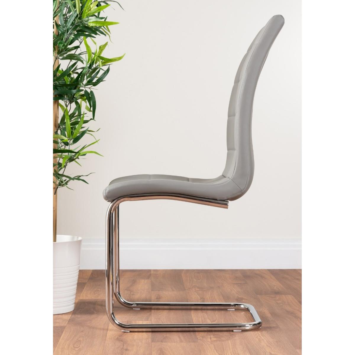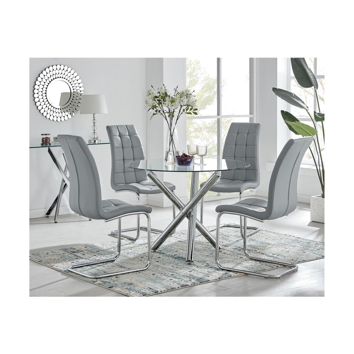 The strikingly elegant Selina dining table is a stylish and modern combination of chrome and glass, making this set a real eye-catcher. The cylindrical chrome metal legs provide strong and sturdy support for the table, whilst the unique intertwined nest design exudes modern style. This table is capable of being a centrepiece in any home! Boasting a 100x100cm surface there is room to dine with up to 4 guests. Finished with our stylish cantilever Murano dining chairs, this set offers maximum comfort and elegance that will never go out of fashion! The Murano chairs feature an eye-catching hatched deep foam single-piece seat pad and lumbar supporting backrest, making it a delight to sit on. With the chrome finish cantilevered base, the Murano is a perfect match to complete this dining set.
