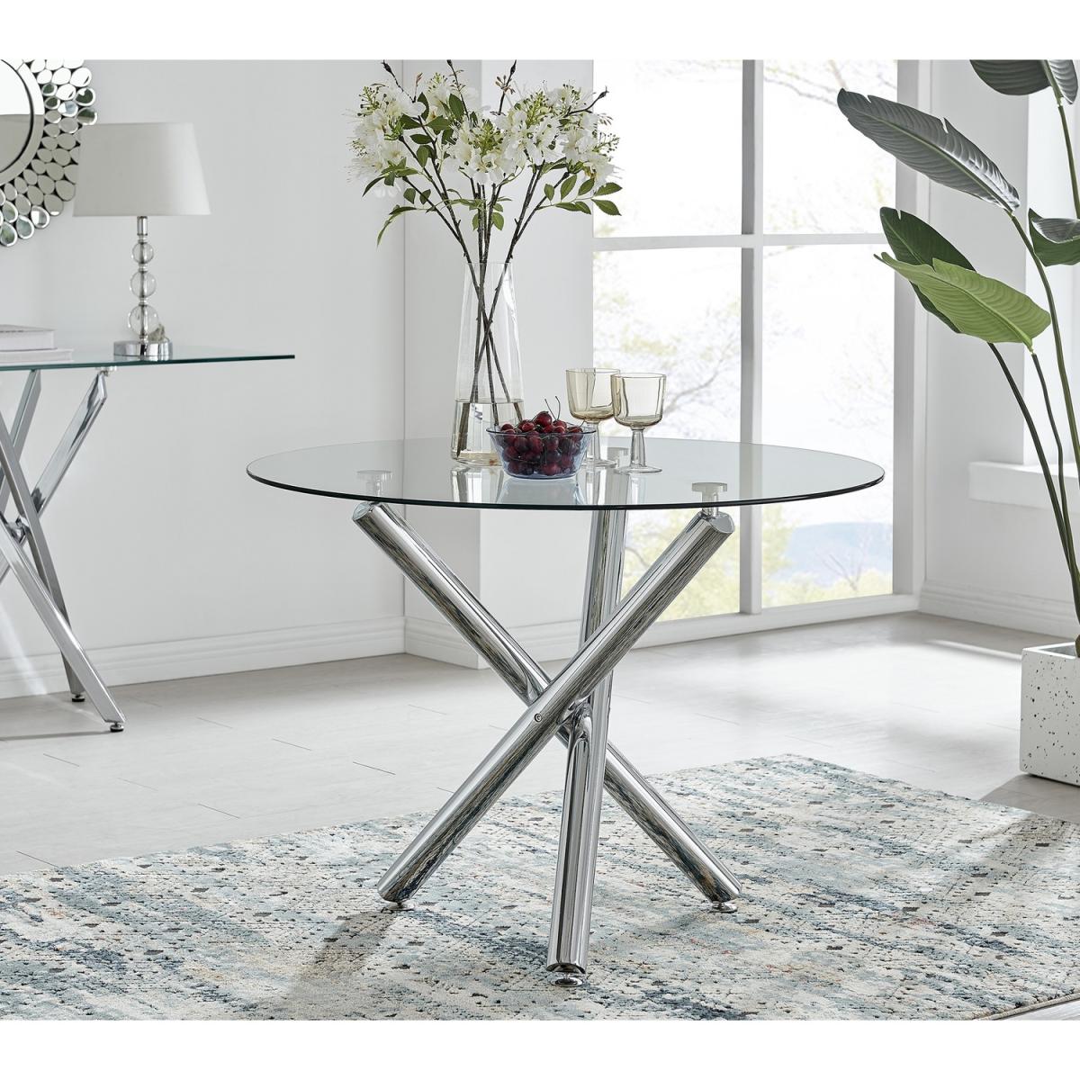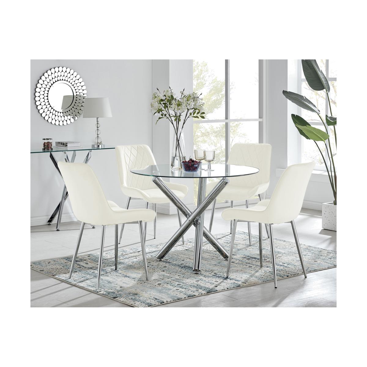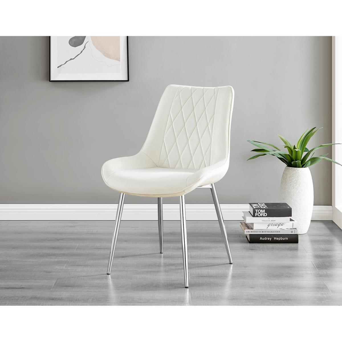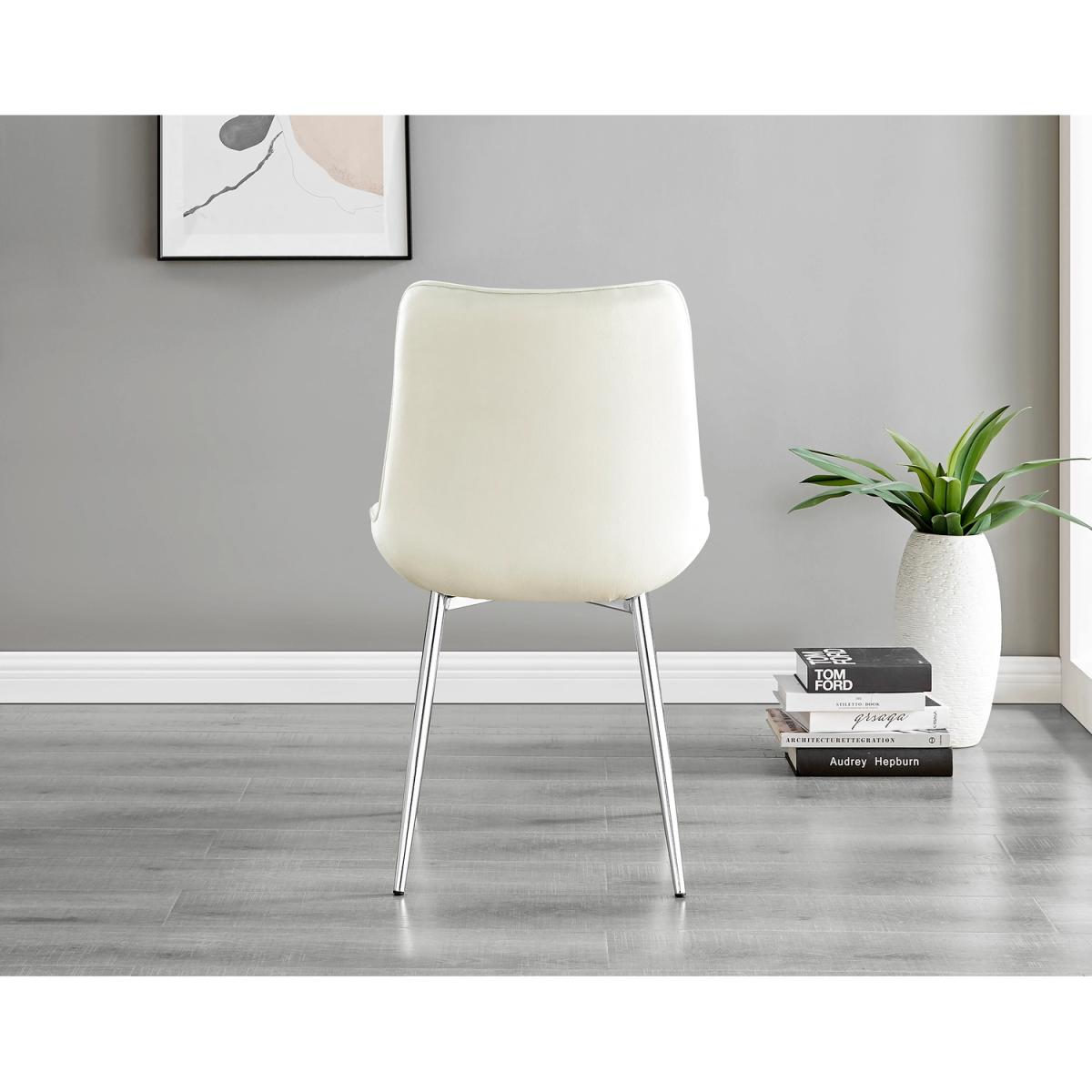 The strikingly elegant Selina dining table is a stylish and modern combination of chrome and glass, making this set a real eye-catcher. The cylindrical chrome metal legs provide strong and sturdy support for the table, whilst the unique intertwined nest design exudes modern style. This table is capable of being a centrepiece in any home! Boasting a 100x100cm surface there is room to dine with up to 4 guests. Modernise your dining area with our luxurious velvet upholstered Pesaro Dining Chairs. With a nod to the Mid-century modern design era, the Pesaro features gorgeous textured diamond stitching with an ergonomically designed curved seat pad blending seamlessly with the supporting medium-high backrest. Sat atop elegant slightly tapered legs in black, chrome or gold effect. The Pesaro is a perfect match for any dining table or used as a luxe vanity seat in the bedroom, as an occasional chair for the living area or to add a bit of luxury to your home office.