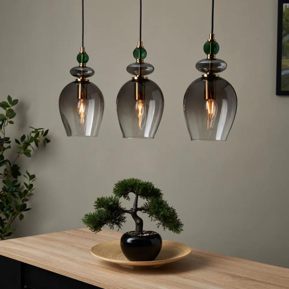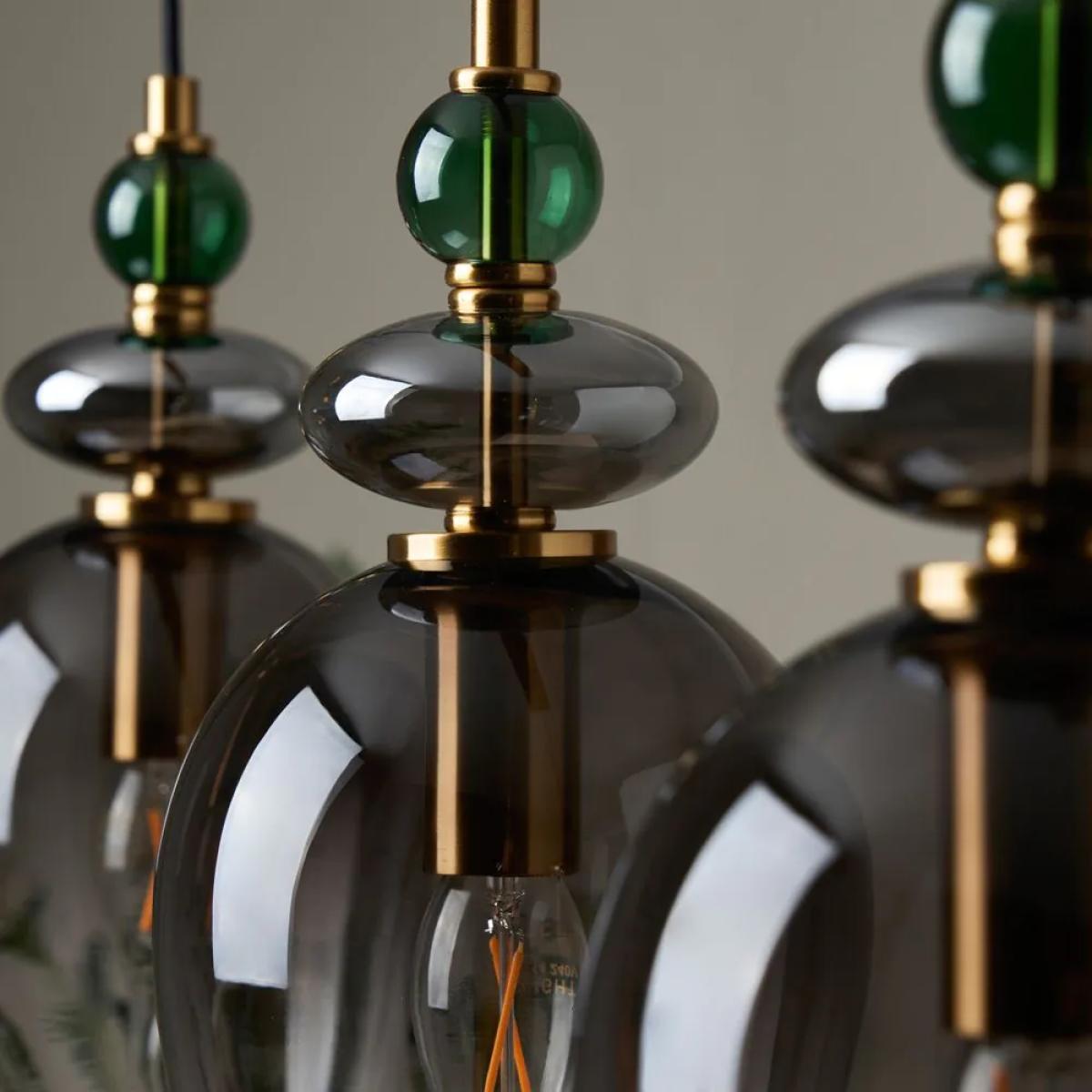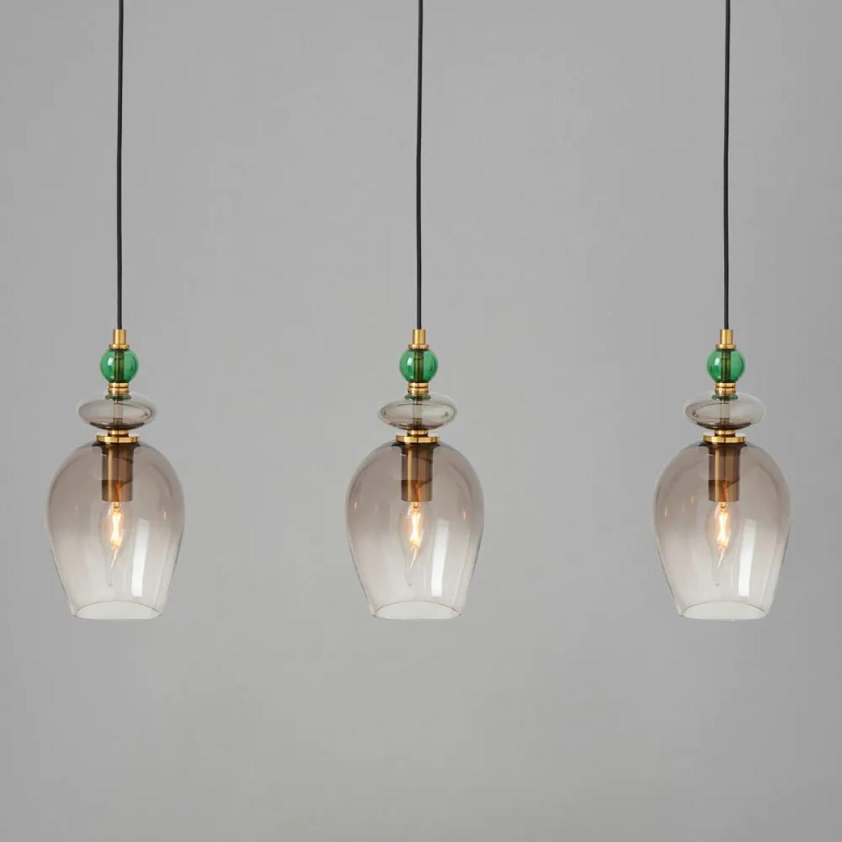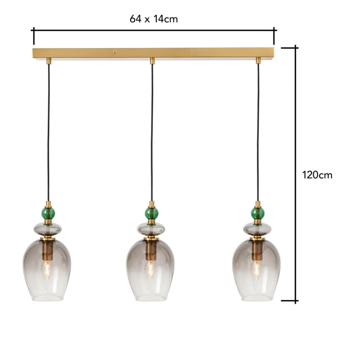 Make a statement in your dining area with the Seline Green 3 Light Diner Pendant in Satin Brass. Designed with three sleek ombre smoked glass shades, this pendant light provides both style and functionality. The satin brass finish with the green glass accents enhances the modern yet timeless appeal, making it an ideal fit for dining tables or breakfast bars.
