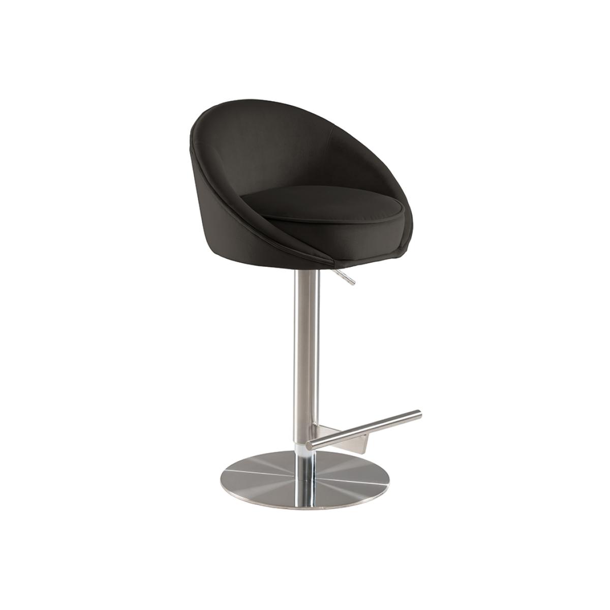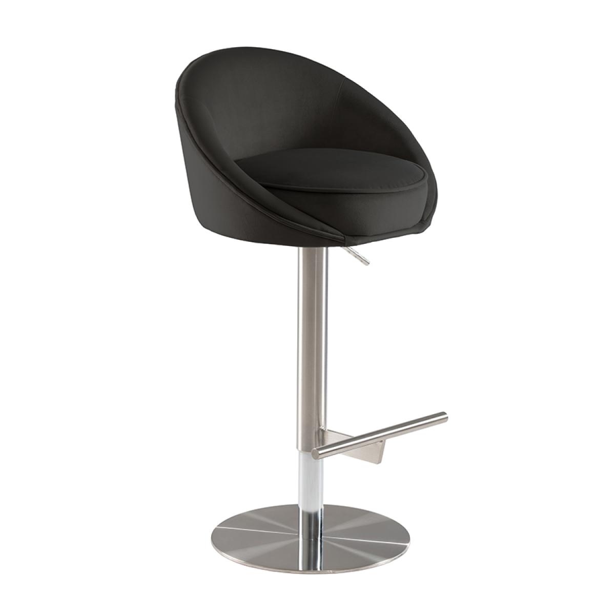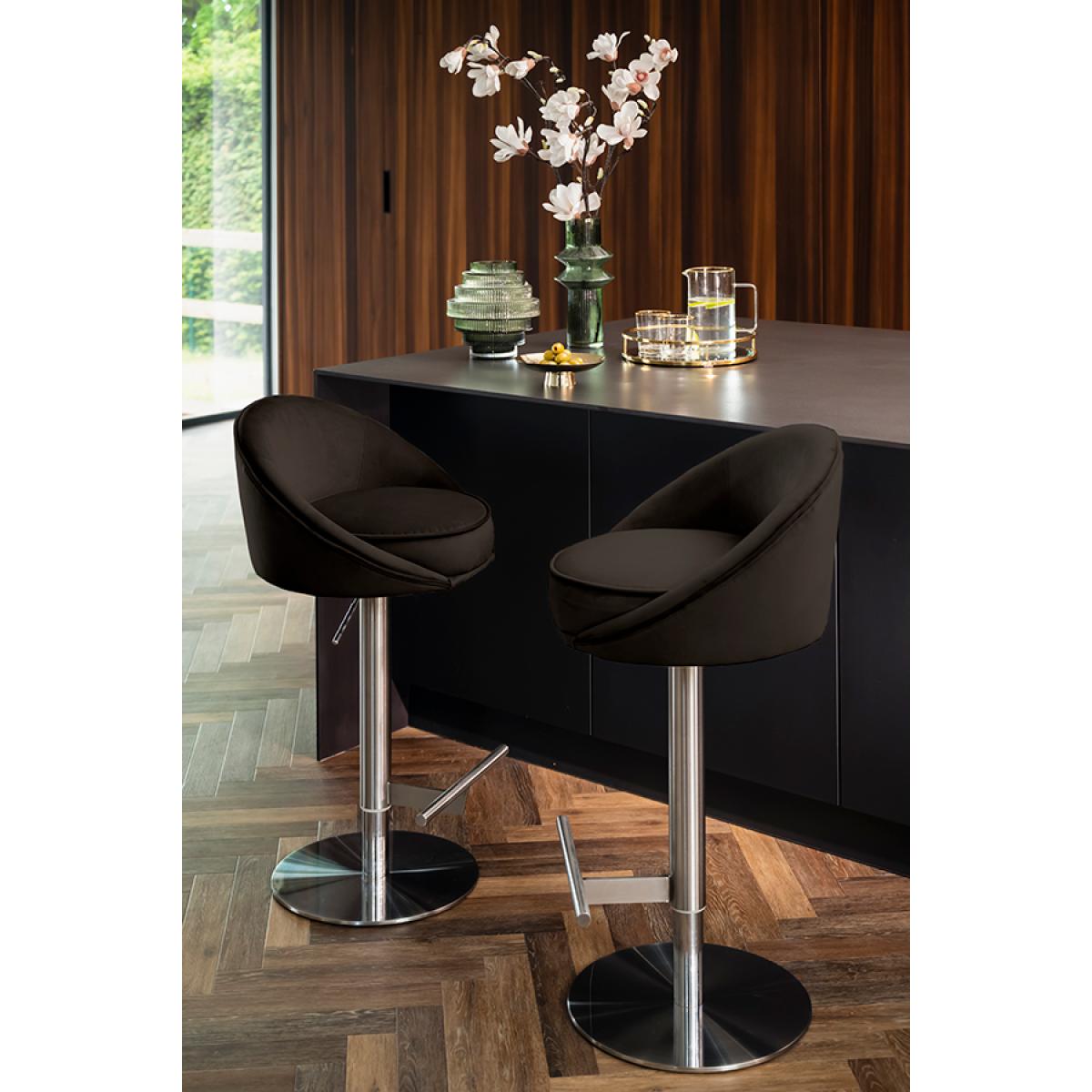 A sleek bar stool inspired by highly collectable Mid-Century American furniture. Brushed stainless steel base with height adjust and swivel functions. Suitable for use as a bar or counter stool. Velvet upholstery fabric.