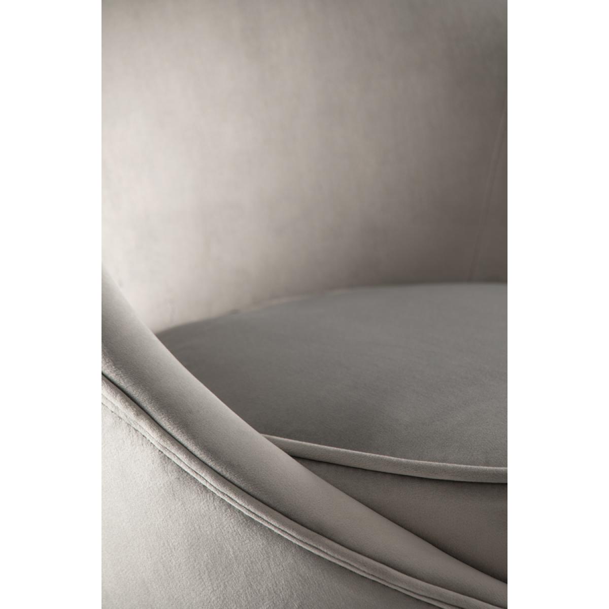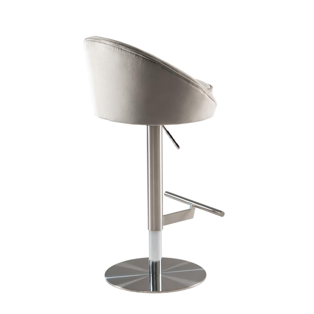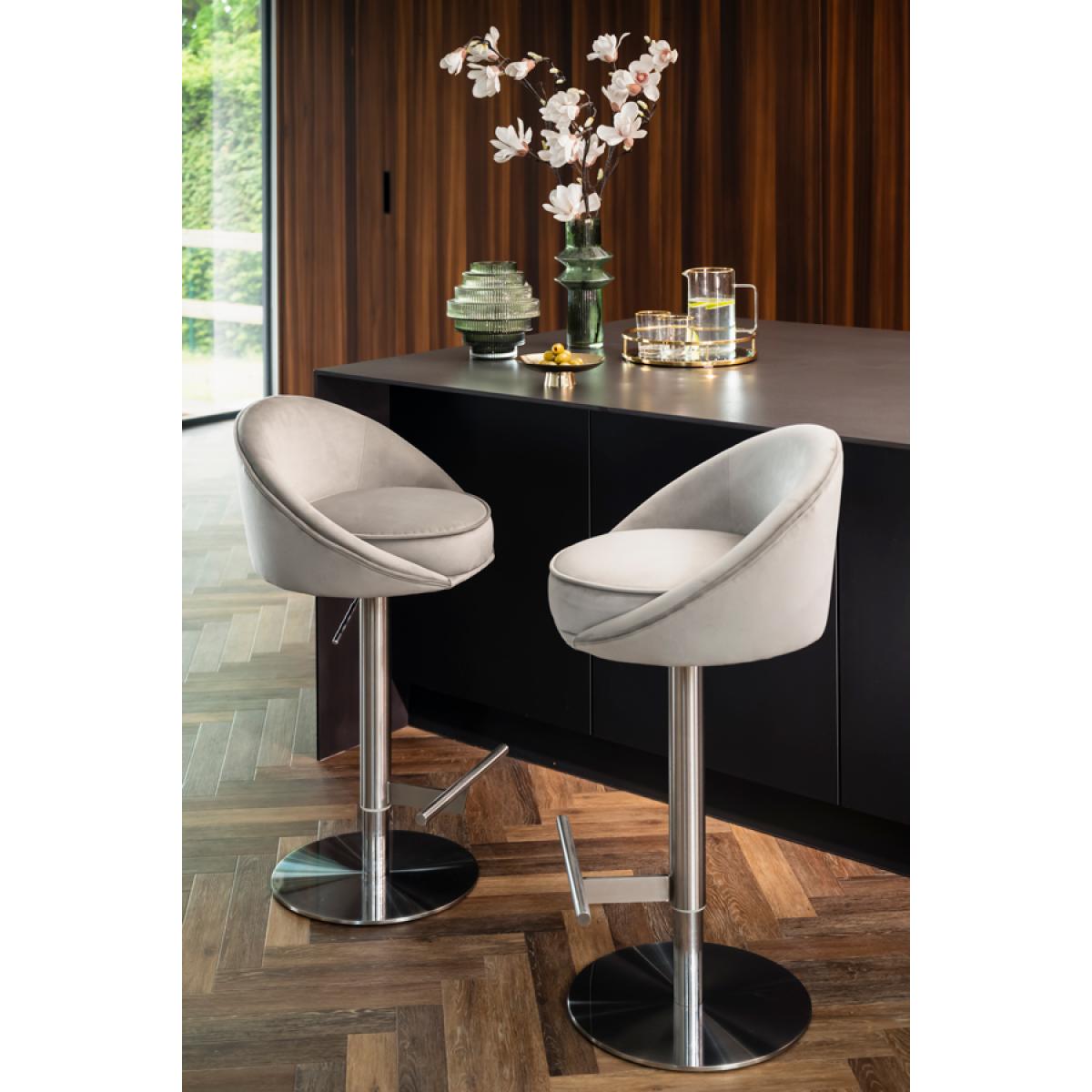 A sleek bar stool inspired by highly collectable Mid-Century American furniture. Brushed stainless steel base with height adjust and swivel functions. Suitable for use as a bar or counter stool. Velvet upholstery fabric.