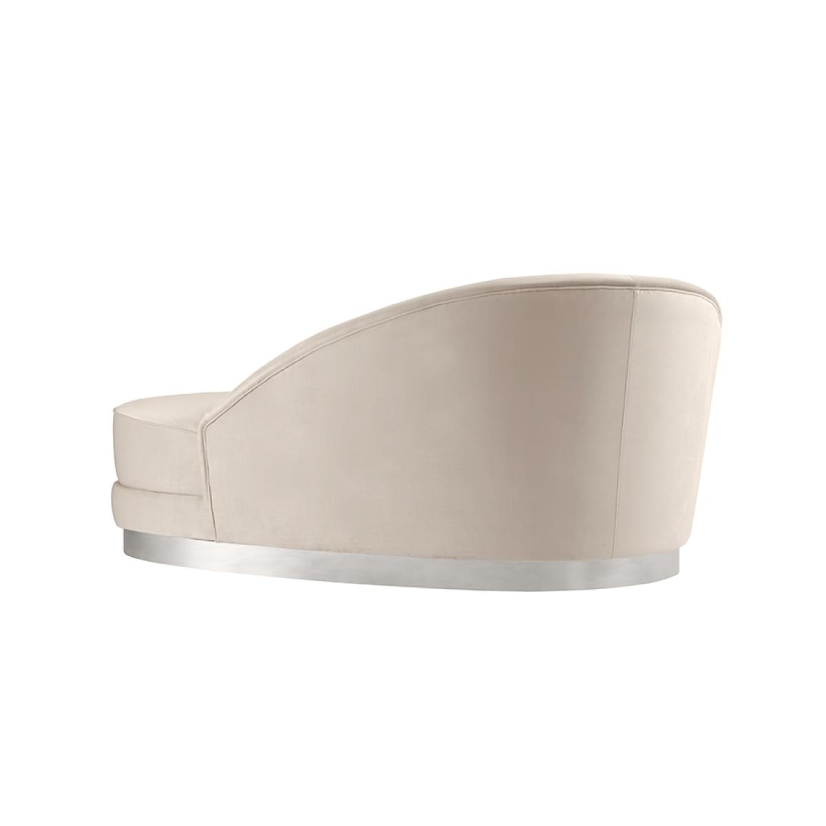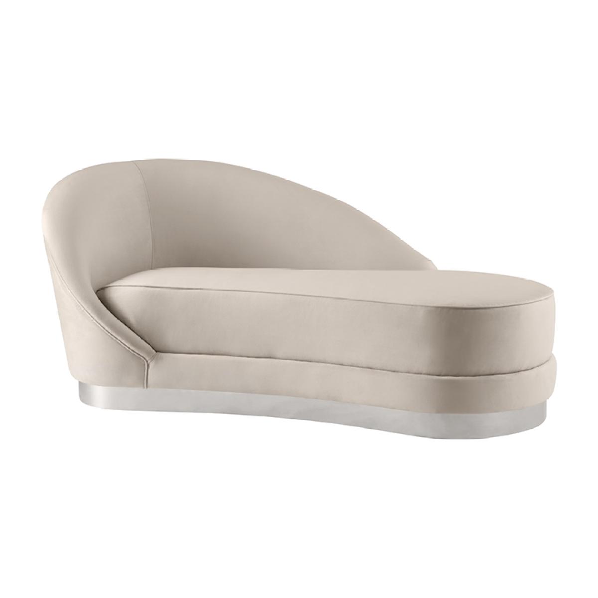 A beautiful, sculptural chaise longue inspired by highly collectable Mid-Century American furniture. Generous, deep foam and fibre filling. Sprung seat and backrest for maximum comfort. Velvet upholstery fabric. Mirror polished steel plinth.