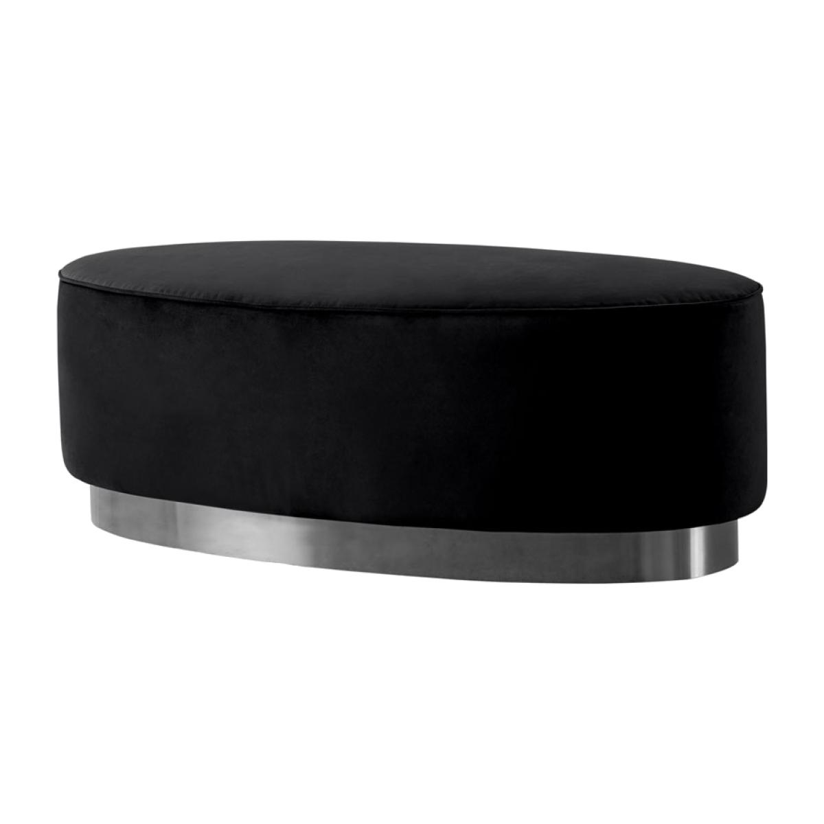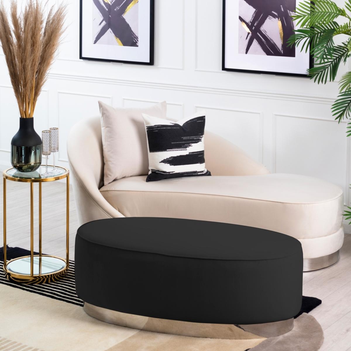 A large, oval centrepiece footstool, designed to be used alone or as an extension to the Selini sofa. Inspired by highly collectable Mid-Century American furniture. Generous, deep foam and fibre filling. Sprung seat for maximum comfort. Velvet upholstery fabric. Mirror polished steel plinth.