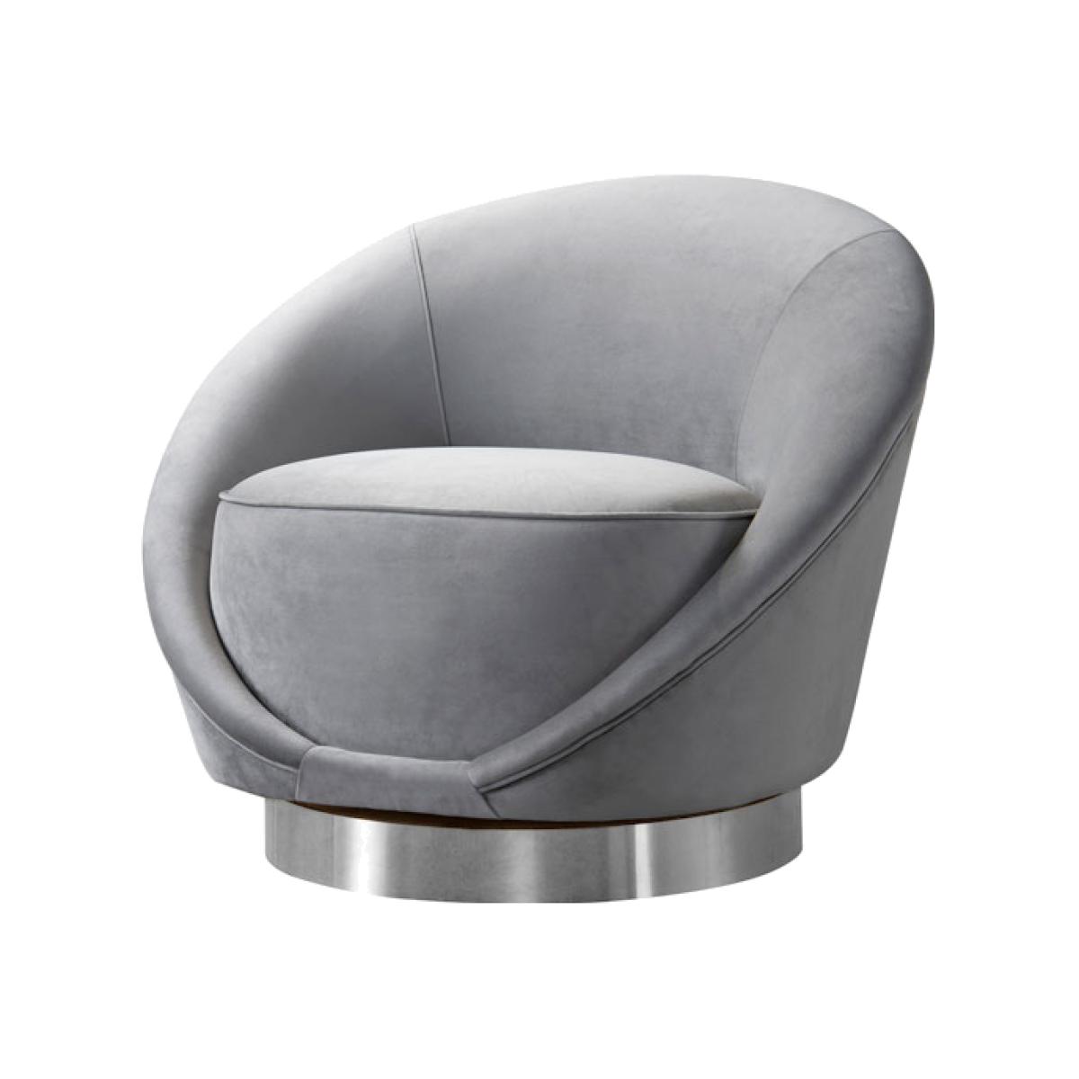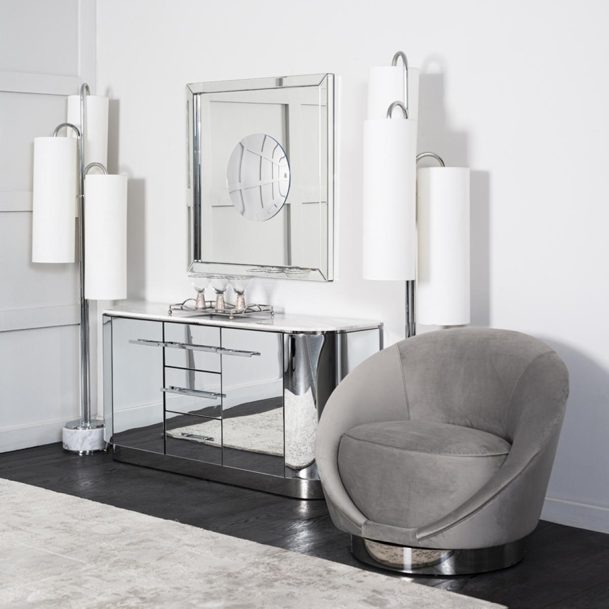 A beautiful, sculptural swivel chair inspired by highly collectable Mid-Century American furniture. Generous, deep foam and fibre filling. Sprung seat and backrest for maximum comfort. Velvet upholstery fabric. Mirror polished steel plinth.