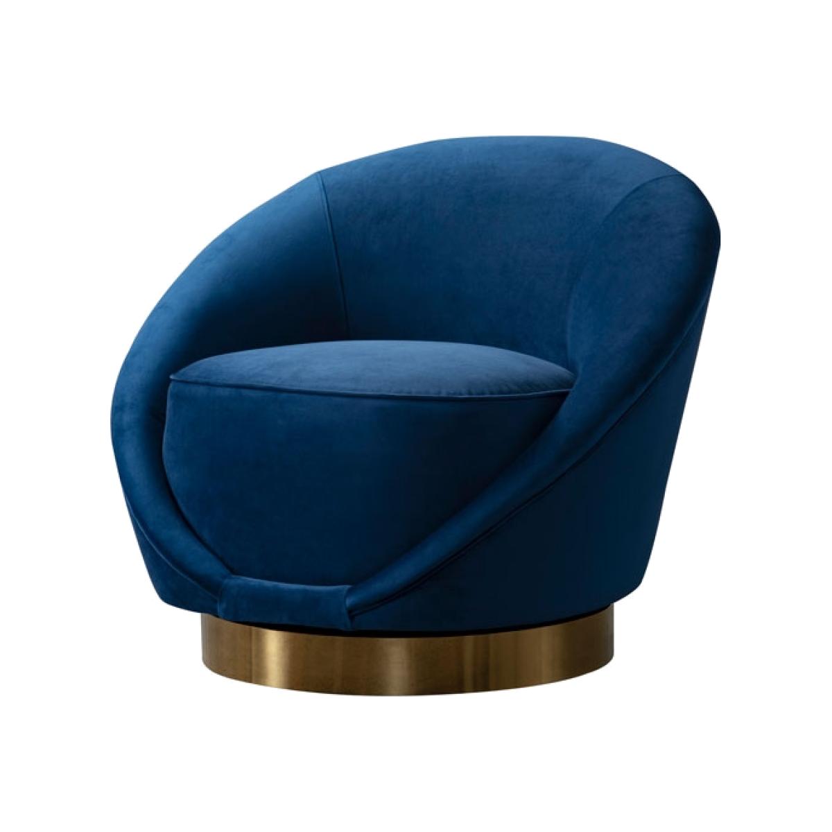 A beautiful, sculptural swivel chair inspired by highly collectable Mid-Century American furniture. Generous, deep foam and fibre filling. Sprung seat and backrest for maximum comfort. Velvet upholstery fabric. Mirror polished steel plinth with brass finish.