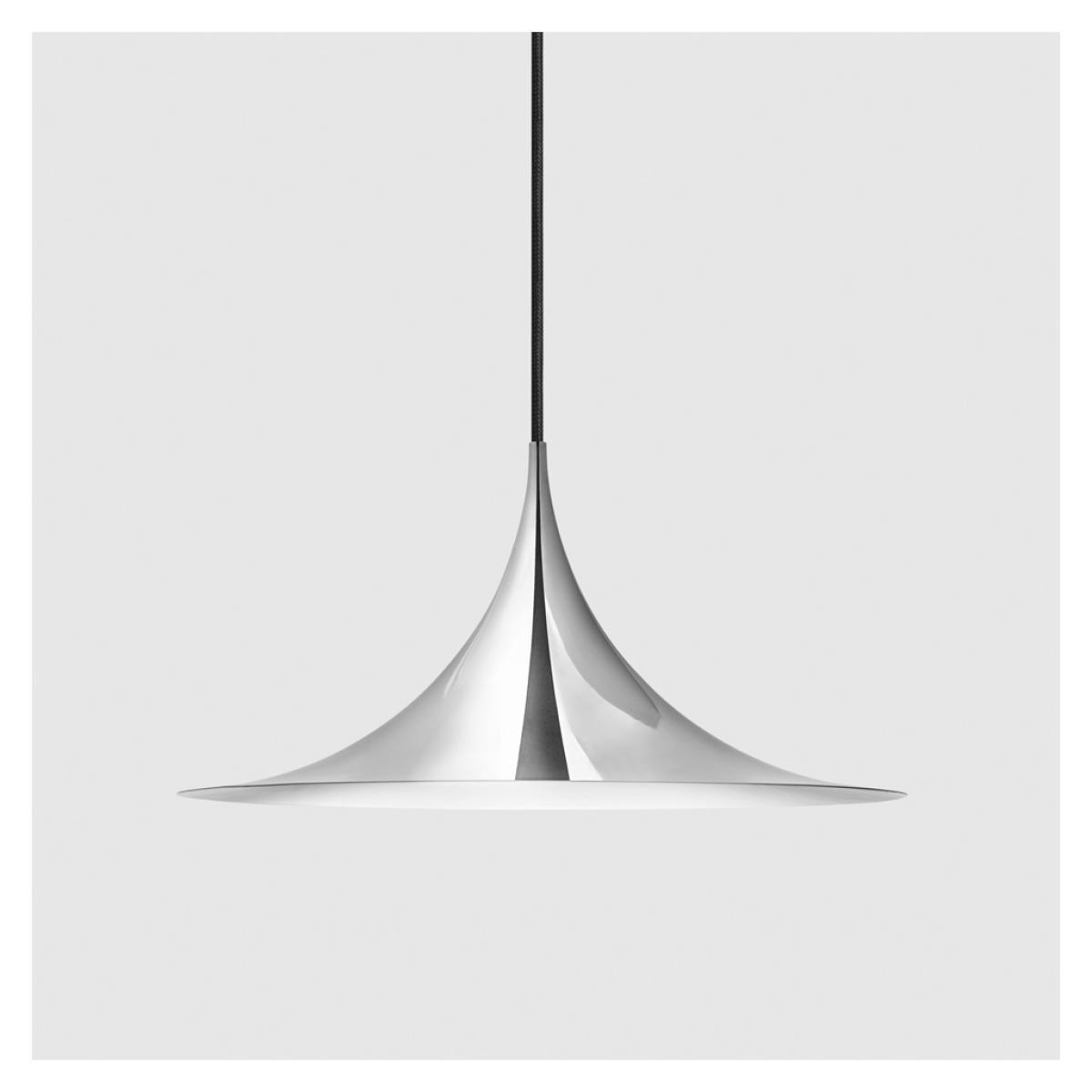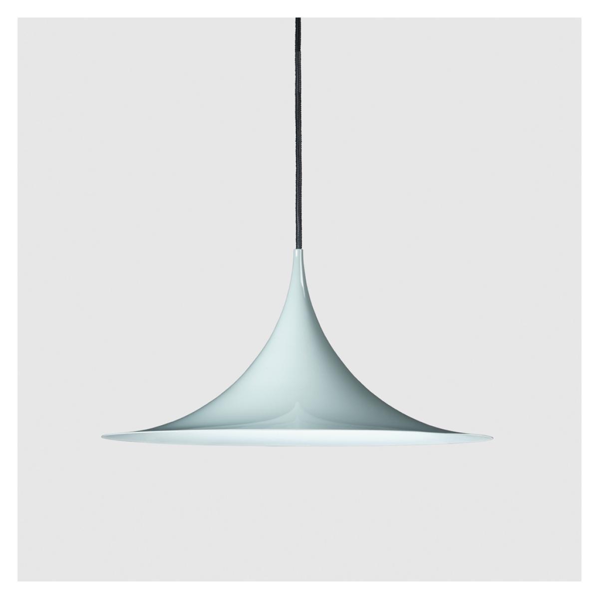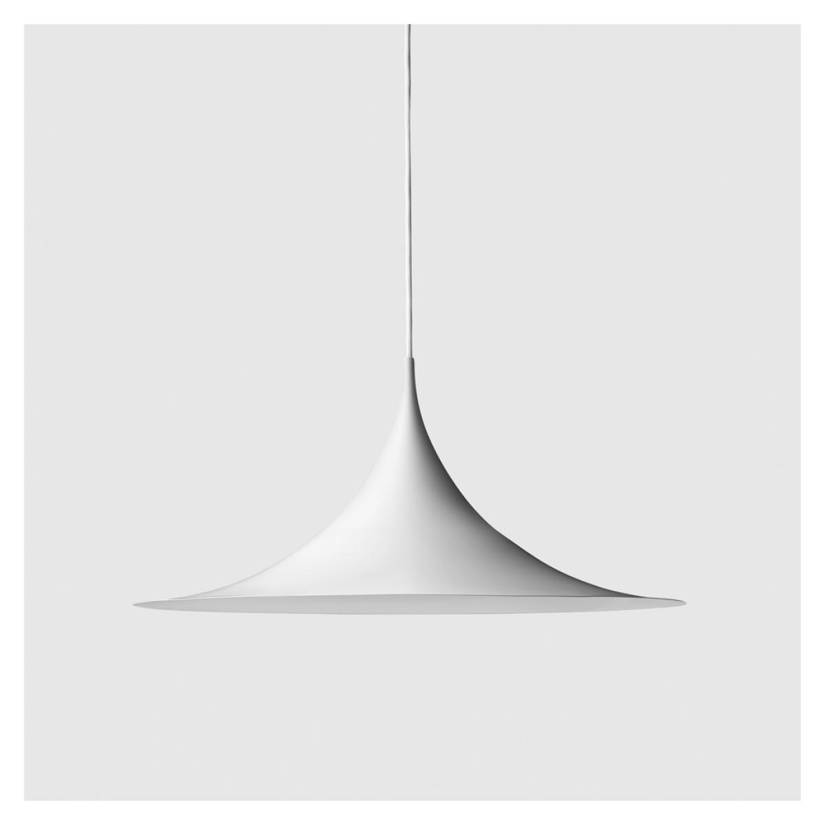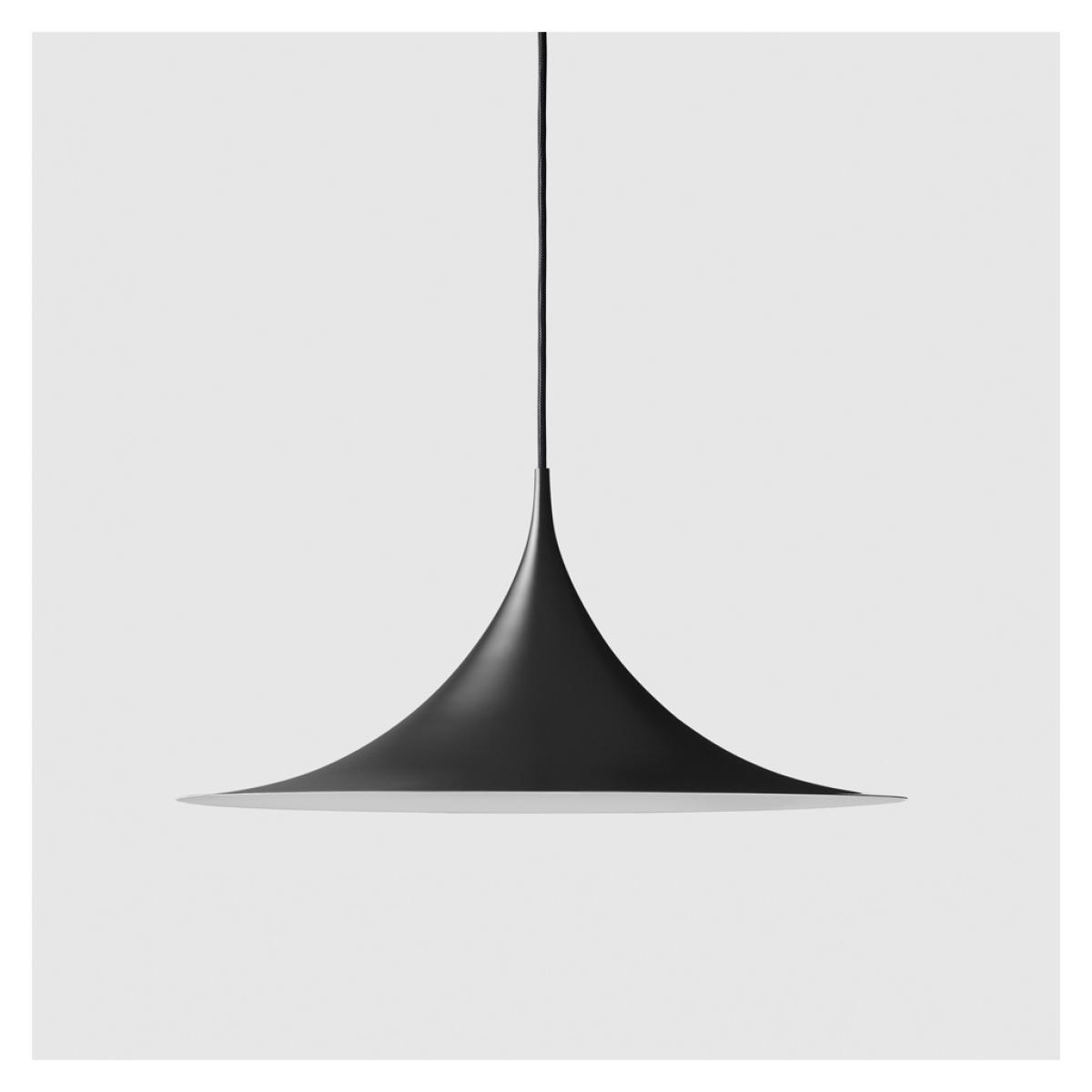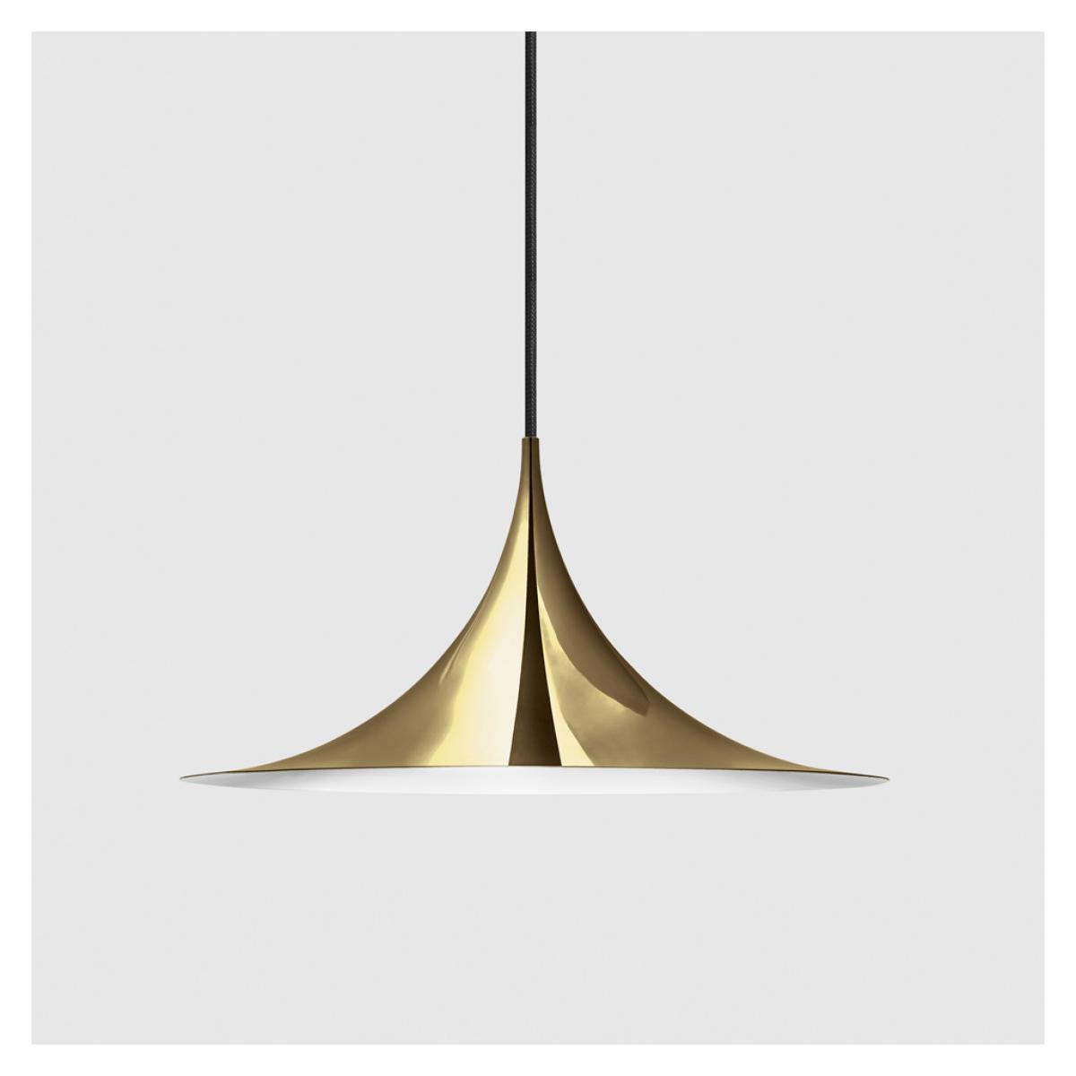 The iconic shape of the medium Semi Pendant Light in brass was conceived by placing two crescent shapes back to back to create a distinctive arch form. Hand-spun in aluminium and finished in brass, the elegant Semi Pendant Light hangs from a bold black cord. The conical shape of the light casts a direct downward glow, making it ideal for over work surfaces or dining tables. Designed by Claus Bonderup and Torsten Thorup and produced by Gubi, the lightness of form and timeless design of this distinctive light meant that it achieved huge worldwide success during the 1980s, when it achieved the status of best-selling Danish design. Requires: 1 x Max 60W E27 half-mirror max bulb Discover the rest of the Semi Pendant collection