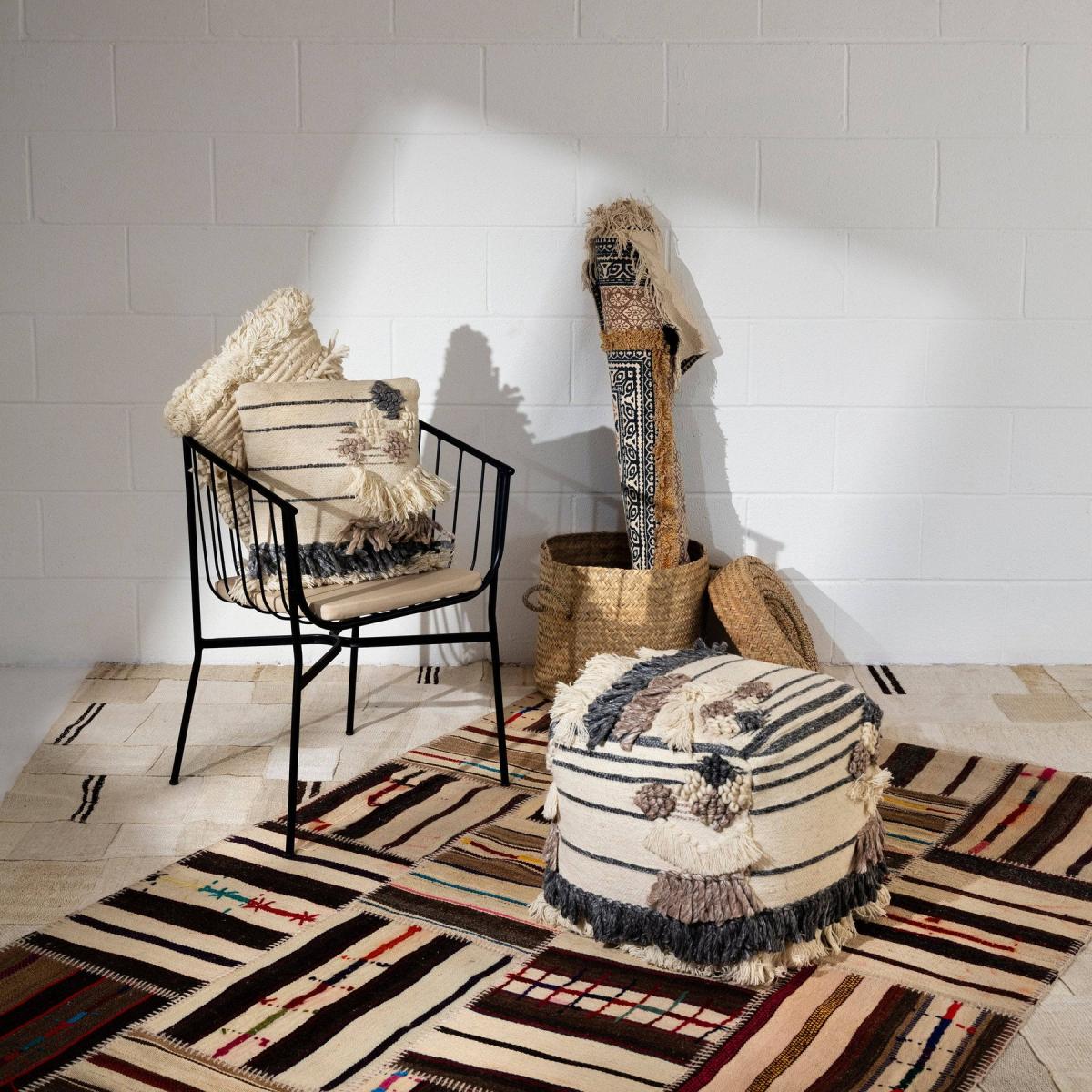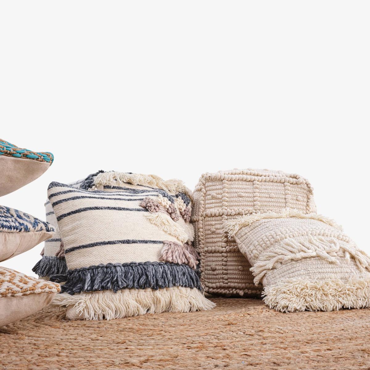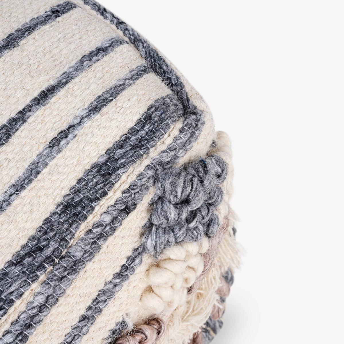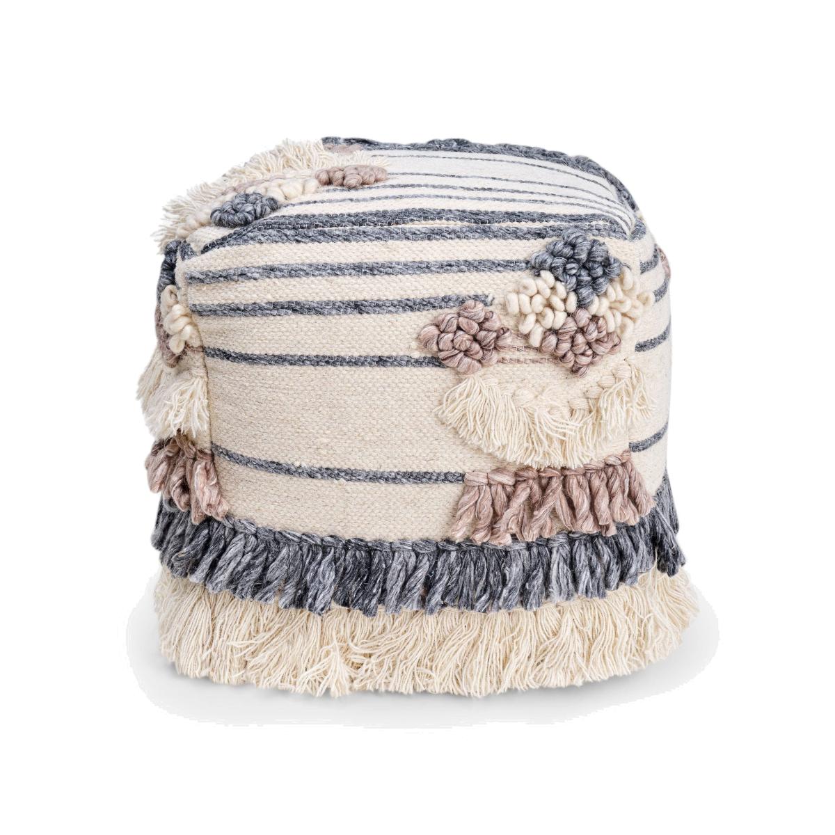 Sena pouf will complement bohemian decors to beautifully enhance any living room, hallway or bedroom and add flamboyant flair to the room. The gorgeous design is handwoven from wool and viscose for a soft touch and comforting feel. The simplistic craftsmanship is crafted by skilled artisans in a neutral beige colour palette with blue and white stitching and tassels to give it an undone eclectic look. A charming furniture piece that is sure to evolve your décor and create a focal point in the room. A versatile multitasking pouf, it works as an extra seat when guests swing by and just as perfect as a foot-rest or a table. Handmade by artisans in India.