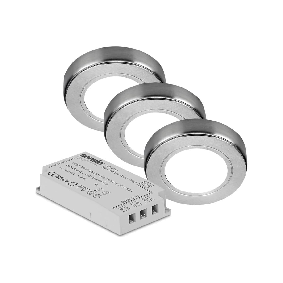 A pack of three Sensio Hype LED Trio Tone Under Kitchen Cabinet Spot Lights, a circular spotlight design in a stainless steel finish. The integrated Trio Tone technology allows you to select between cool white, natural white or warm white colour temperature. To change the light tone after installation simply remove the LED centre and select a different tone. Perfectly positioned spotlighting ensures that your kitchen is an efficient working space. With spotlighting, we recommend using two to three spotlights every metre. This creates a coned beam effect. 6W mains connected. 3000. K, 4000. K and 5000. K. 130-150 Lumens. IP20 rating. 6W driver included. Want to see it first? You may want to see and get a feel for the product in one of our shops before ordering. We'll be able to tell you where the range you'd like to view is on display.