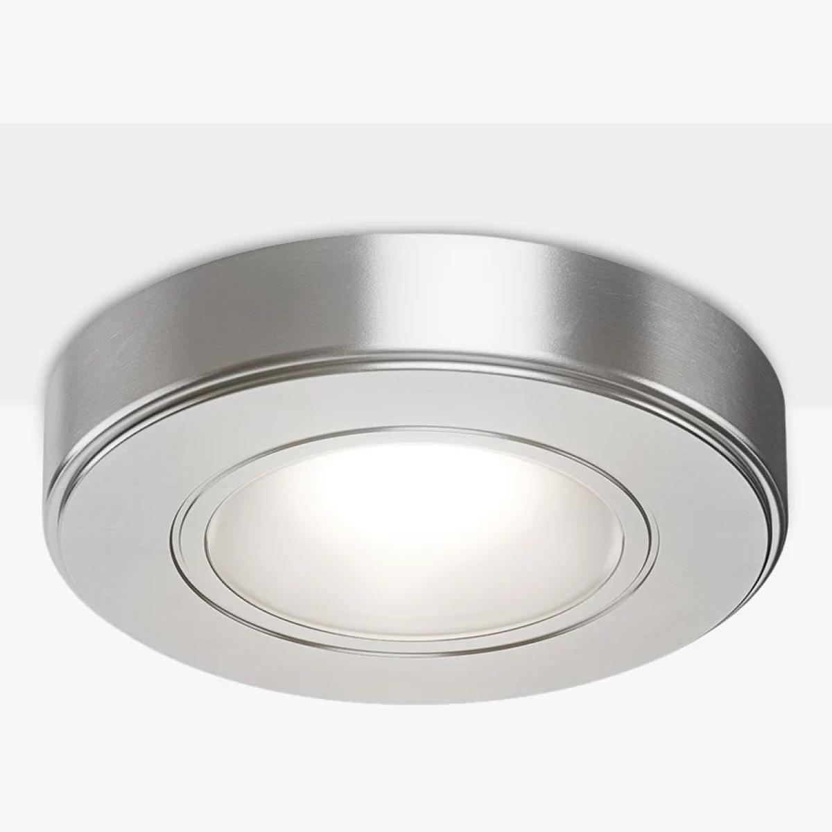 A single Sensio Zeta LED Under Kitchen Cabinet Light, a circular spotlight design in a stainless steel finish. The light illuminates kitchen countertops or inside cabinets as feature lighting, with a natural white light. The light is supplied with a removable collar to allow for either a surface-mounted or recessed finish. Easy to install and compatible 15W Titan+ Driver and 30W Titan+ Driver. 2W mains connected. 4000. K. 180 Lumens. IP20 rating. The single light fills/covers an area of 500mm.