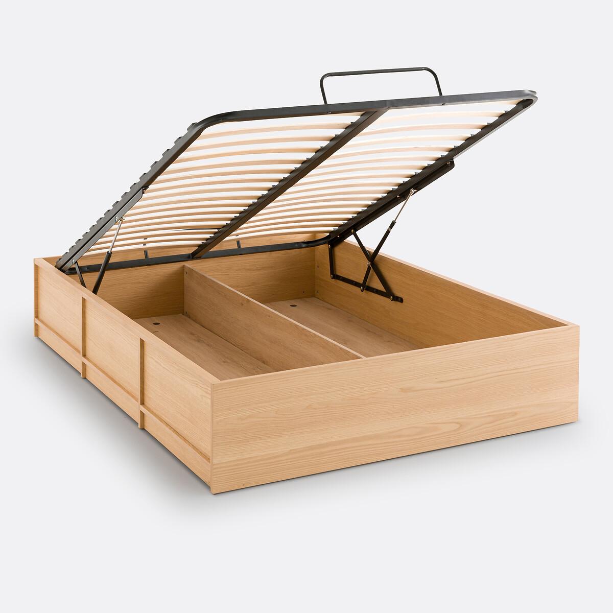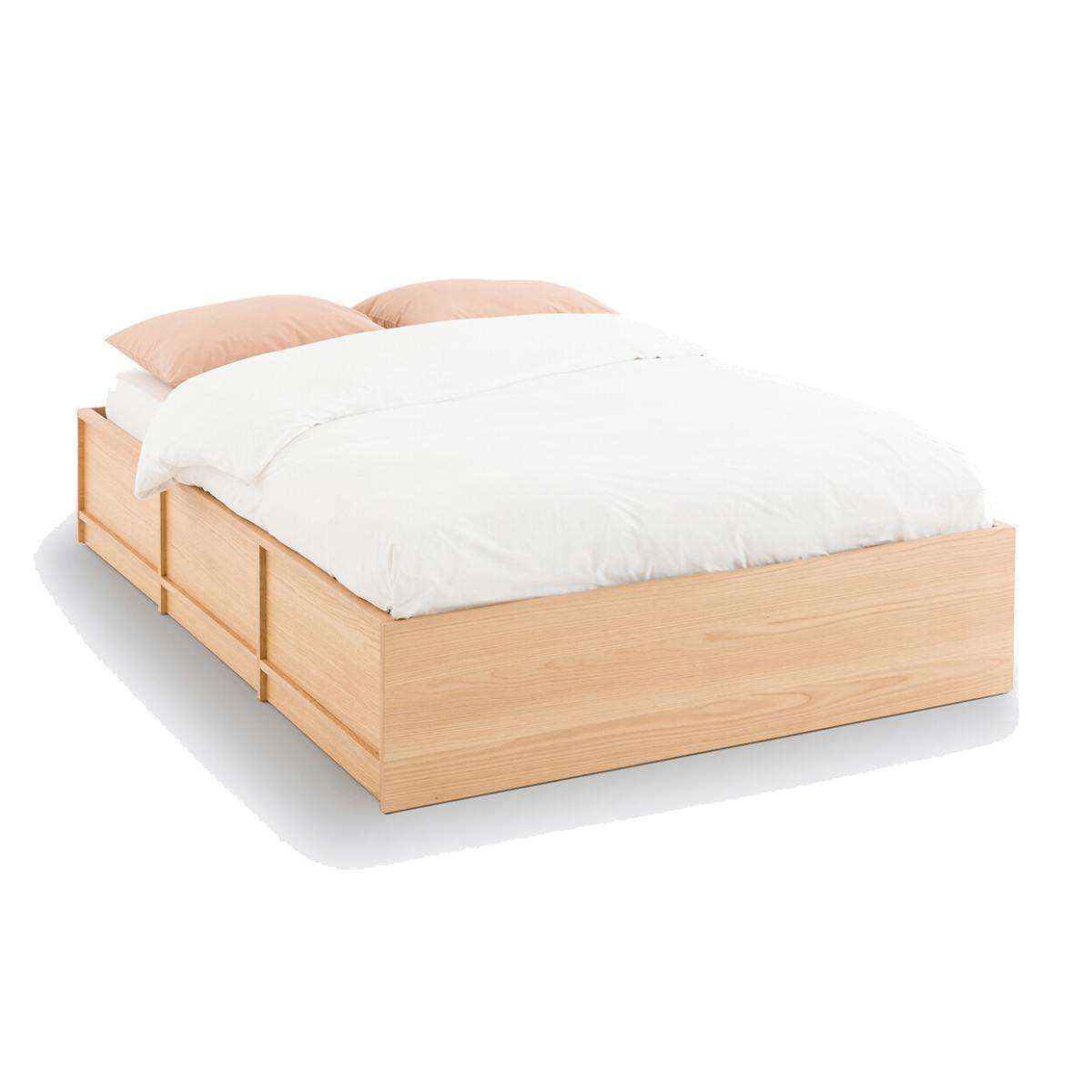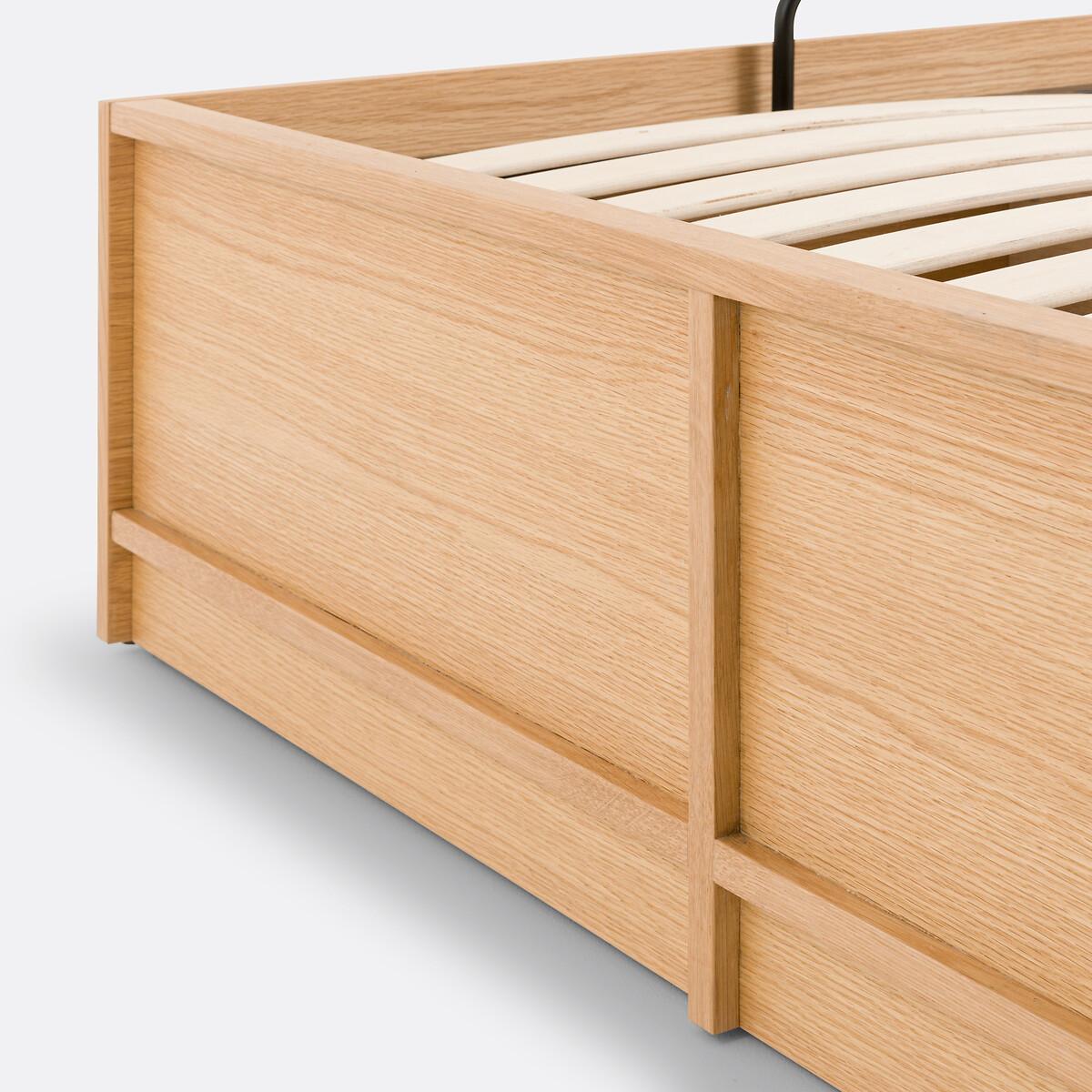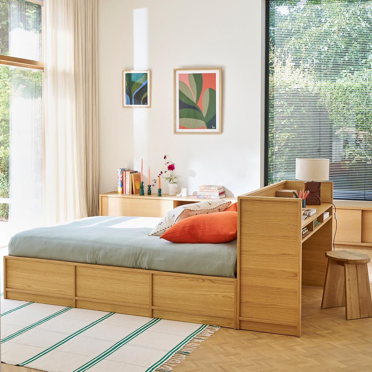 The Senssia storage bed is part of our Les Ingénieux collection. Creations full of ideas to make life simpler and everyday life more beautiful, imagined by our designers in France.. Simple and minimalist. Contemporary in style, the Senssia bed is distinguished by its pure lines and its integrated box under the base. Designed to be combined with the desk and wardrobes in the same range, it makes the most of the space in a bedroom. Designed by La Redoute Intérieurs. Why you'll love this product • Saves space with this large storage space under the bed base. Ideal for storing pillows, blankets or bed linen. • A lifting base on hydraulic cylinders for easy access to the storage space • Slatted mattress support for additional comfort. Product Details • Structure in oak and oak veneered MDF, polyurethane varnish finish • Bottom of storage space in melamine panels, oak decor • Delivered with lifting base with jacks. Epoxy-finished steel frame, curved eucalyptus plywood slats • Opening of the storage base possible from both sides (at the head or foot of the bed) • Matching Senssia desk sold separatelyDimensions. Double Size (140 x 190cm)Overall • Width: 148.2cm • Height: 36.5cm • Length: 199.6cm • Weight: 78.5kg. Usable space • Storage box: W141 x H28 x D196cm. King Size (160 x 200cm)Overall • Width: 168.2cm • Height: 36.5cm • Length: 209.6cm • Weight: 84.2kg. Usable space • Storage box: W161 x H28 x D206cmDelivery:. This product requires assembly. Available for home delivery. Note! Please ensure all passageways and doorways are wide enough. • WOOD FROM MORE SUSTAINABLY MANAGED FORESTS AND CONTROLLED SOURCES. FSC® Mix wood contains at least 70% FSC® certified and/or recycled wood, the remainder being FSC® controlled wood. Dimensions and weight of parcel. Double size3 parcels • L210 x H20 x D43cm. 63kg • L197 x H4.5 x D142cm. 17.5kg • L122.5 x H5 x D12cm. 6.5kg. King size3 parcels • W135.5 x H10.5 x D23.5cm. 8kg • W216 x H11 x D171cm. 23.9kg • W219 x H22 x D49cm. 68.8kg