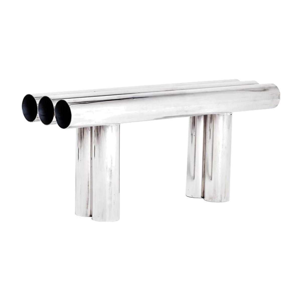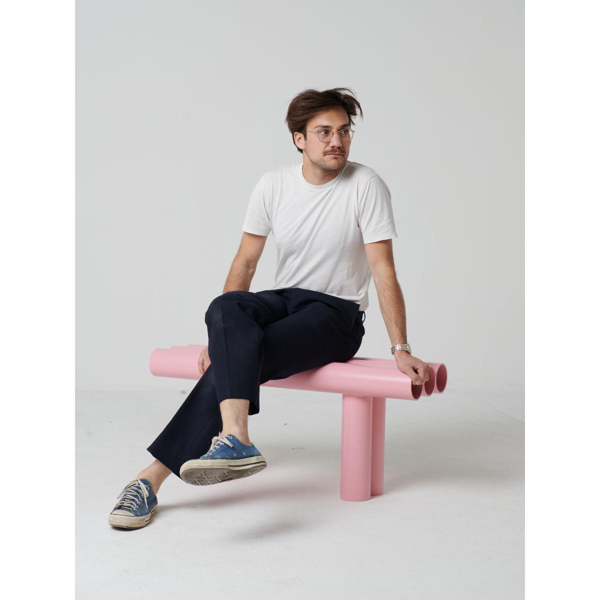 A graphic, sculptural piece of furniture that can be displayed like a work of art in your living room or on your terrace. The Septem bench is an assembly of seven lacquered aluminium tubes. These tubes evoke industrial pipes, given a twist by the luxurious polished mirror finish. The simple form, both enigmatic and playful, irresistibly attracts attention and stimulates the imagination. A style both full of fantasy yet refined. The Septem bench won’t go unnoticed, but will become a centrepiece in your decor. A snub to conventional design and predictable furniture. With its rudimentary form, lost between a feeling of regression and technical distinction, the tube calls out with its power of interpretation. Designer Axel Chay has succeeded in transforming a basic element (metal tube) into a sculptural, contemporary piece, while preserving the integrity of the original element. Geometric abstraction is expressed in volumes of raw materials that seem to defy space and time. French designer Axel Chay has a knack for crafting a daring language of shapes and colours, borrowing here and there from the 1980s, kinetic art and the Memphis movement. Seeking abstraction through strict, calculated geometric shapes, he seeks to breathe new life into sculptural furniture and plays with raw materials such as cork, steel and aluminium. The parts are manufactured or industrialised in France. In this way, the hands or machines behind these household objects come from the aeronautics and nuclear sector, as well as from historical French know-how.