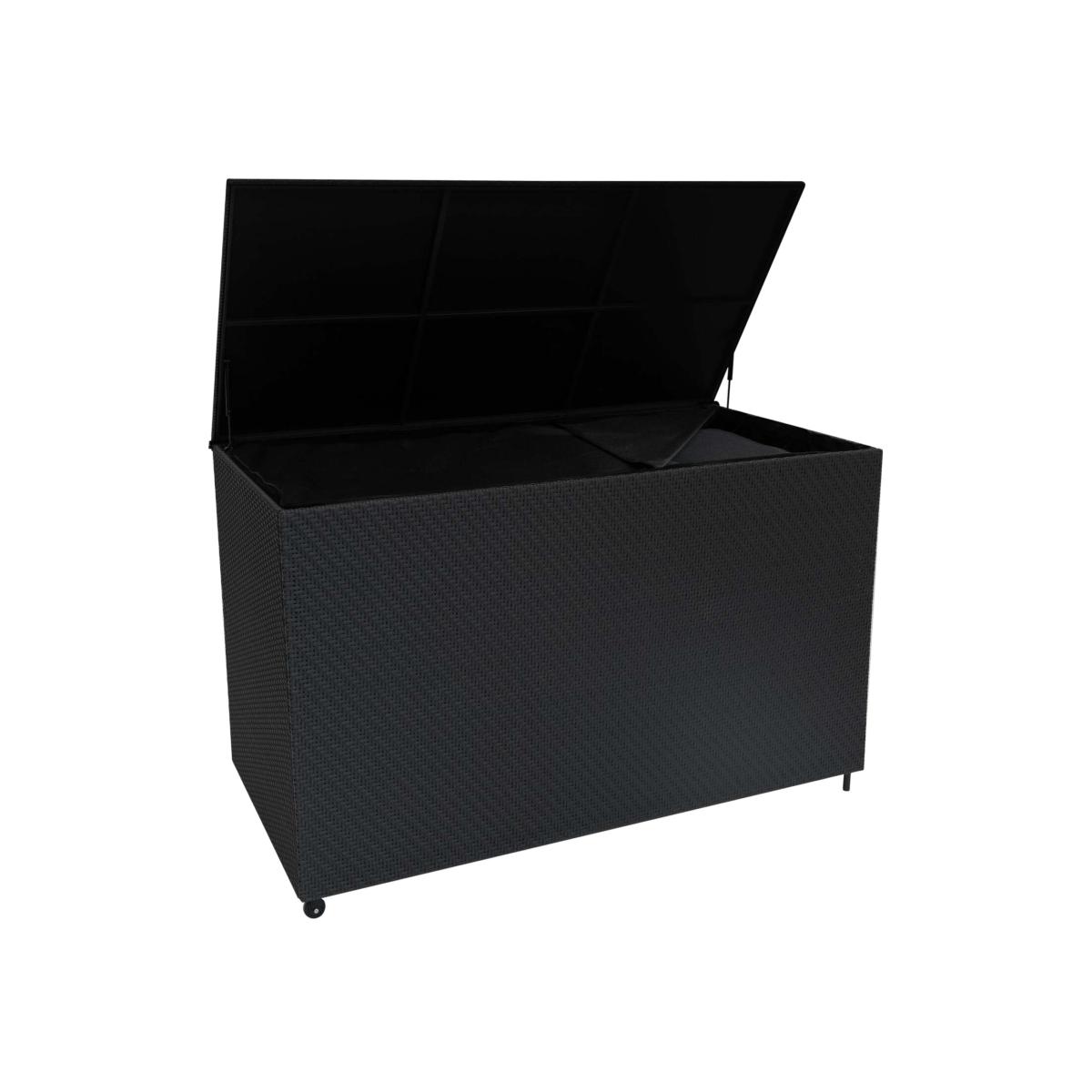 Keep your outdoor space effortlessly tidy with this premium 996. L rattan storage box, designed for both practicality and style. Built with durability in mind, this storage box features machine-woven polyrattan, offering a sleek, high-quality finish that resists wear over time. The sturdy steel frame ensures long-lasting support, making it a reliable choice for gardens, patios, or even indoor spaces. A UV-resistant exterior not only enhances its modern aesthetic but also ensures long-term durability. Boasting a generous 996. L capacity, this thoughtfully crafted chest serves as the ideal accompaniment to our Jardi rattan furniture sets, providing comfortable housing for all the cushions. Alternatively it can be used as standalone storage for garden tools and outdoor essentials. This ensures their protection during the colder, wetter months as well as keeping your space clutter-free. Designed for both ease of use and stability, this storage box incorporates thoughtful details that enhance functionality. The hydraulic struts ensure smooth, controlled lid opening, while the steel handle and integrated wheels make repositioning effortless. On the opposite side, sturdy feet provide a secure base, keeping the box firmly in place when stationary. Whether you need to move it for convenience or keep it fixed in one spot, this well-balanced design offers flexibility. A standout feature is the built-in waterproof lining, which sits neatly inside the box to shield its contents from rain and moisture. When fully zipped over the top, it creates a complete seal, keeping everything inside dry and protected in all weather conditions. The UV-resistant black polyrattan exterior not only enhances its modern aesthetic but also ensures long-term durability, preventing fading and damage from sun exposure.