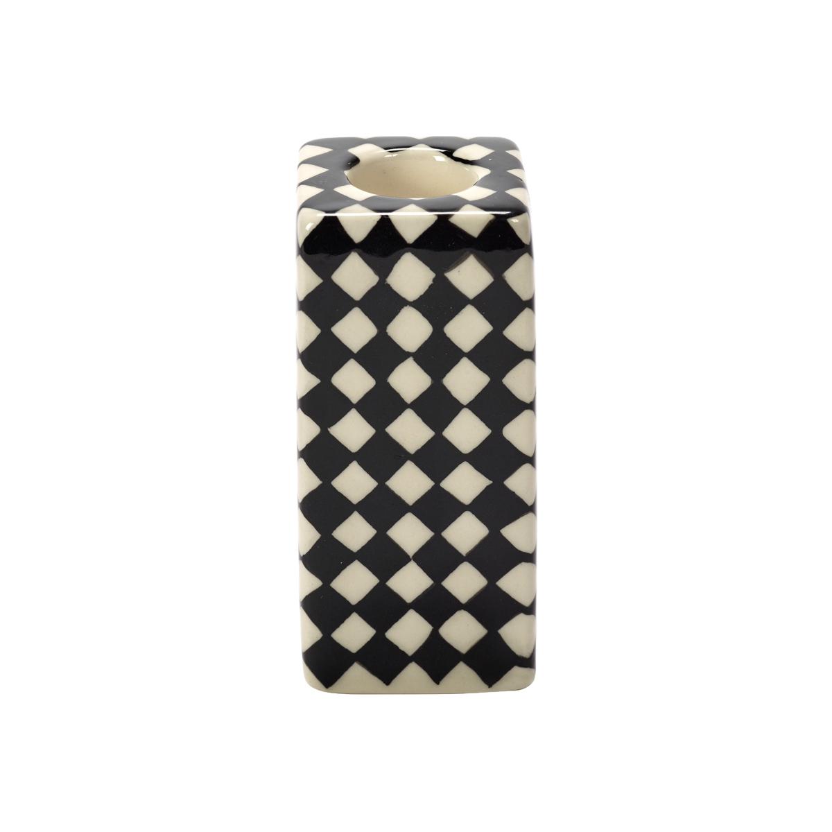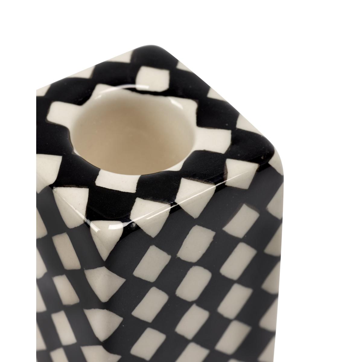 This candlestick is a striking piece that combines bold geometry with a monochrome palette, making it a versatile addition to various interiors. I love its contemporary monochrome pattern-the black and white contrast adds visual interest without overwhelming the space. It's particularly effective in minimalist or Scandinavian-style settings, where its clean lines can complement understated decor, but it can also add an eclectic edge to more eclectic or boho environments. For styling tips, consider pairing it with simple candles in matte finishes or layering it on a textured tray with greenery or other monochrome accessories to create a curated, modern vignette. Its compact size makes it perfect as a tabletop statement or as part of a centrepiece without cluttering the space.