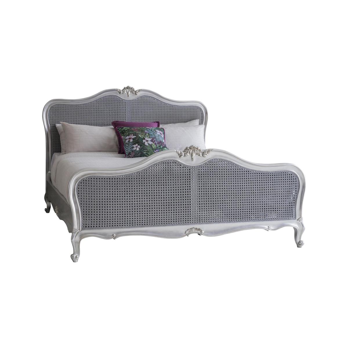 Headboard and footboard each come as one single piece. Luxurious handcrafted bed frame with sumptuous vintage details. Entirely hand carved, in a choice of exquisite finishes. Head and footboards feature stunning carved flower and leaf motifs. With hand woven cane rattan panels or cushioned fabric panels. Sturdy, supportive slatted base. Striking carved claw feet. Suits standard King and Super King mattresses, available separately. Exclusively available at our Friern Barnet store and online. Mattress available separately