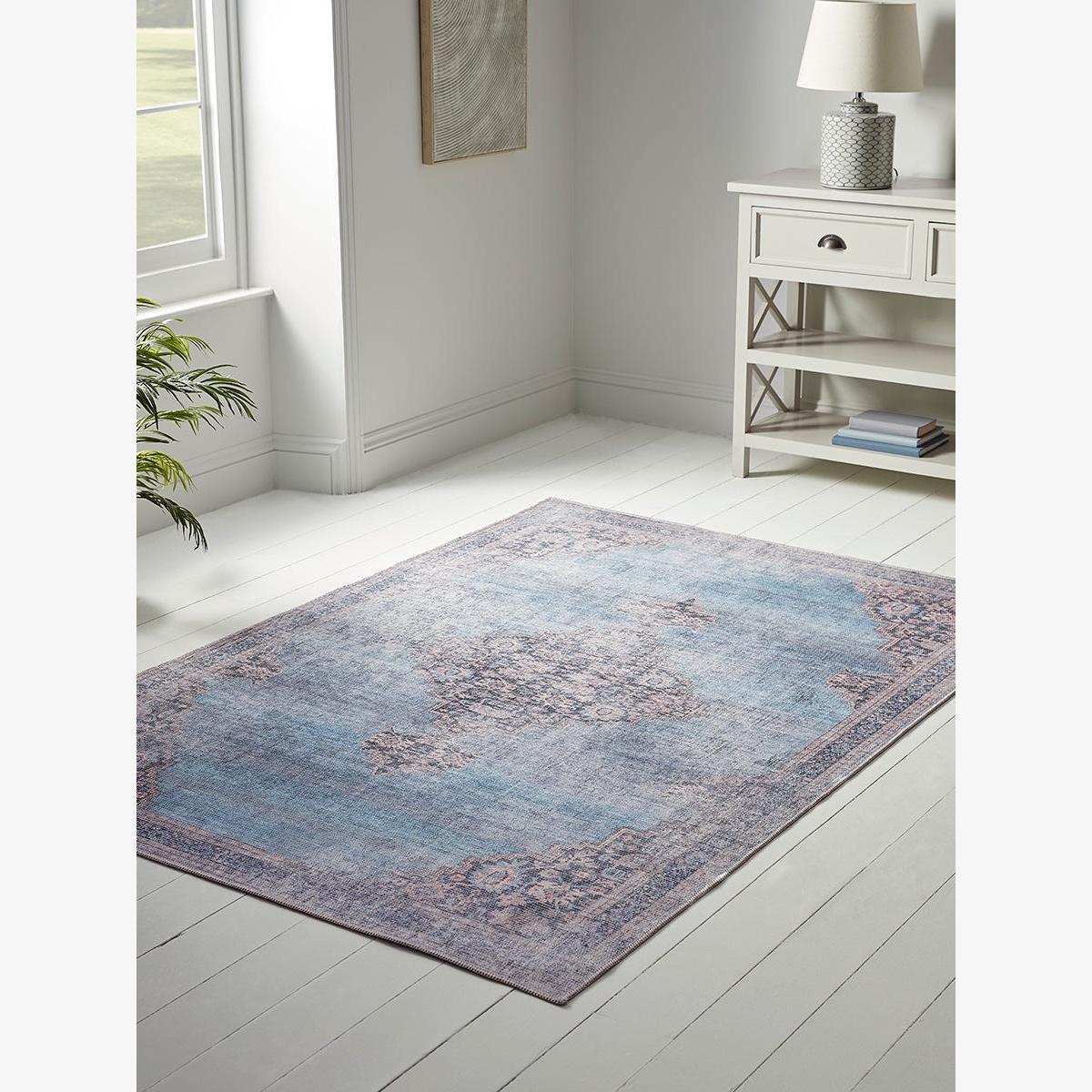 A timeless addition to any home, our Serena rug features a traditional aged design in muted tones of French blue to complement a calm setting. Woven in a cotton and chenille mix for softness underfoot, this versatile rug will bring classic charm to a bedroom or living room.