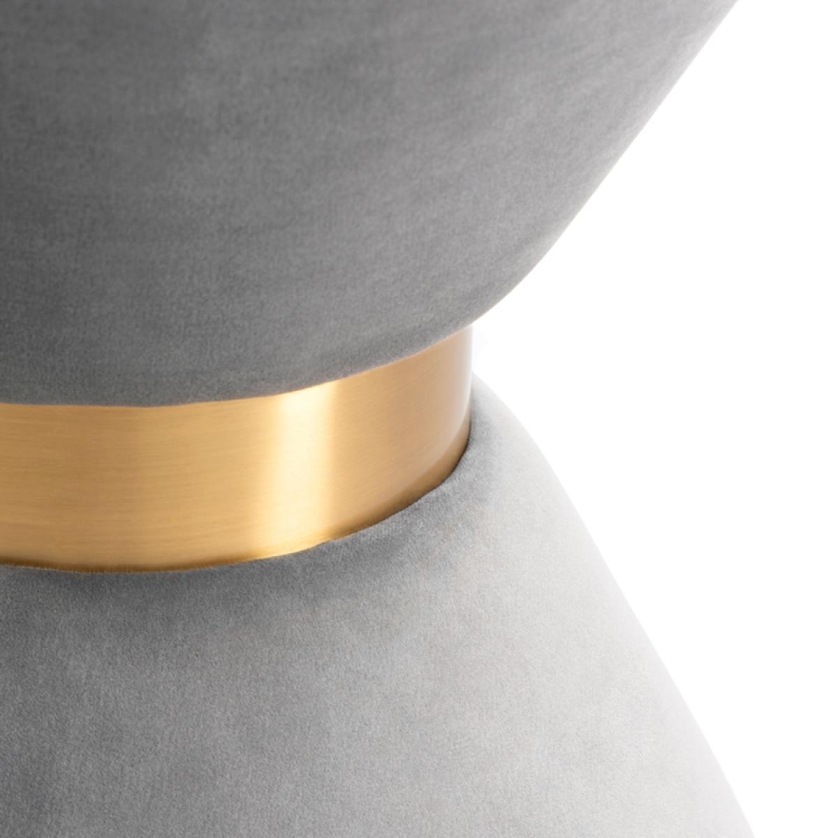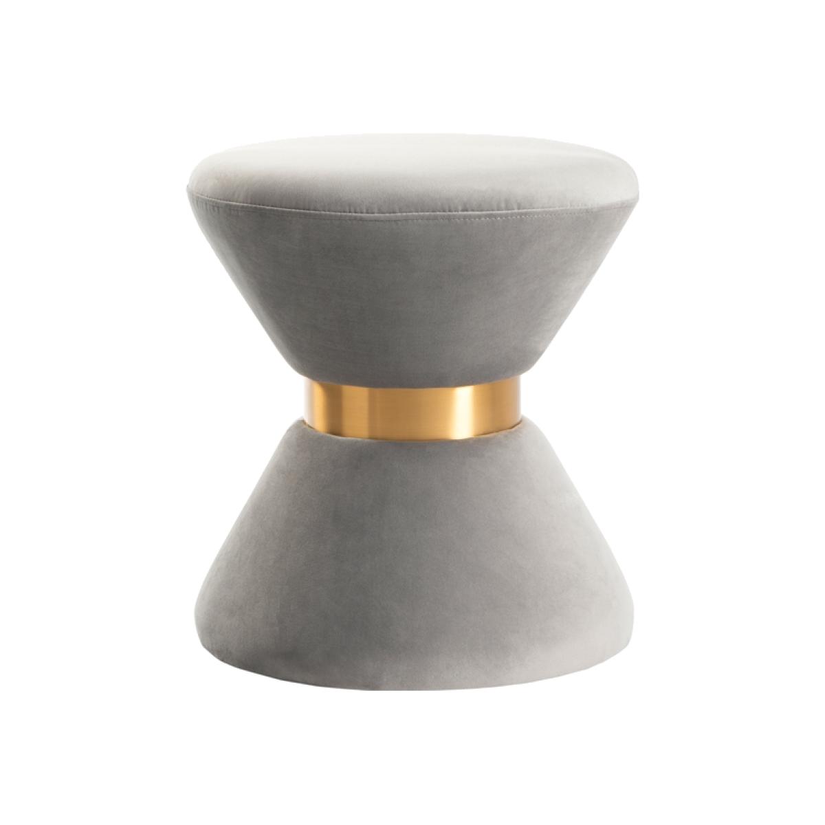 A beautifully shaped, elegant statement stool. Foam padding for comfort. Velvet upholstery fabric. Brushed stainless steel metal work with brass finish. Tough black lining cloth.