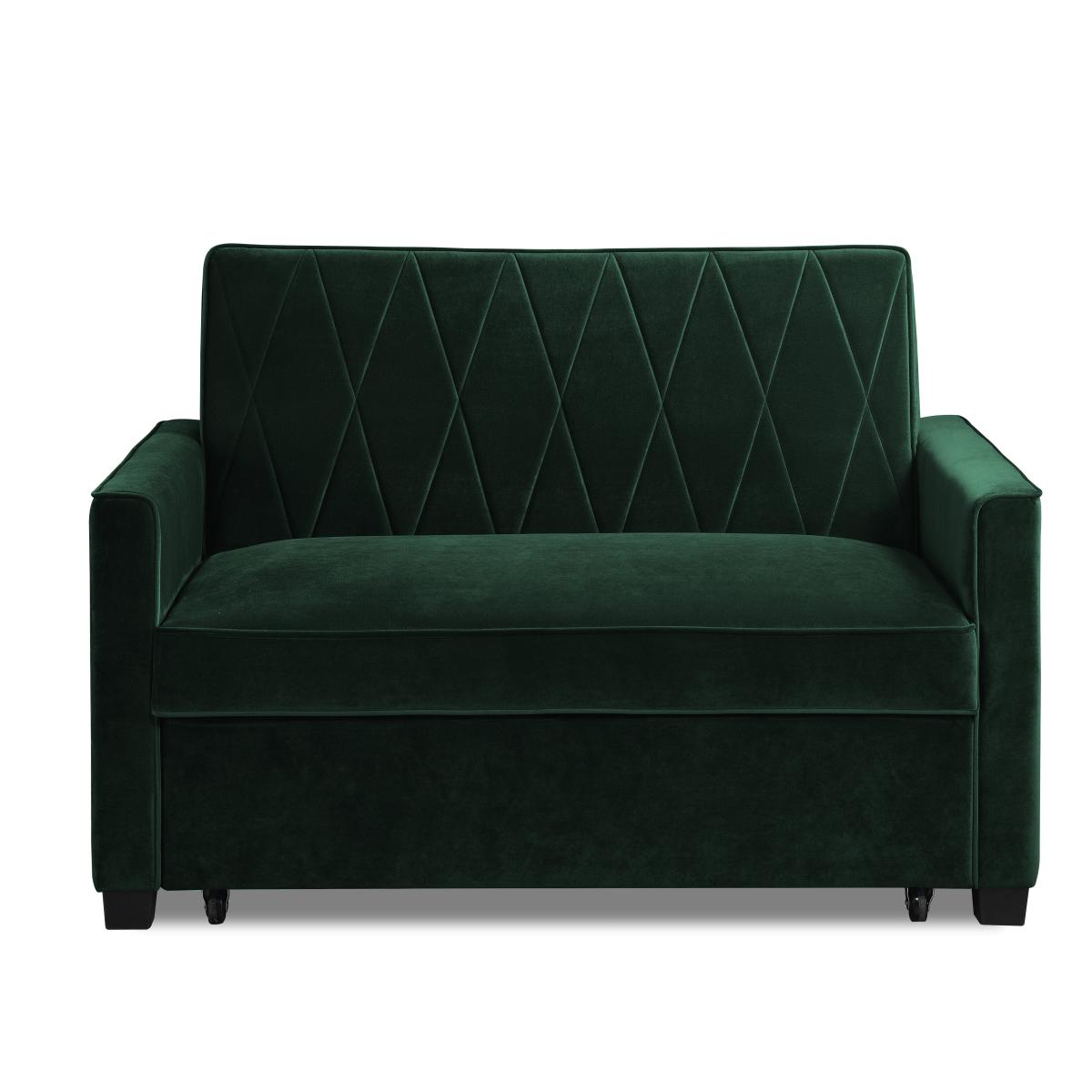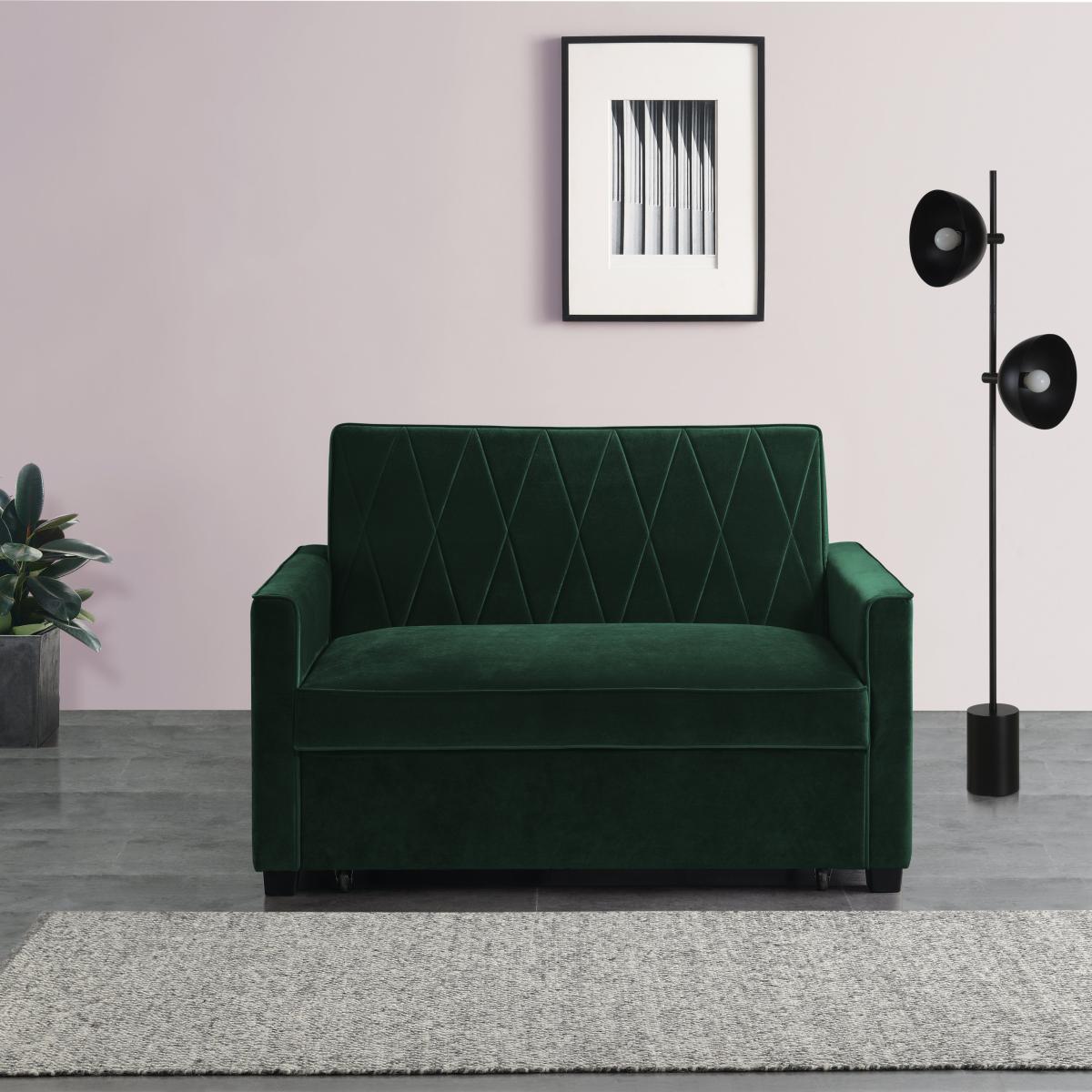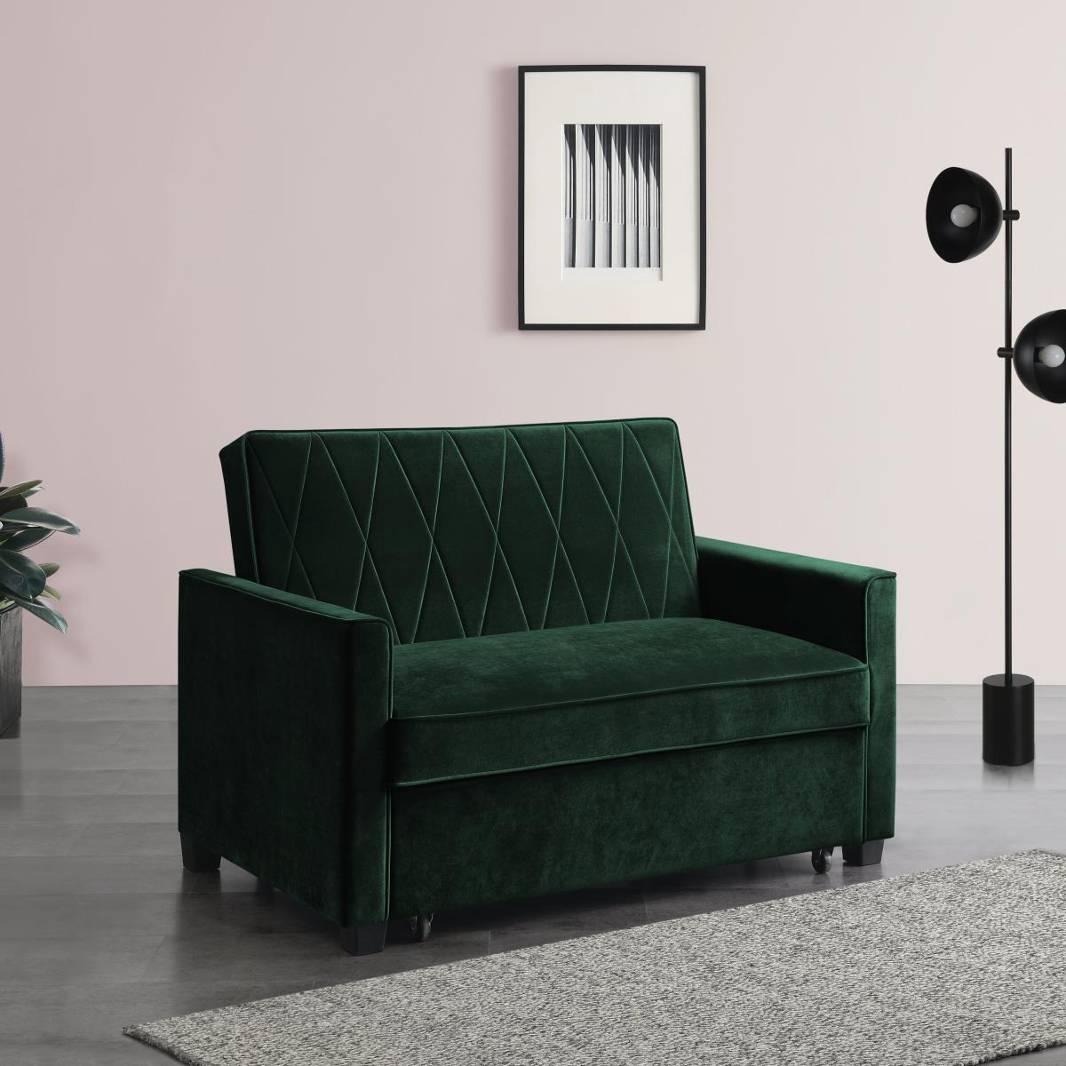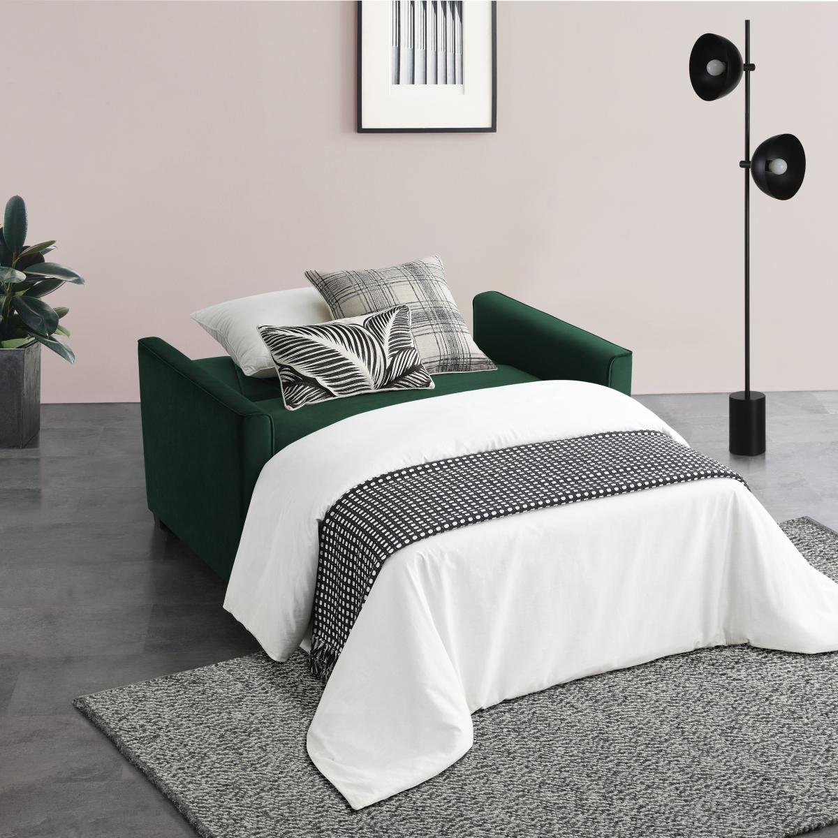 * Modern, Velvet Sofa Bed * 2 Seater Sofa, Double Mattress * Foam Filled Cushion * Full Assembly Required This sofa bed is not only multi-functional, serving as both a sofa and a bed, but also add a special touch to any living space. The seat padding, made with impressive 5cm foam, offers ultimate comfort, ensuring a good night's sleep or a cosy lounging experience. The combination of S springs and thick layers of foam provides a mattress-like feel, making them perfect for relaxation. With an easy-to-operate clic clac mechanism, these sofa beds are both practical and stylish, maximising limited space in your home.