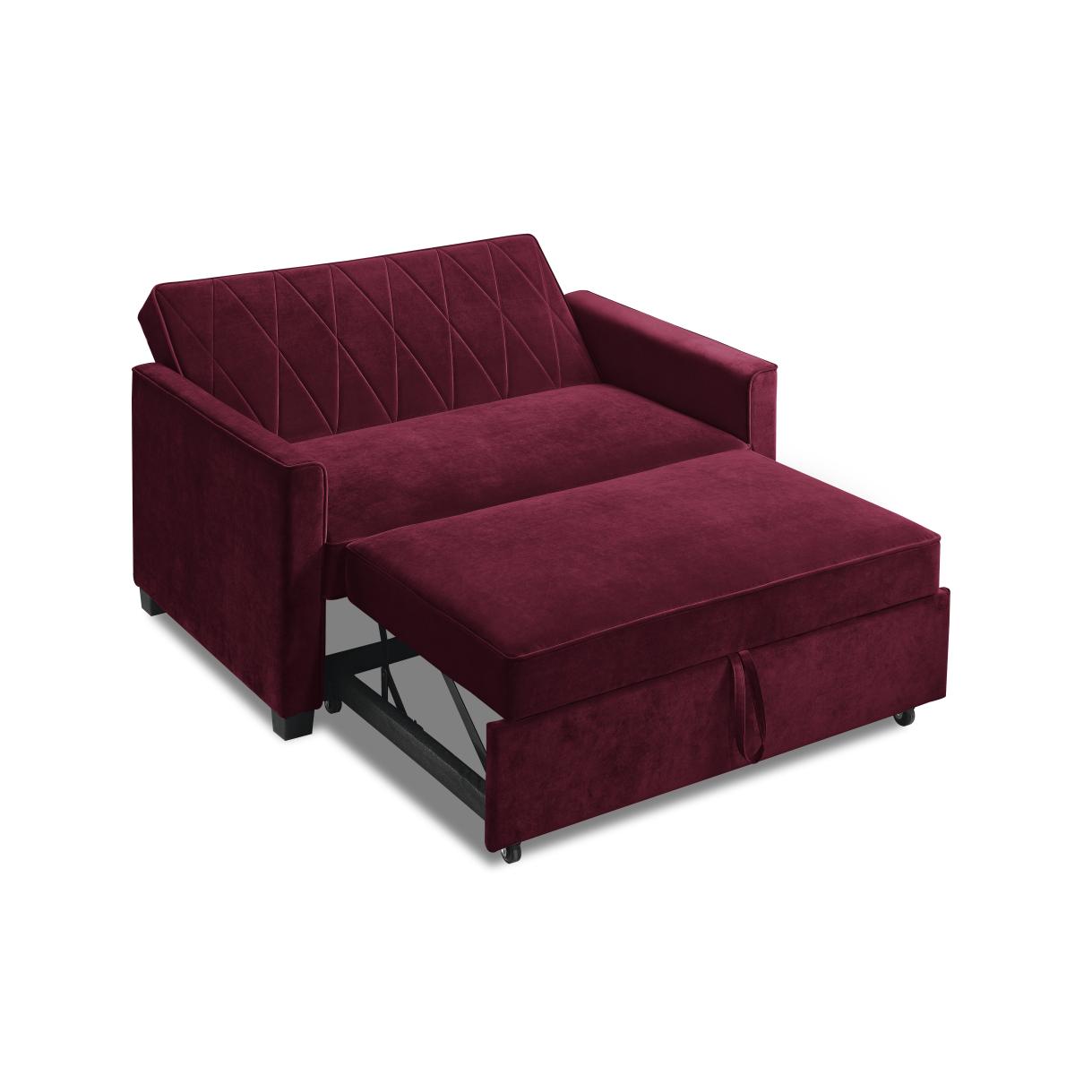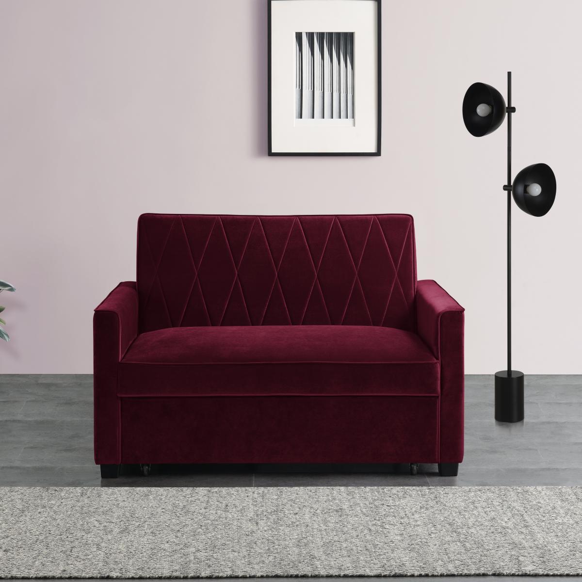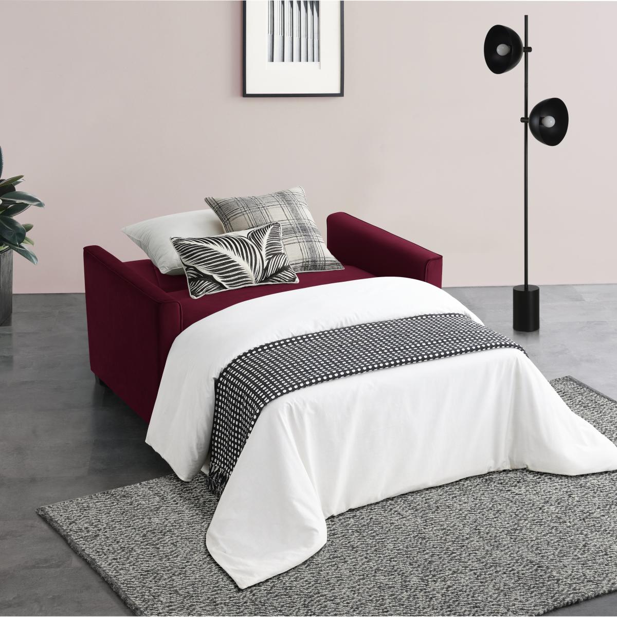 I love this velvet sofa bed in burgundy for its rich colour and plush texture, which can instantly add warmth and sophistication to a living space. It works particularly well in eclectic, contemporary, or luxe interiors, where bold colours and tactile fabrics are celebrated. To style around it, pairing with neutral or monochrome accessories will allow the sofa to become a statement piece, while adding cushions with varied textures or patterns can create visual interest. Practical tips include choosing minimalist accent furniture to balance the opulence of the velvet, and layering soft throws or blankets for comfort and a cosy feel when used as a bed. This piece is versatile, easily transitioning between day and night functions while bringing a touch of glamour to any room.