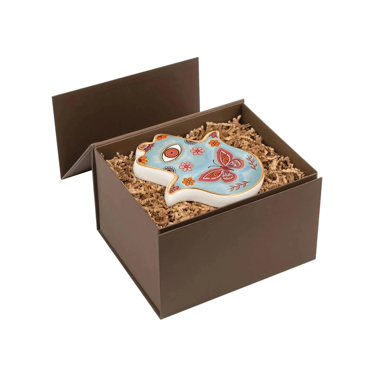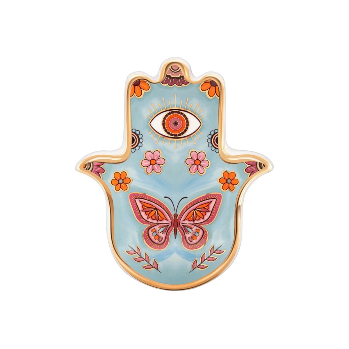Allow your mind to be as calm as the blue sky, watching each thought as it floats effortlessly away on the puffy, white clouds. Master the art of detachment with the loving support of this ceramic wall decoration. Designed in the shape of the Hamsa Hand, it keeps you and your loved ones protected, while also channeling the intuitive energy of the Evil Eye and the transformative nature of the Butterfly. Hang the “Serene Mindscape Hamsa Wall Blessing” in any room to amplify the peace.