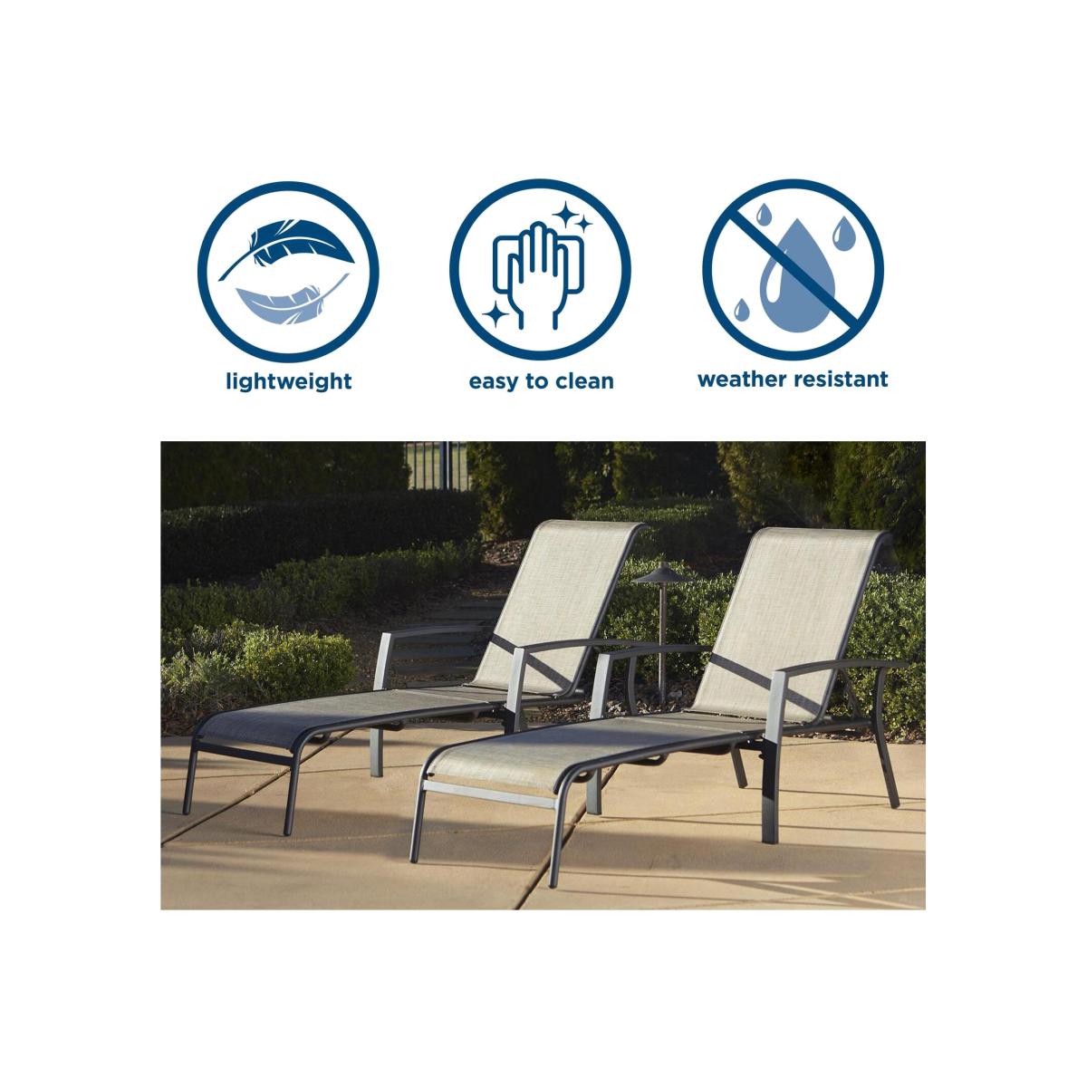 The Cosco Outdoor Living Serene Ridge aluminum chaise lounge chair patio furniture set, with armrests, are constructed with a heavy-duty powder-coated aluminum frame. The 2 pack of lounges are wrapped in a weather-resistant and breathable mesh, allowing for air flow on those muggy days of summer. Both the frame and the fabric are durable and will last while being easy to clean and maintain. The seat back adjusts easily to recline in multiple lounge positions. Manufactured with durable, weather-resistant materials, our furniture is built to last and to impress.