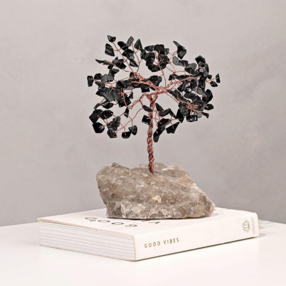 * Genuine black tourmaline crystals * Twisted metal tree * Grey quartz base Enhance your surroundings with the Serenity Black Tourmaline Gemstone Tree, a truly stunning decorative piece. This small tree features a twined copper-pink metal trunk and branches, elegantly adorned with 120 genuine black tourmaline crystals. Resting on a white quartz base, it's more than just a beautiful ornament; it's also believed to invite positive energy into your home.