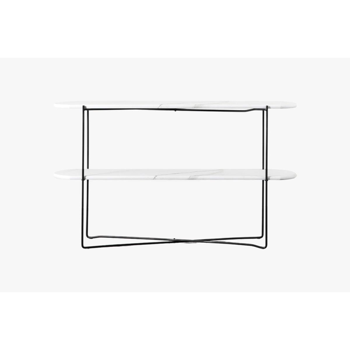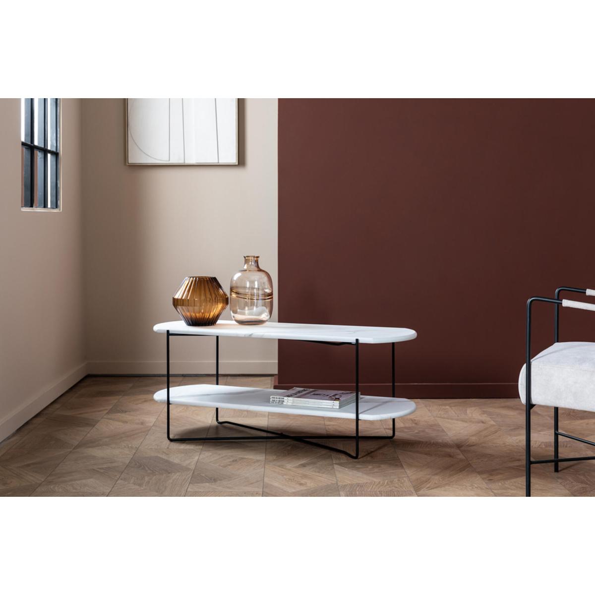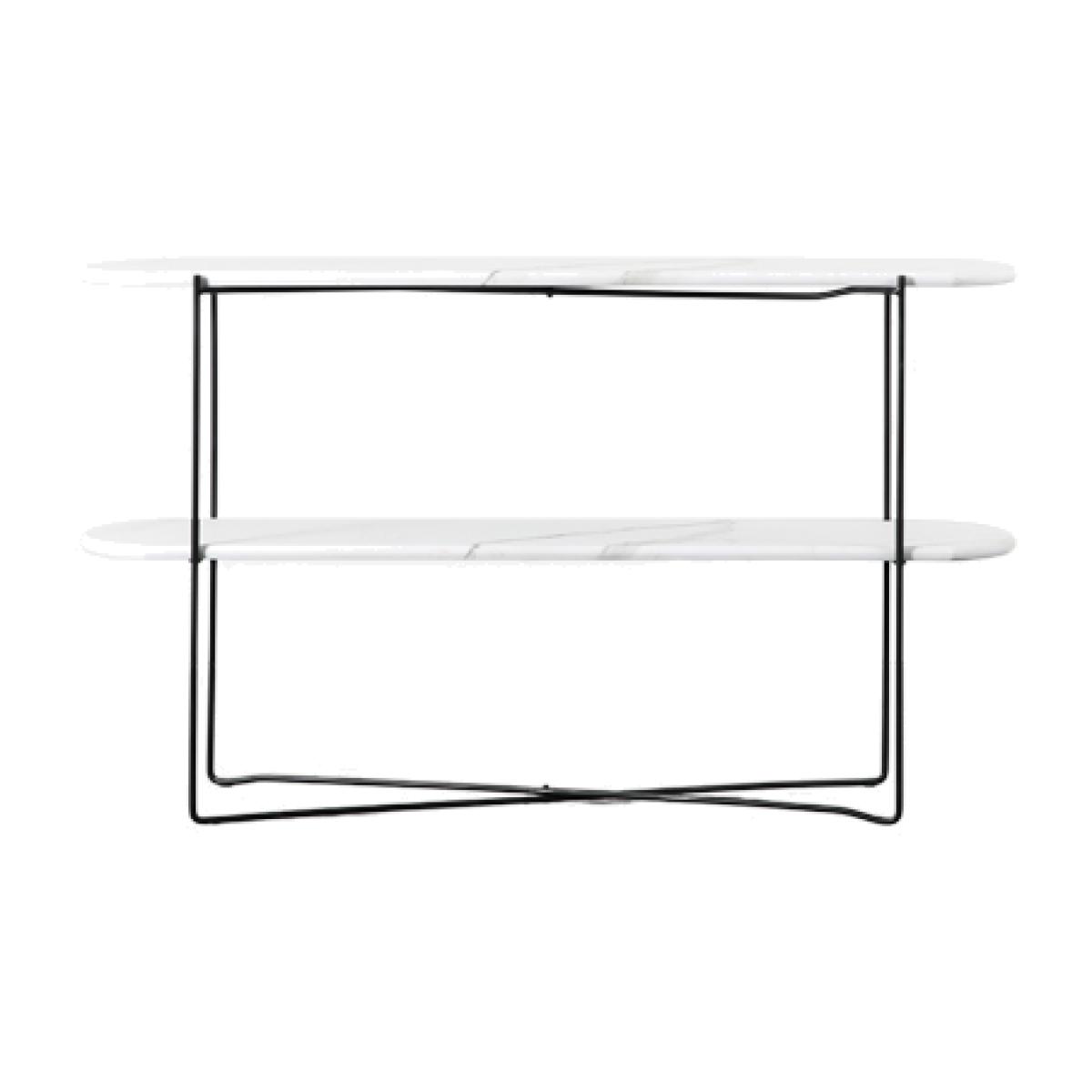 We can’t help but admire marble and it’s cool presence within a space - simple, clean and serene! The faux white marble on this uniquely shaped and shelved console table pairs beautifully with the black metal base. Packed flat for easy delivery to any room, with all the tools supplied for easy assembly.