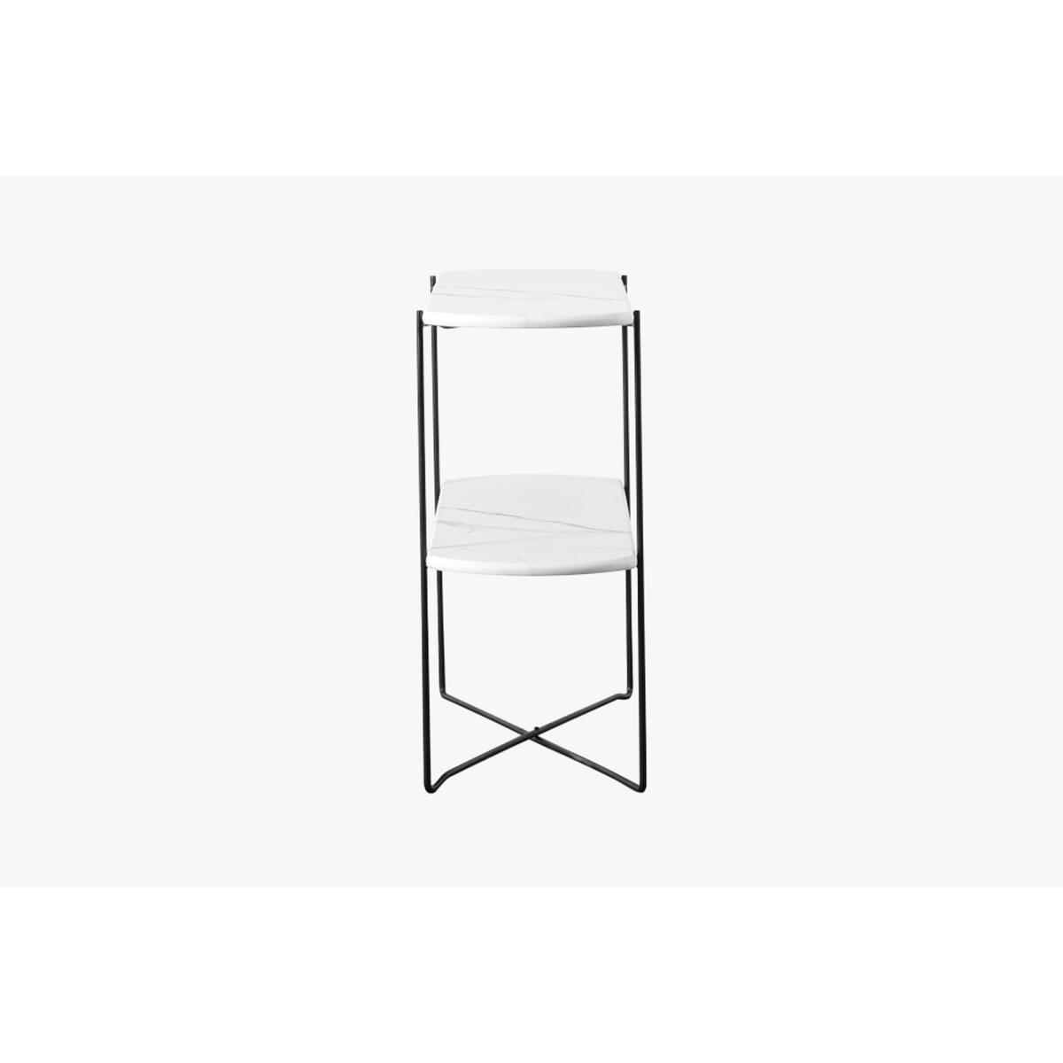 I’m a big fan of this marble-effect console for its slim black metal frame and clean white shelves - it instantly lifts a hallway or behind-sofa spot without feeling bulky. Its simplified lines sit equally well in a Scandi-inspired living room, a pared-back industrial loft or even a modern country pad. For practical styling, work in layers: on the top shelf, position a low mirror or artwork off-centre, then balance it with a sculptural vase and a couple of coffee-table books. Use the lower tier for a woven basket to tuck away scarves or small throws, or display a set of matching pots with trailing greenery.