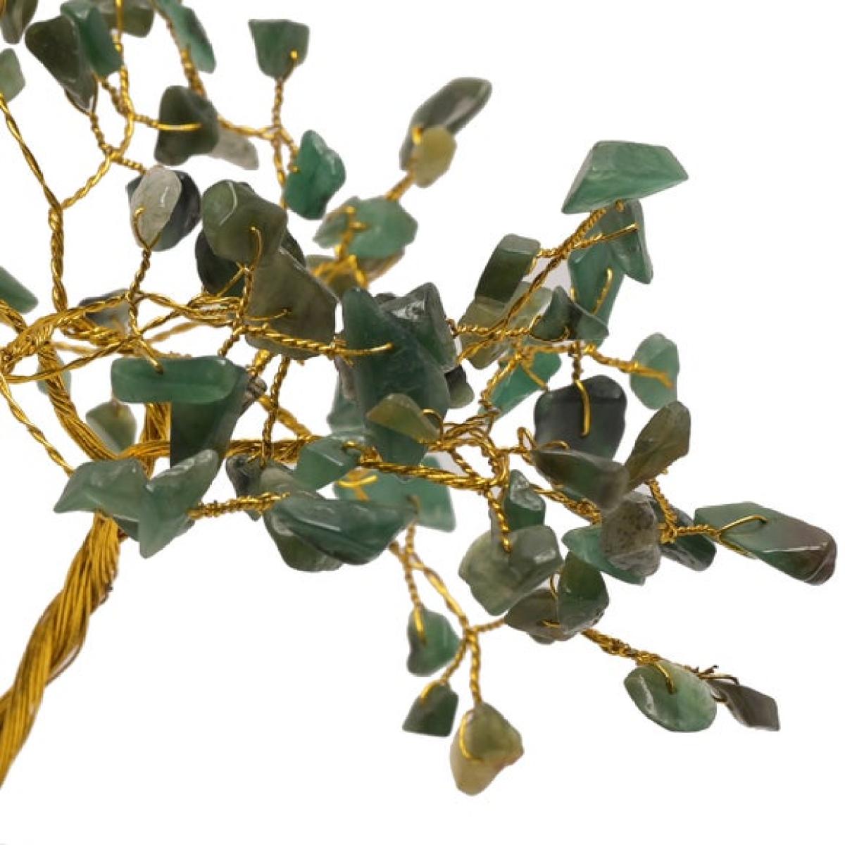 * Genuine green adventurine crystals * Choice of small or large sizes * Invites positive energy into your home * Twisted metal tree * Grey quartz base Enhance your surroundings with the Serenity 'Luck' Green Gemstone Tree. This beautiful tree features a twined gold metal trunk and branches, adorned with 500 or 100 genuine matching glazed glass crystals depending on the size. It's more than just a stunning ornament; it's also believed to bring positive energy, making it a perfect addition to any home.