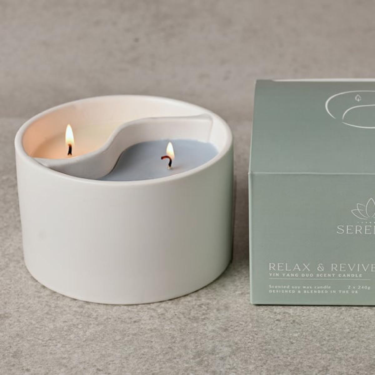 * Ceramic candle vessel * Relax & Revive fragrances * Long-lasting, soothing aroma * Elegant design for any room * Ideal for relaxation routines The Serenity Yin Yang Relax & Revive Ceramic Candle pairs calming notes with uplifting tones for a balanced sensory experience. Its refined ceramic design makes it a stylish addition to any space, offering hours of soothing fragrance. Relax: Rose, cardamon and pink pepper. Revive: Orange blossom, jasmine and saffron