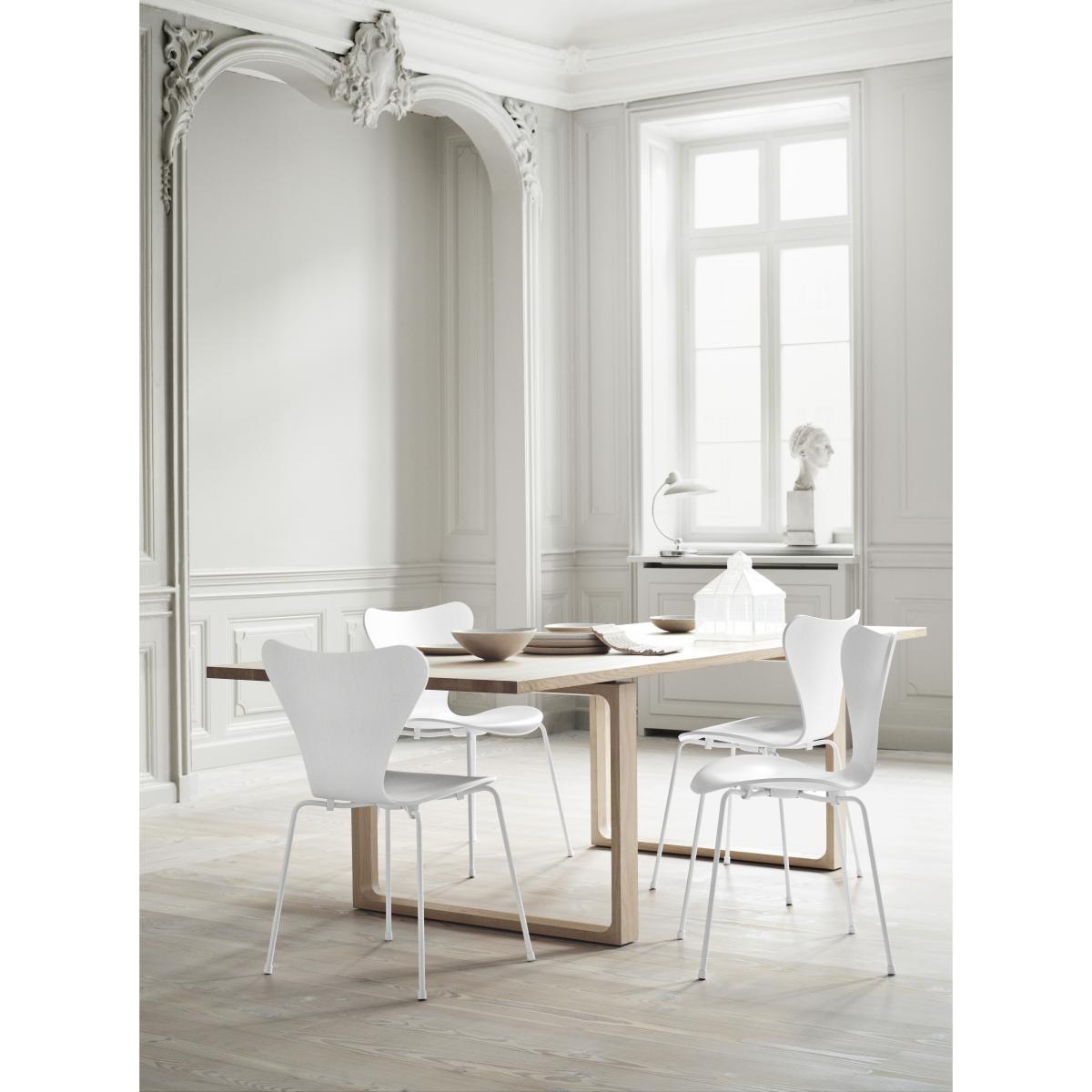 Access the design legend with this re-issue of a timeless, iconic chair: the famous "Series 7" chair. Certainly the best selling chair in the world, the Series 7 chair has often been copied but never rivalled. Fritz hansen reissued the original version, designed in 1955 by the famous Danish creator and designer Arne Jacobsen. "Series 7" is a practical, light, comfortable and stackable chair, designed to adapt to all kinds of environments: kitchens and dining rooms of course, but also restaurants, cafés and conference rooms, etc. Very innovative for its period, this chair is made up of a seat and a backrest in a single piece: a moulded plywood shell. This chair perfectly illustrates the work of Arne Jacobsen, one of the most emblematic designers of the Scandinavian functionalist movement. Its design is at once paired-down, practical and organic with an incredible fluidity in the lines. Arne Jacobsen's creations have really laid the foundations of Scandinavian organic modernism. This design is characterised by ample and round forms which favour the idea of comfort. A real design icon, the Series 7 chair still appeals to design fans all over the world today! The Series 7 has become a classic of Scandinavian design, reducing the back and seat to a single piece of moulded plywood on steel tubular legs. The Series 7 chair is incredibly light (only 4 kg) but extremely durable, too. The Series 7 is a chair that is passed down the generations: basically, it’s immortal. The timeless design of the Series 7 will continue to stand the test of time. Its vintage style will always look sensational! This chair has a seat and a backrest made from moulded ash plywood, combined with a steel tubular base. The Series 7 chair is available in a variety of versions.