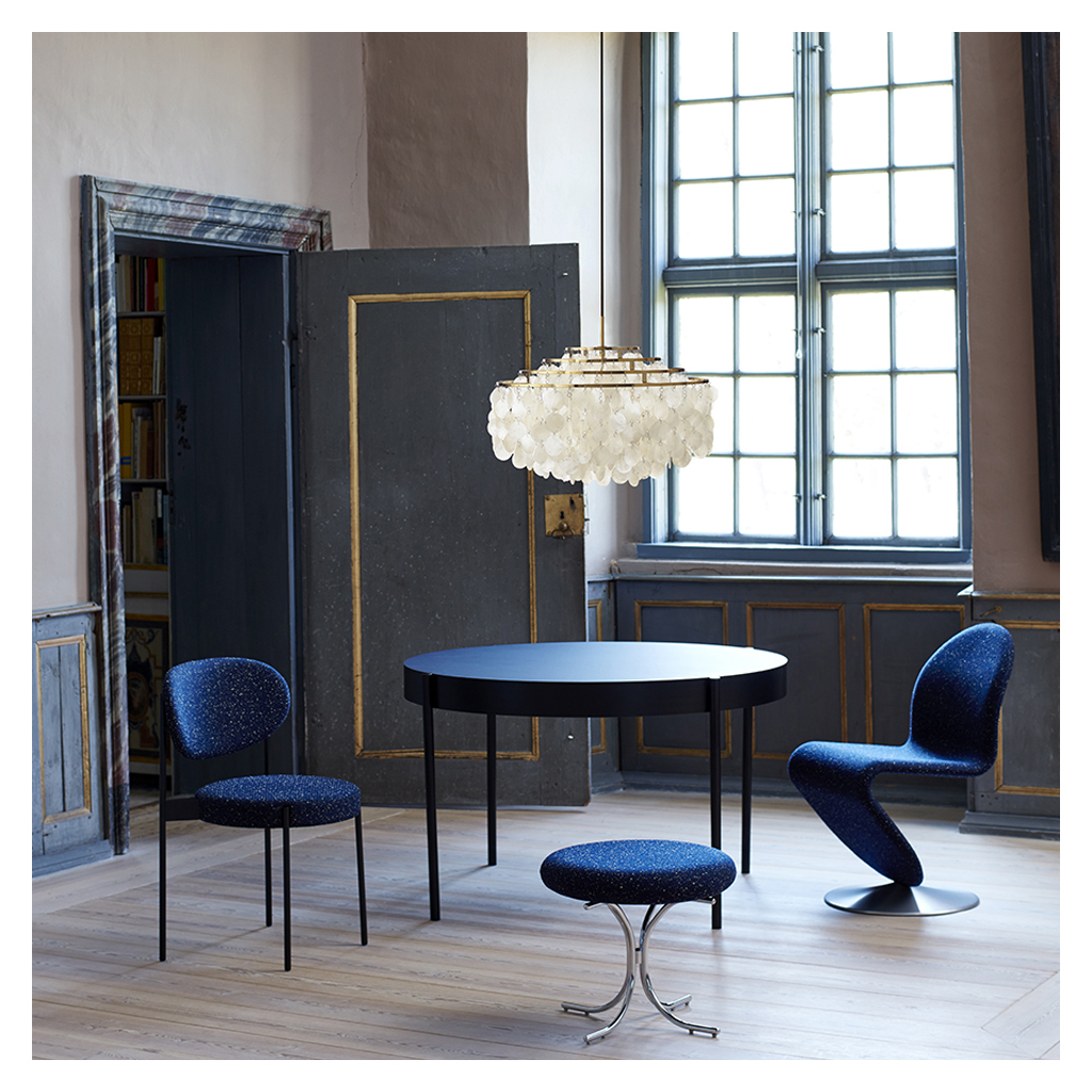Originally created by Danish designer Verner Panton in 1967 and re-issued by Verpan, the modern, lightweight Series 430 Chair is upholstered with Kvadrat's striking Pilot upholstery to exacting standards. A versatile stacking chair perfect for everywhere from dining tables to workspaces, the Series 430 Chair was Panton's first four-legged chair design and showcases a fully upholstered back and seat accented with distinctive fabric. Its circular seat is crafted on a form-pressed wooden ring, supported by interwoven elastic straps that ensure soft comfort and gentle support for any sitter. Crafted in the same way since its inception, Verpan has ensured that subtle detailing brings the Series 430 Chair into the 21st century, with double-tubing and leg-caps to protect flooring and offer inimitable strength and stability. Designed by Raf Simons for Kvadrat, Pilot upholstery is composed of 82% new wool in a beautiful weave for a sustainable and soft finish to the Series 430 Chair.
