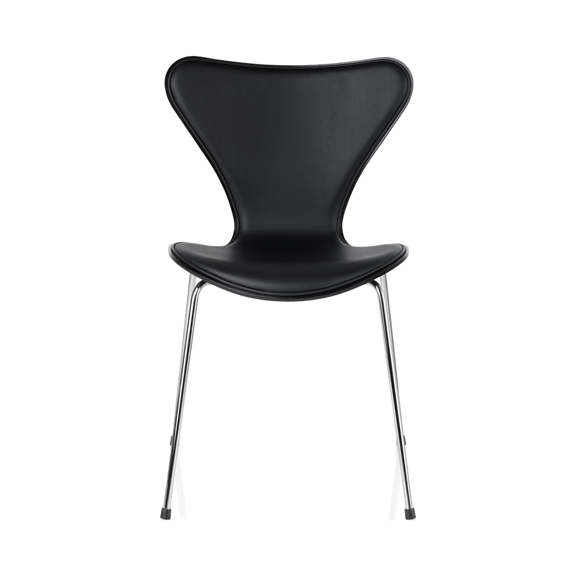 Enhance your interior with the striking silhouette of the Essential leather-fronted black Series 7 Chair, designed in 1955 by Arne Jacobsen and crafted by prestigious manufacturer, Fritz Hansen. The Series 7 Chair showcases one of the most iconic silhouettes in furniture history, with its signature curved backrest an instantly recognisable feature of Modernist mid-century furniture design. Fritz Hansen's bestselling chair, the composition of the Series 7 represents the culmination of the then revolutionary lamination technique, with its pressure moulded plywood frame crafted to showcase the many possibilities of lamination and upholstered in supple Essential black leather for a timeless finish. Elevated on stackable chromed steel legs, and available in a variety of finishes, the Series 7 3107 Chair with black Essential leather upholstery remains a timeless example of Modernist furniture design. View our entire range of furniture and lighting from Arne Jacobsen