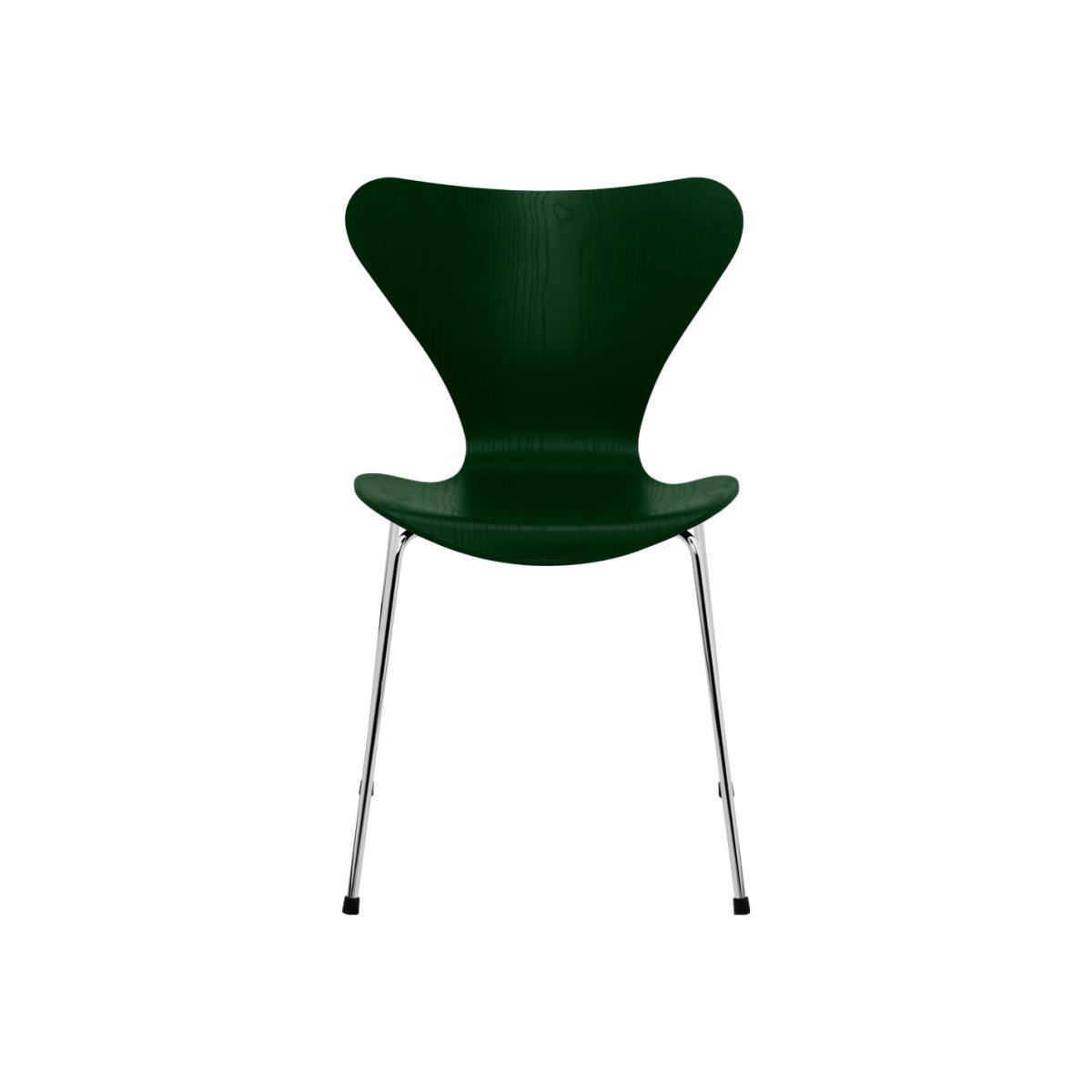 Enhance your interior with the striking silhouette of the Series 7 Chair in coloured ash with a chrome base, designed in 1955 by Arne Jacobsen and produced by prestigious manufacturer, Fritz Hansen. Also known as the 3107 Chair, the Series 7 Chair showcases one of the most iconic silhouettes in furniture history. With its signature curved backrest, the chair has become an instantly recognisable feature of modernist mid-century furniture design. Fritz Hansen's bestselling chair, the composition of the Series 7 represents the culmination of the then-revolutionary lamination technique, with its pressure moulded ash plywood frame crafted to showcase the many possibilities of the lamination process. Elevated on stackable, chrome-plated steel legs and available in multiple colour finishes, the Series 7 Chair remains a timeless example of Modernist furniture design.