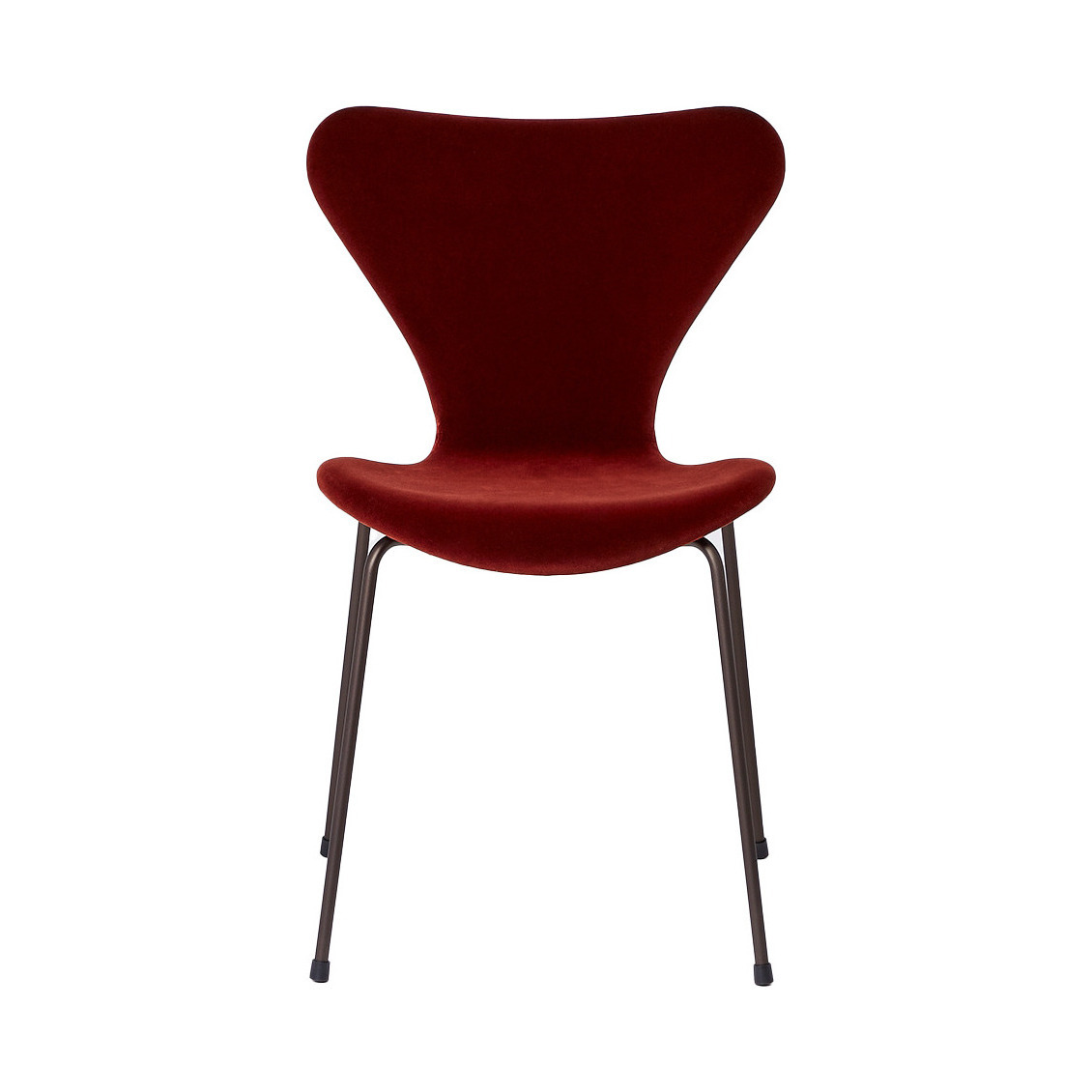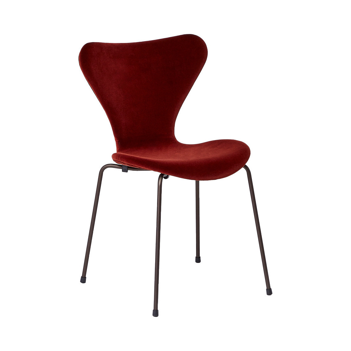 Upholstered in luxurious red-hued velvet, Fritz Hansen presents a romantic twist on the modernist mid-century classic Series 7 3107 chair by Danish visionary Arne Jacobsen. Elevated on stackable, powder-coated bronze legs, the fine Italian velvet seat will add a soft, elegant touch to contemporary décors. With its iconic silhouette and signature curved backrest, the Series 7 3107 Chair an instantly recognisable piece of furniture history. The esteemed manufacturer's bestselling chair, its composition represents the culmination of the then-revolutionary lamination technique, with a pressure moulded plywood frame crafted to showcase the many possibilities of the lamination process. Care instructions: Please smooth the velvet with a clean, cotton cloth. When stacking multiple chairs, we recommend you place cardboard between the chairs, as stacking may damage the velvet.