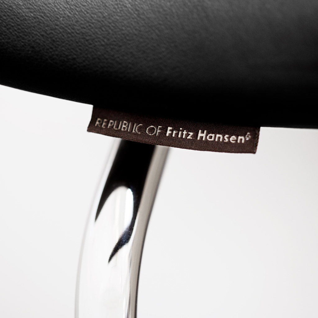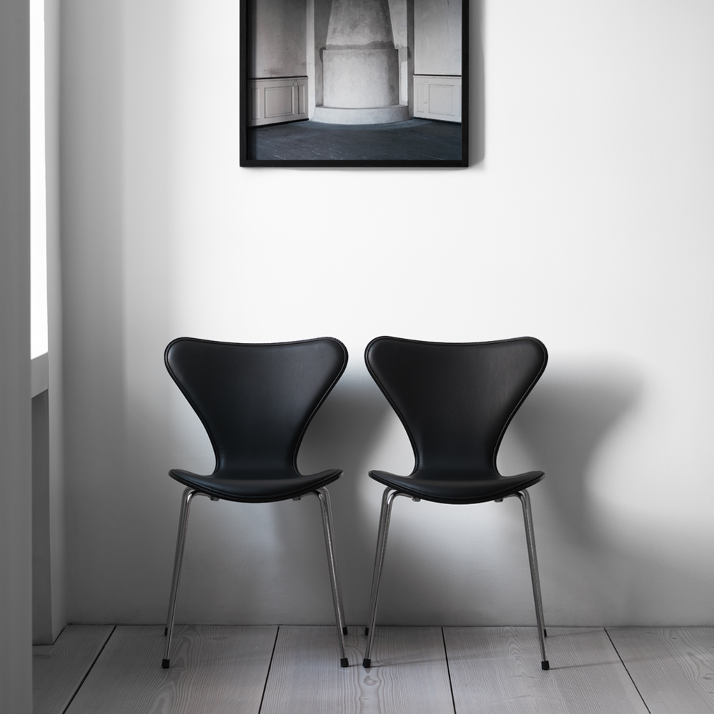 Enhance your interior with the striking silhouette of the Soft leather-fronted black Series 7 Chair, designed in 1955 by Arne Jacobsen and crafted by prestigious manufacturer, Fritz Hansen. The Series 7 Chair showcases one of the most iconic silhouettes in furniture history, with its signature curved backrest an instantly recognisable feature of Modernist mid-century furniture design. Fritz Hansen's bestselling chair, the composition of the Series 7 represents the culmination of the then-revolutionary lamination technique, with its pressure moulded plywood frame crafted to showcase the many possibilities of lamination and upholstered in supple Soft black leather for a timeless finish. Elevated on stackable chromed steel legs, and available in a variety of finishes, the Series 7 3107 Chair with black Soft leather upholstery remains a timeless example of Modernist furniture design.
