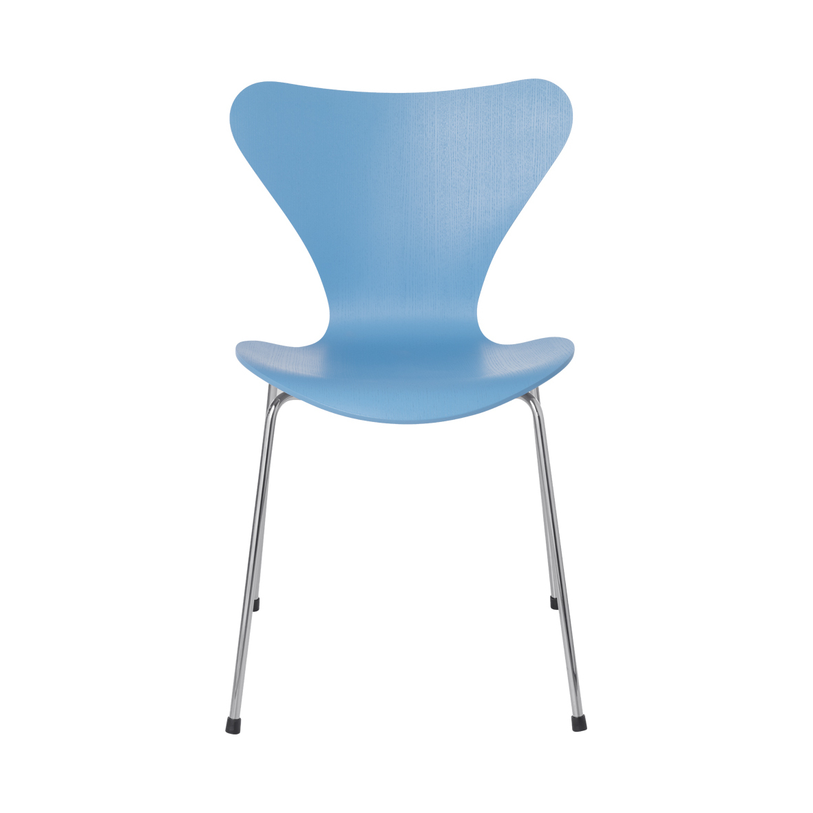 Enhance your interior with the striking silhouette of the Series 7 Chair in Trieste blue, designed in 1955 by Arne Jacobsen and produced by prestigious manufacturer, Fritz Hansen. Also known as the 3107 Chair, the Series 7 Chair showcases one of the most iconic silhouettes in furniture history. With its signature curved backrest, the chair has become an instantly recognisable feature of modernist mid-century furniture design. Fritz Hansen's bestselling chair, the composition of the Series 7 represents the culmination of the then revolutionary lamination technique, with its pressure moulded plywood frame crafted to showcase the many possibilities of lamination. Elevated on stackable, chrome-plated steel legs, and available in a variety of finishes, the Trieste Blue Series 7 - 3107 Chair remains a timeless example of Modernist furniture design.